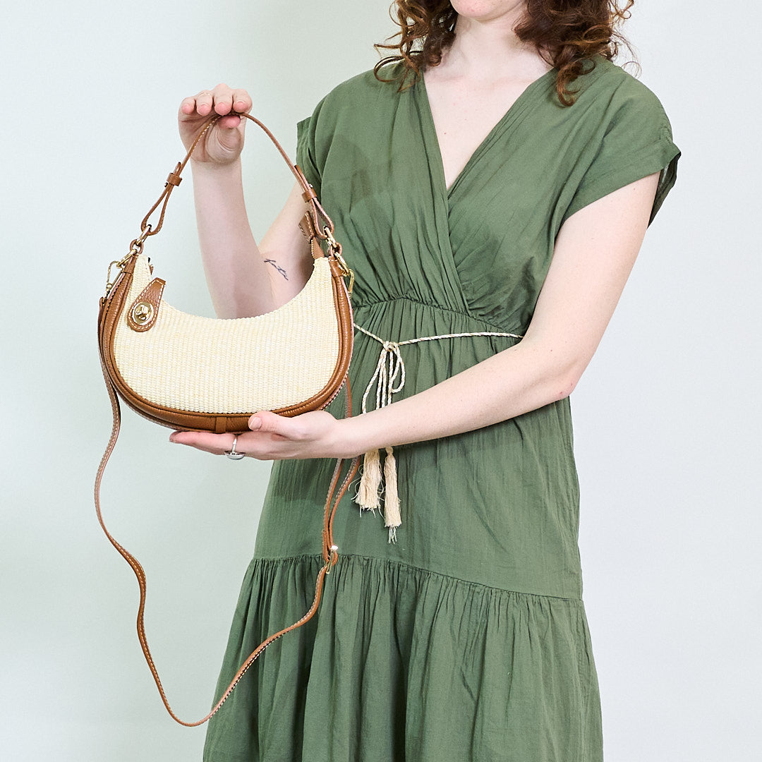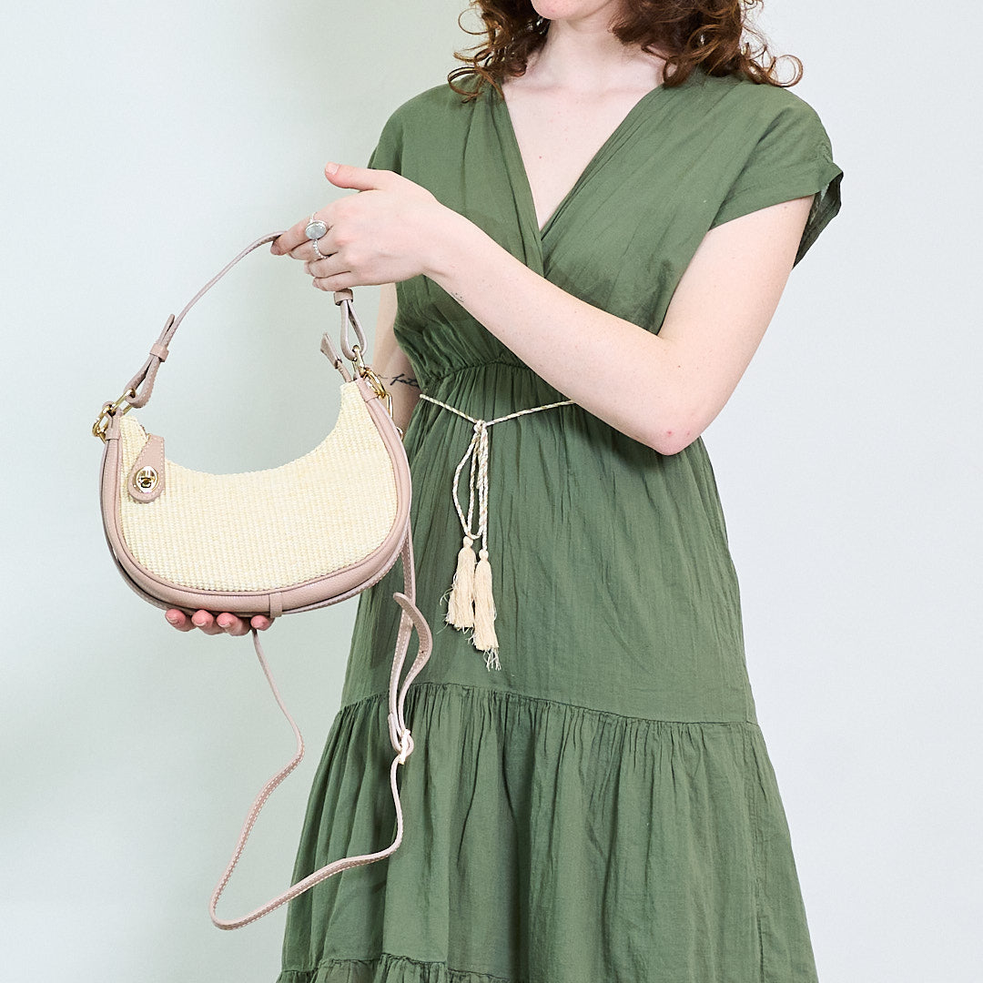 Vävd halvmåne axelväska med faux läder trim och guldton hårdvaru grossist
