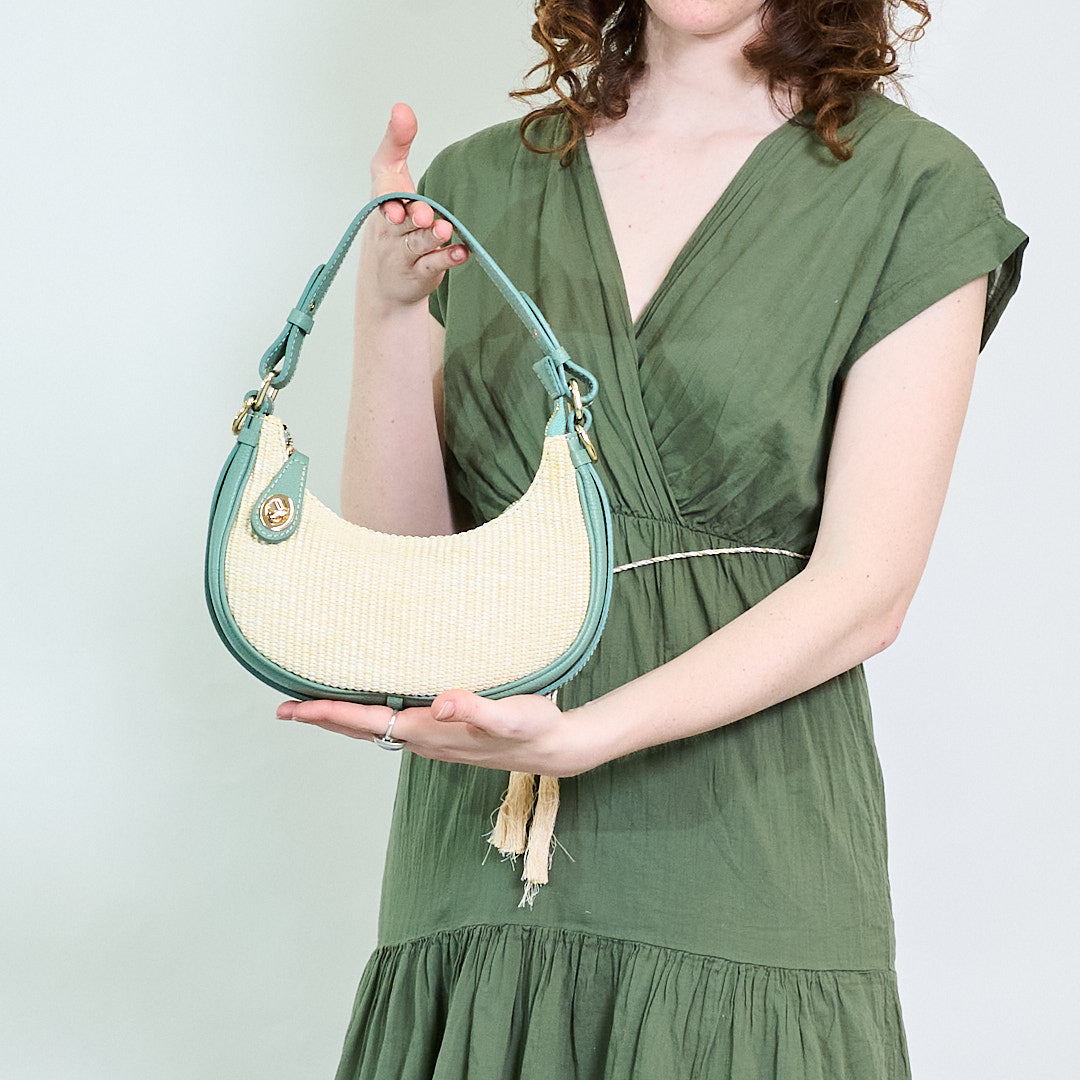 - Chic Crescent-formad axelväska med en strukturerad vävd kropp