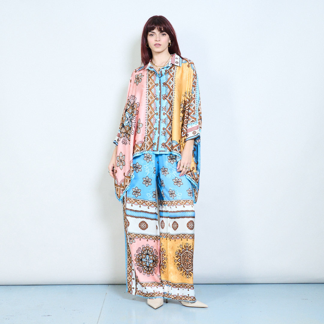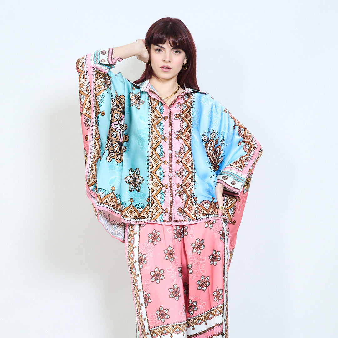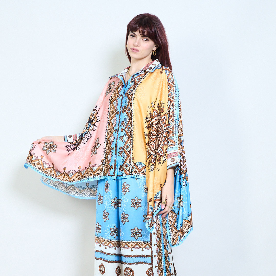 Blommig lapptäcke tryckt krage avslappnad blus grossist