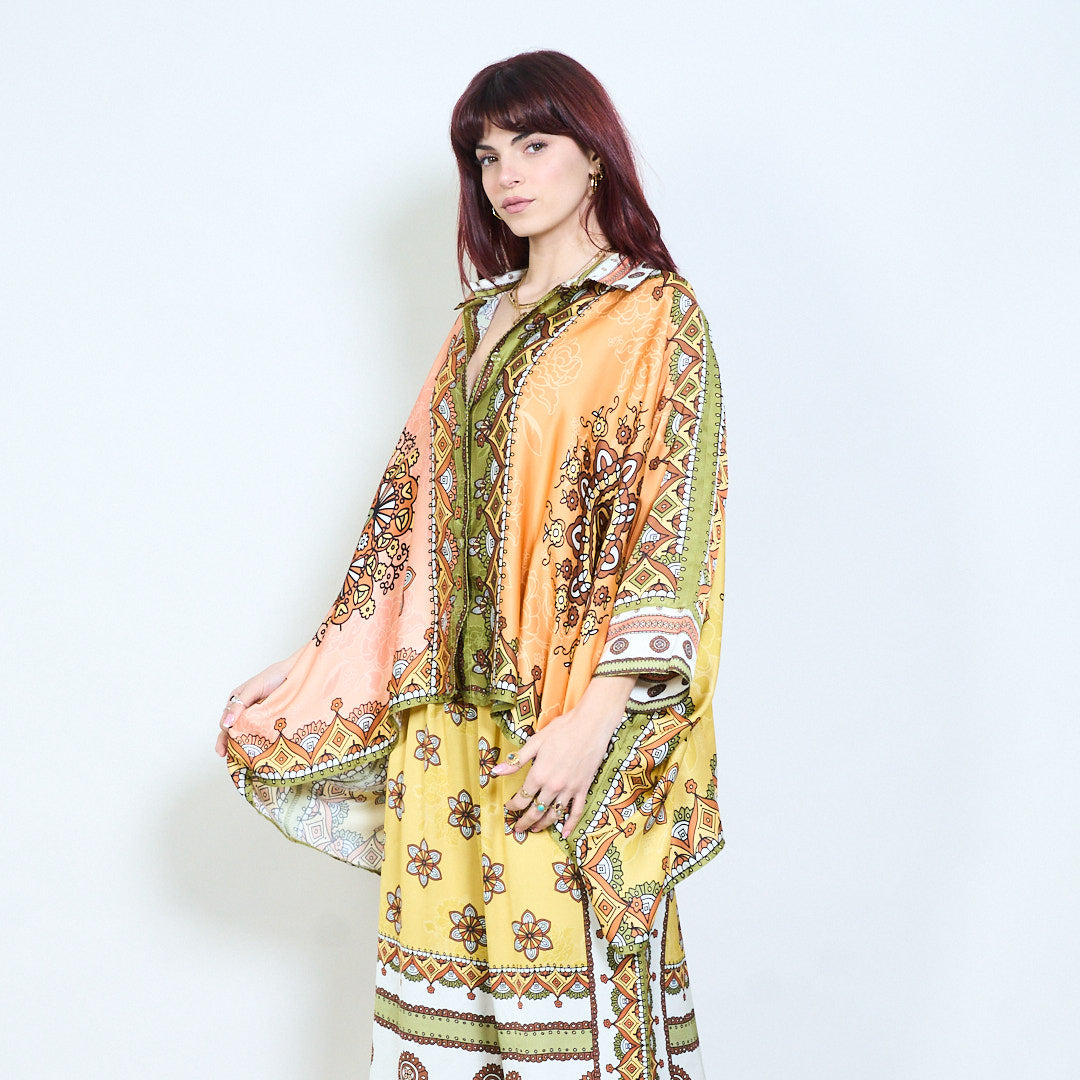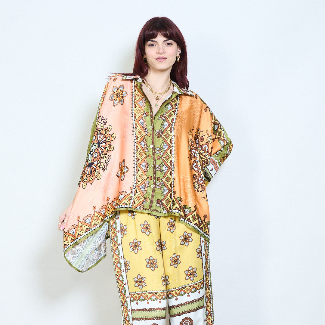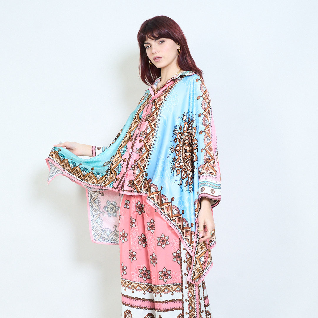 Blommig lapptäcke tryckt krage avslappnad blus grossist