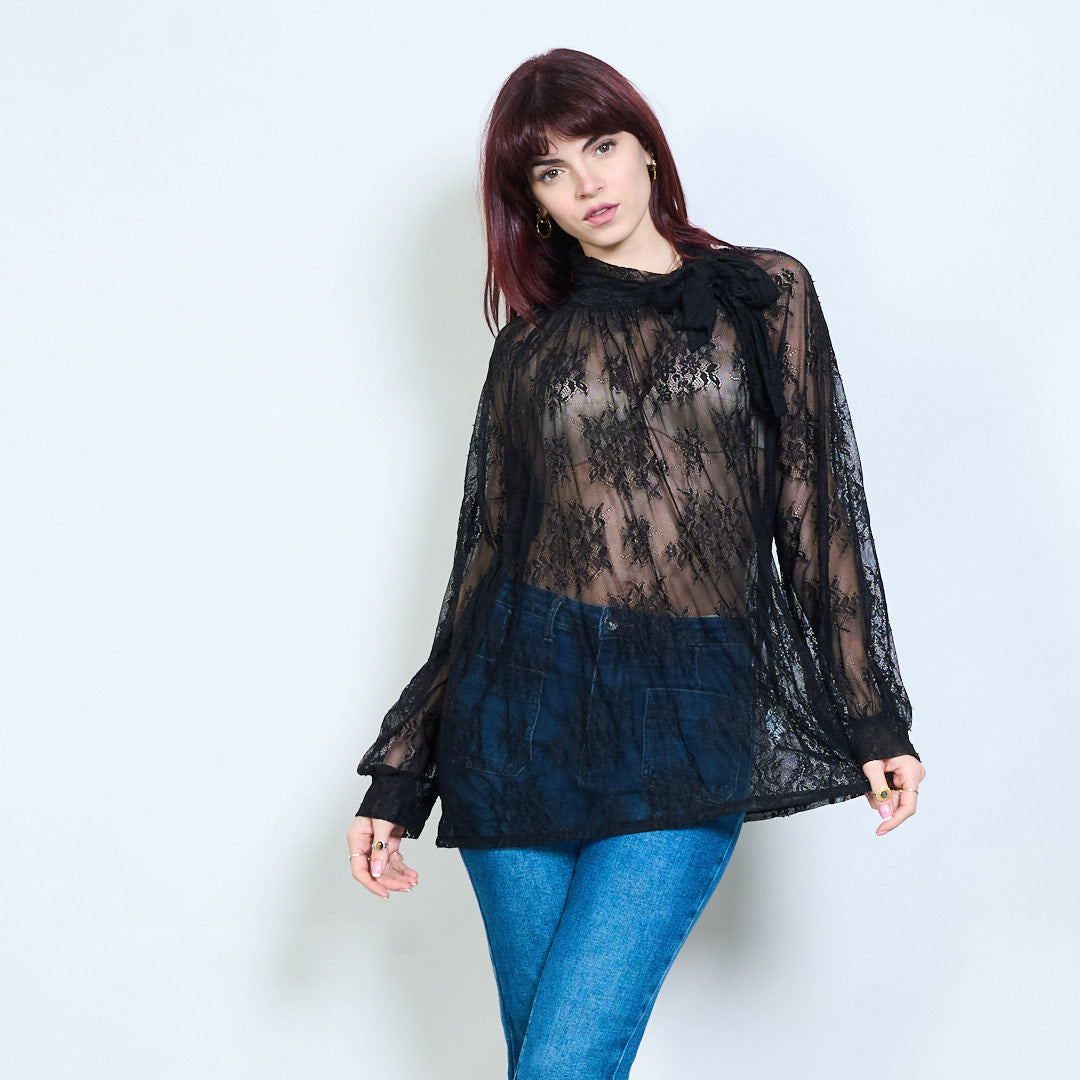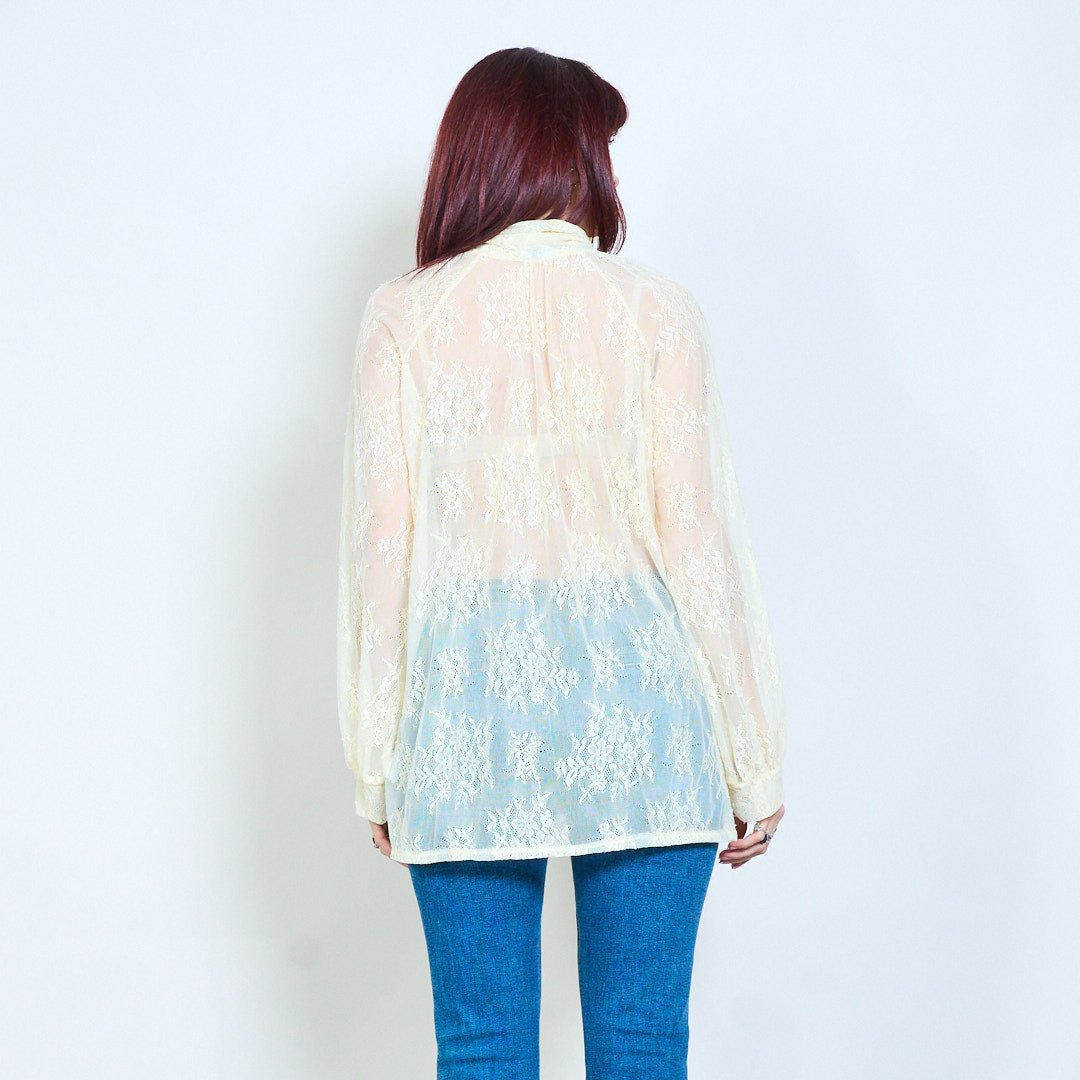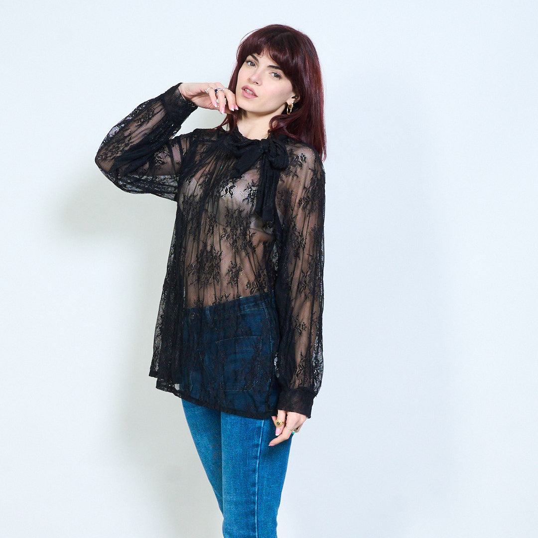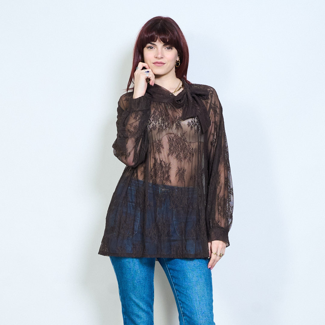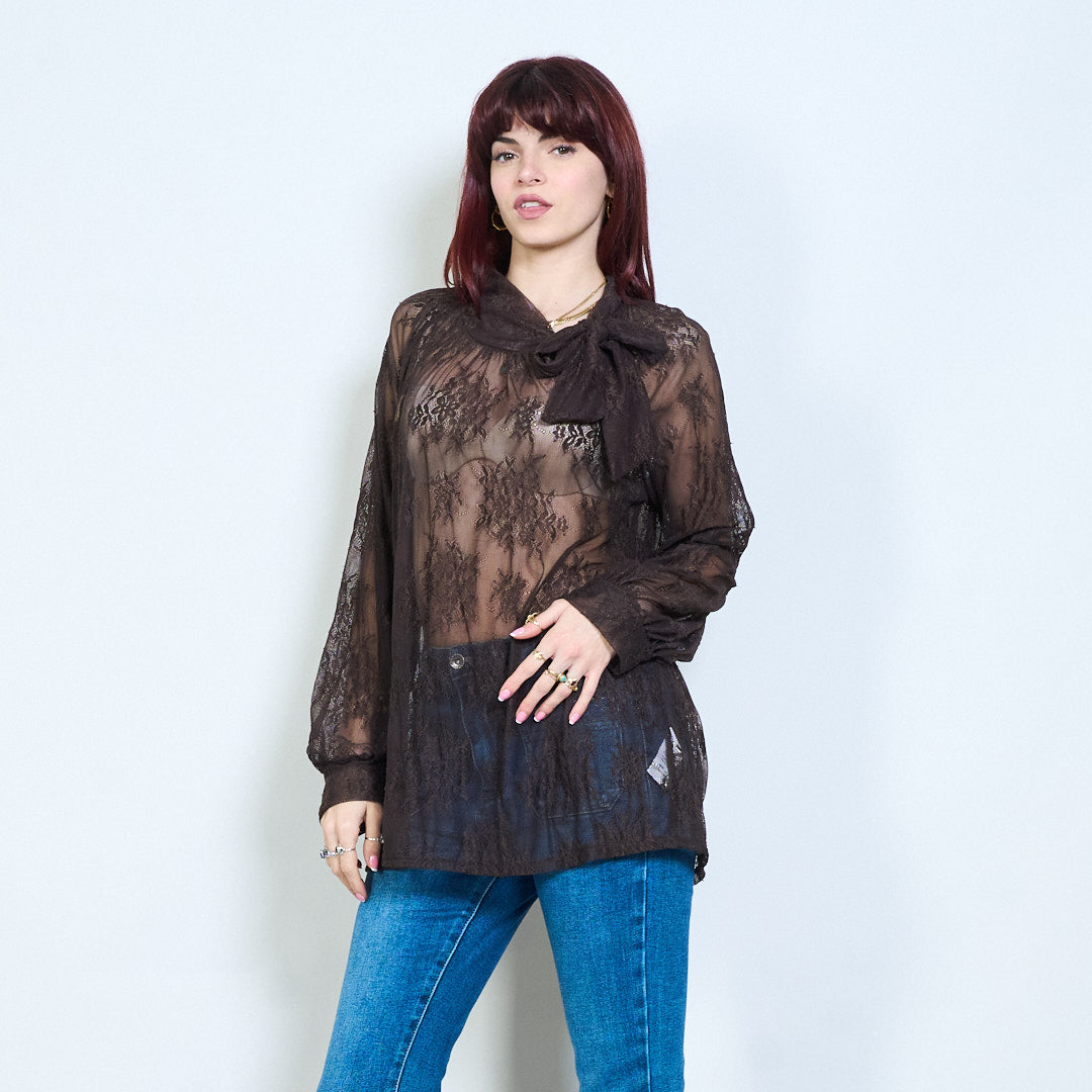 Blommig spets skir veckad tie hals långärmad blus grossist
