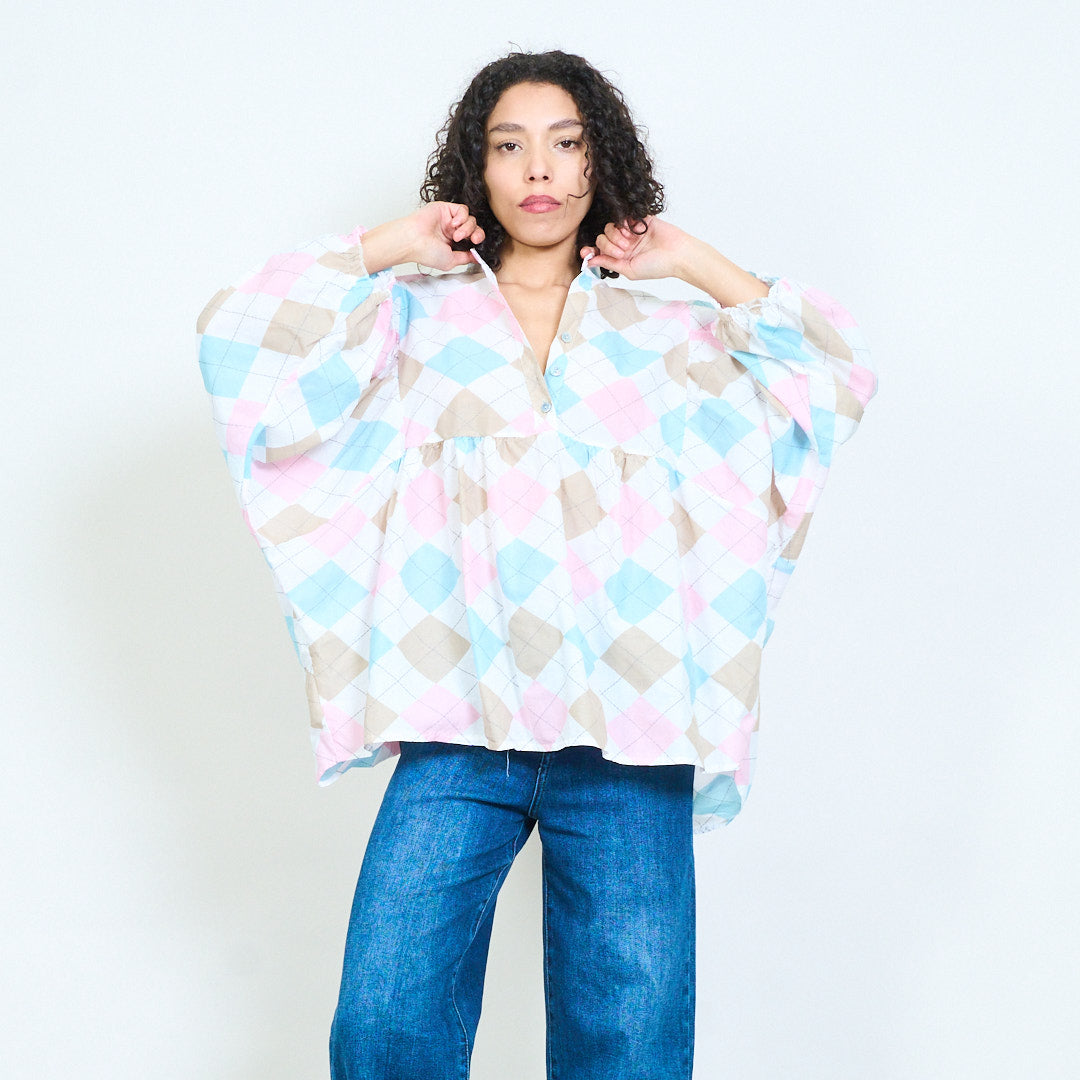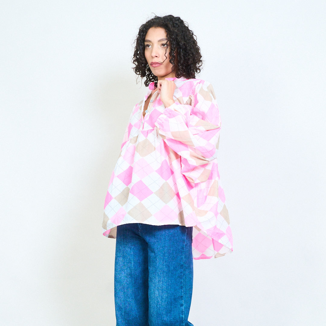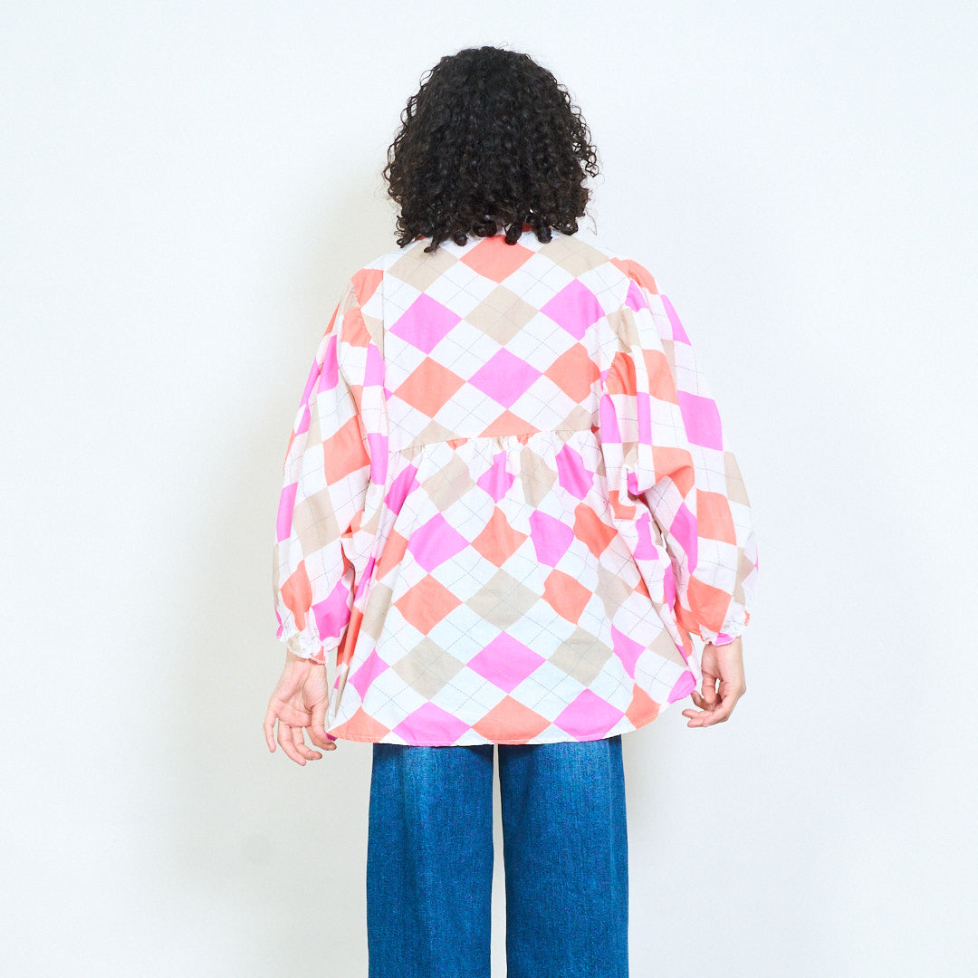 Argyle rutig knapp framtill långärmad blus i grossistledet