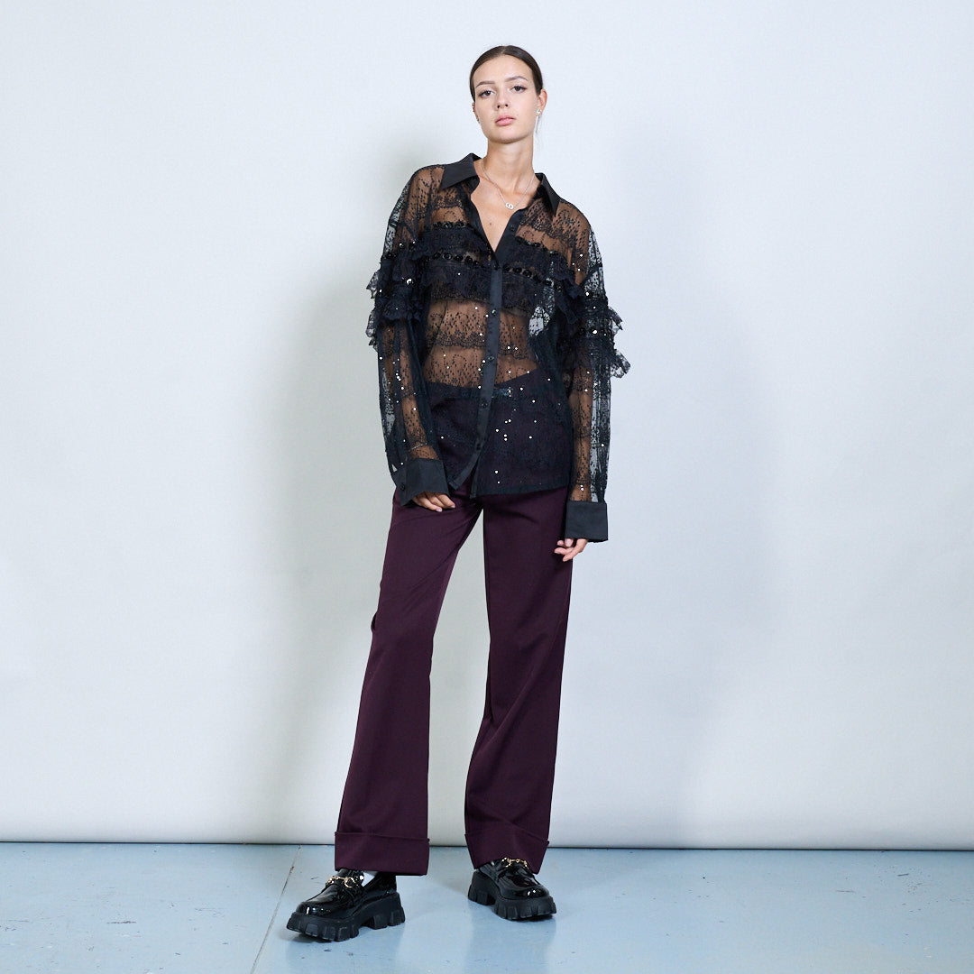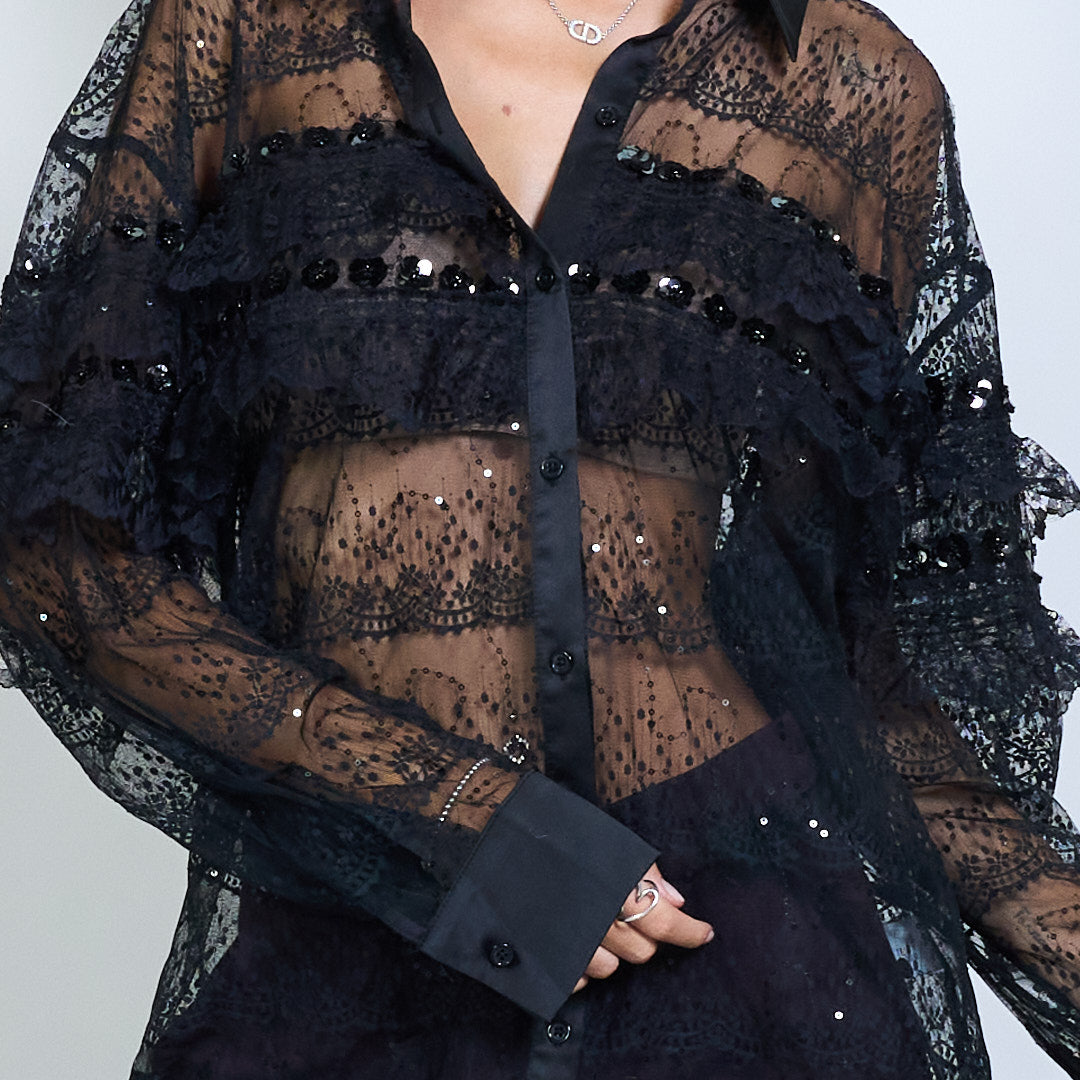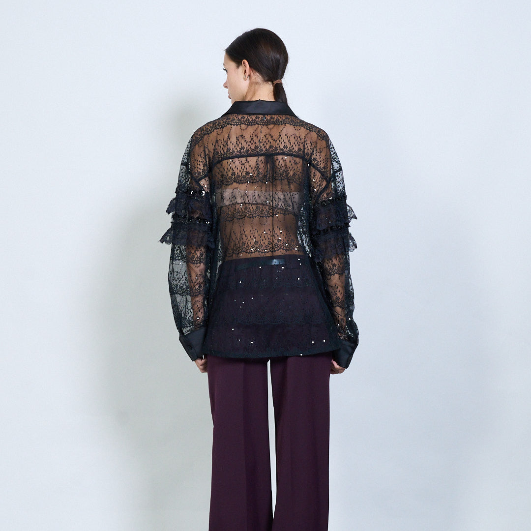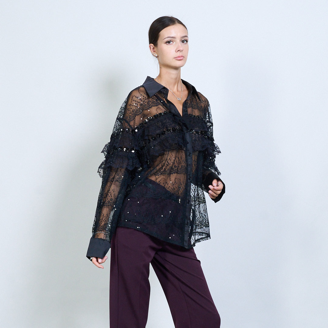Ren spetsblus med ruffle och paljettdetaljer grossist
