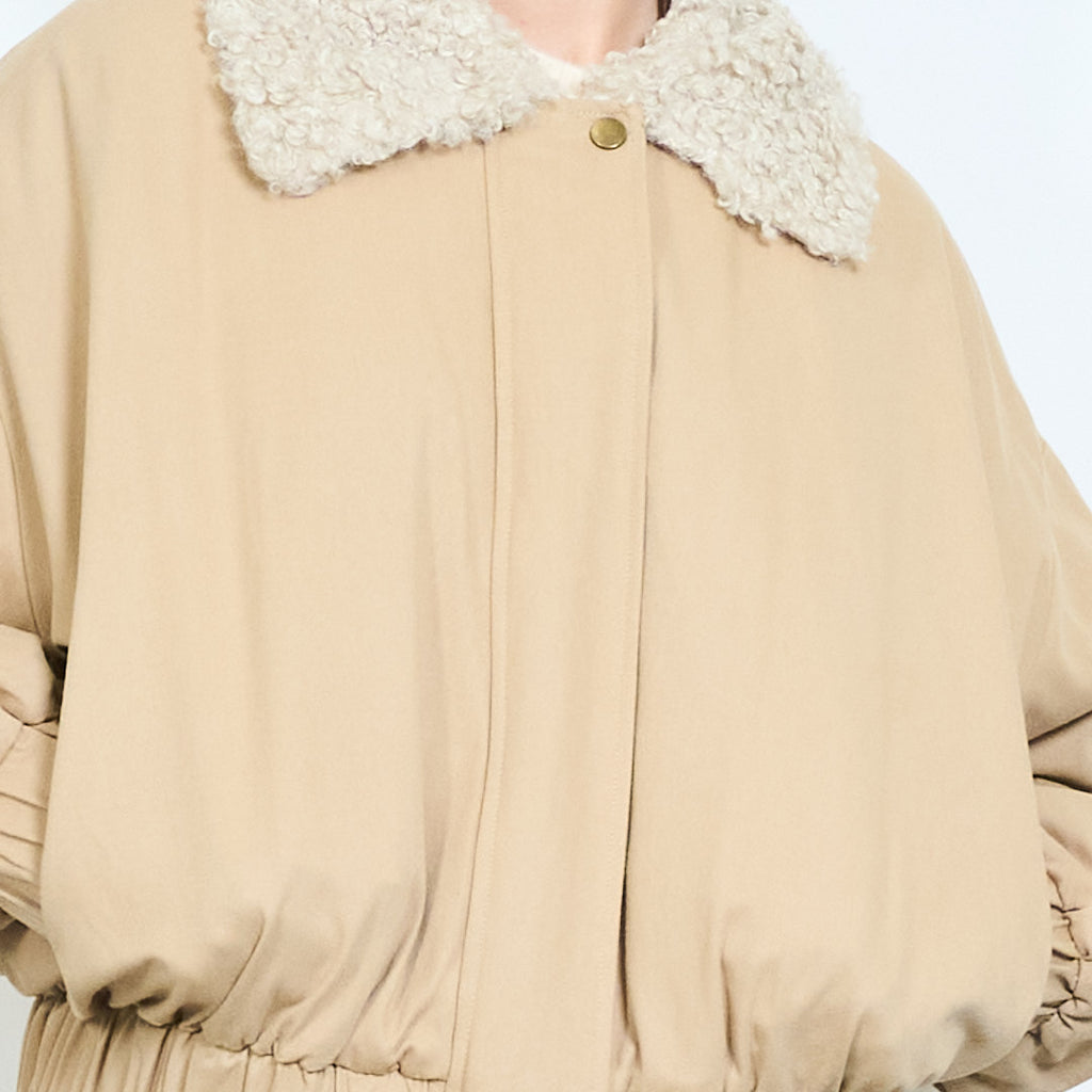 • Distinkt lockigt faux päls krage som lägger till struktur och vintage charm