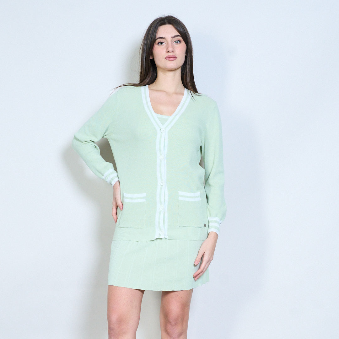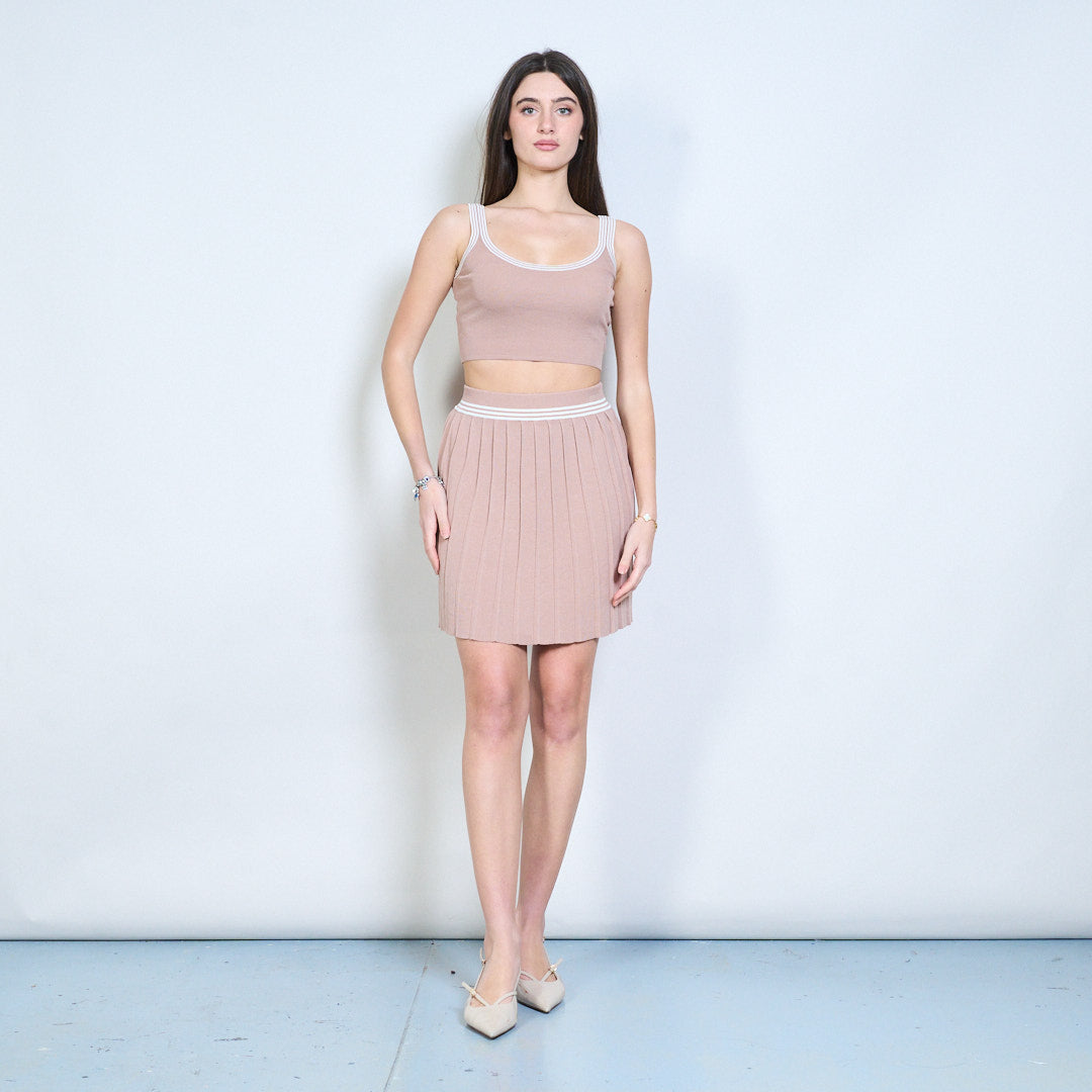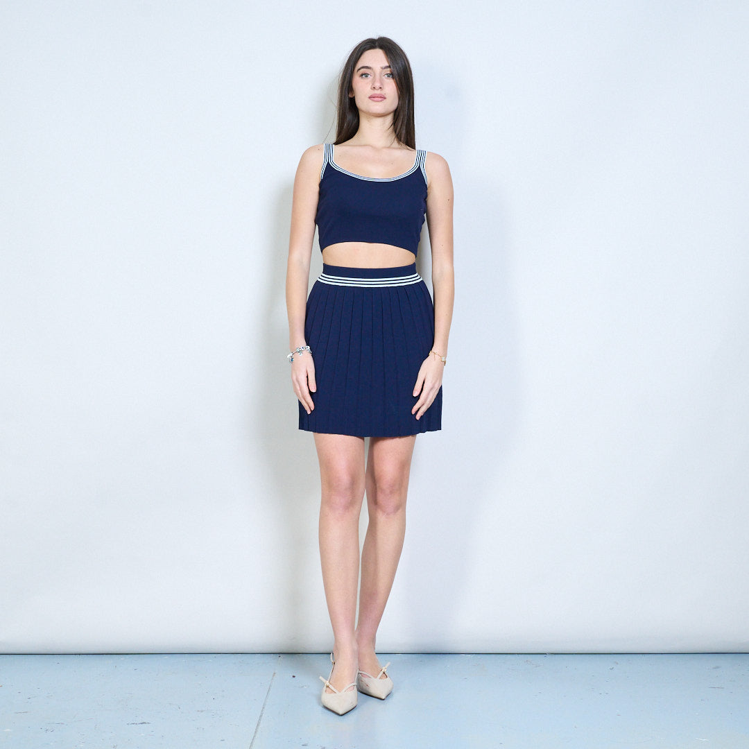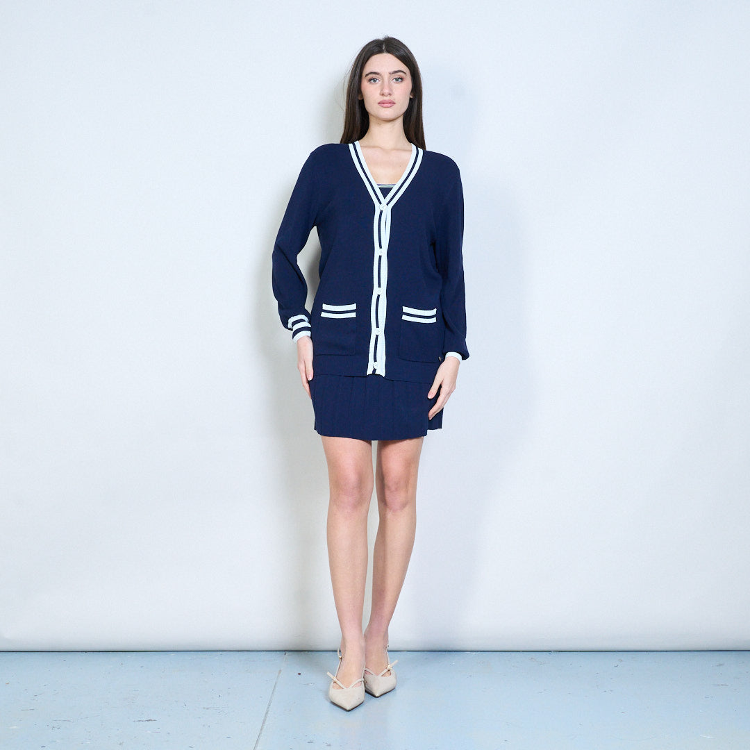 - Inkluderar ett ärmlöst stickat linne, en kofta med v-ringad knäppning och en matchande veckad minikjol