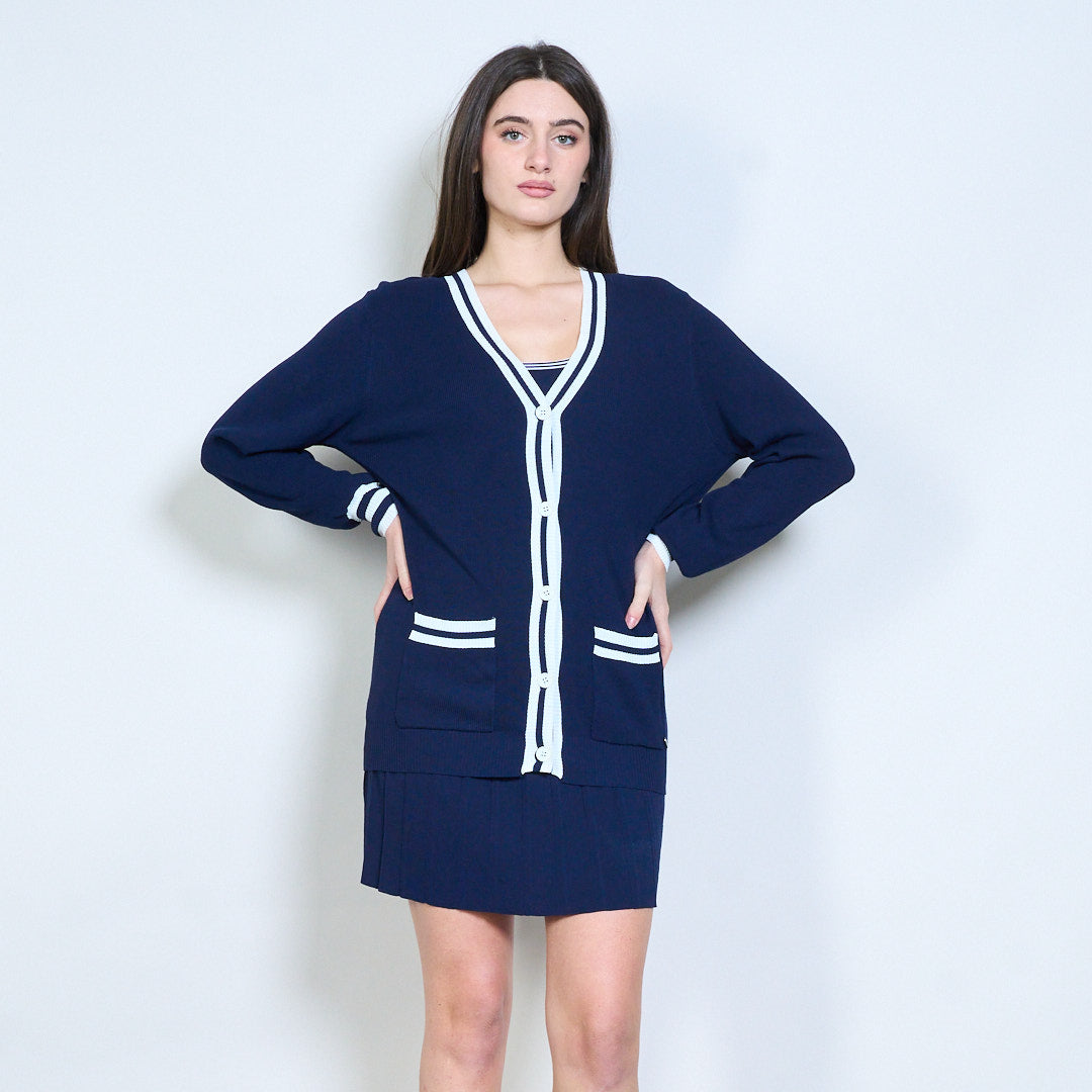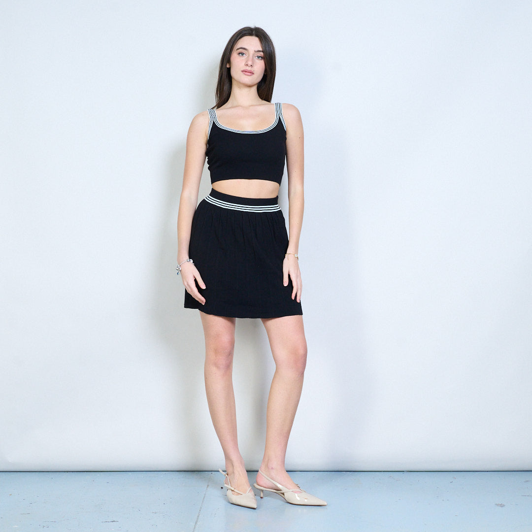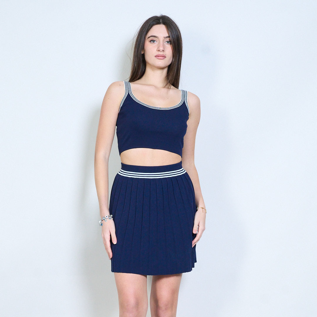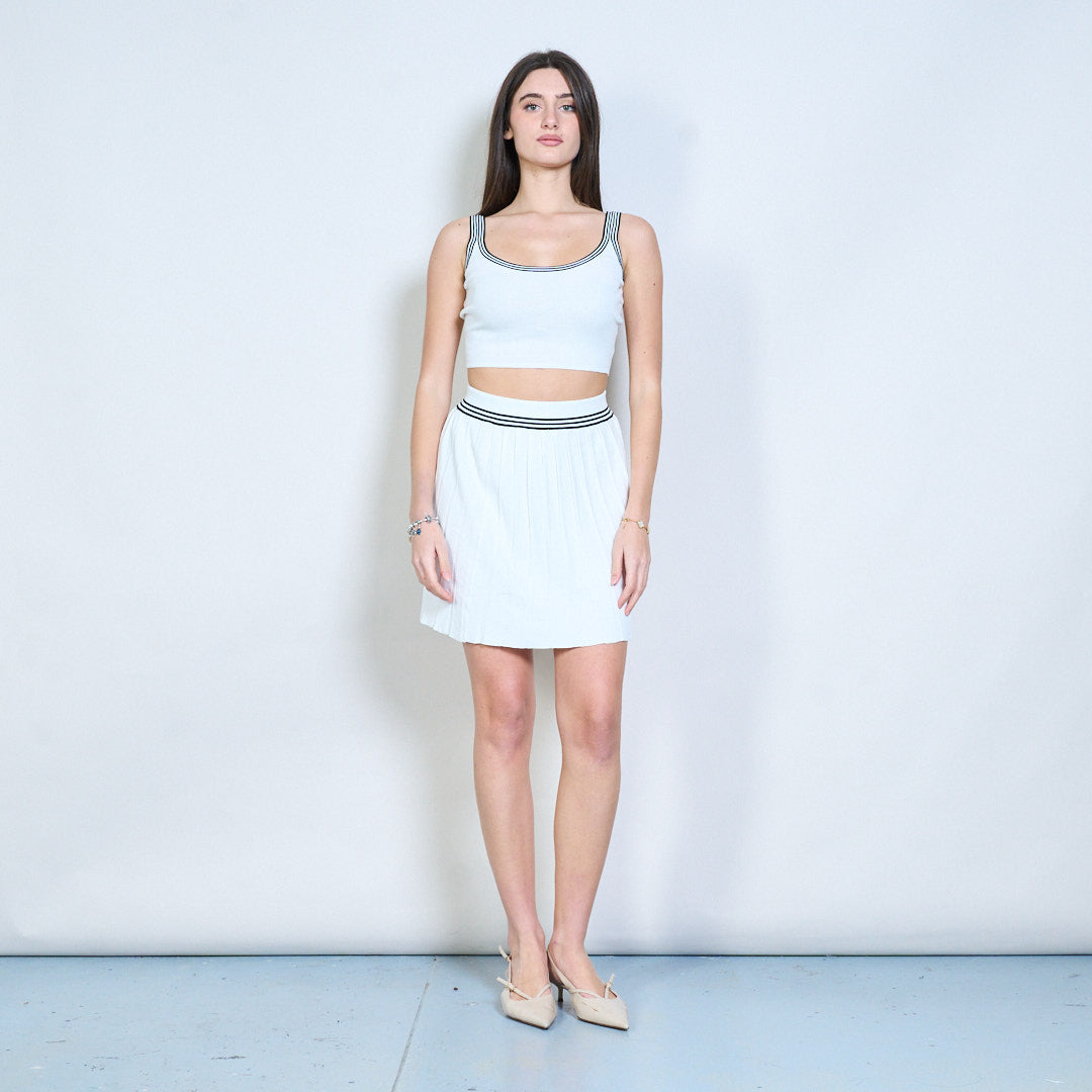 - Inkluderar ett ärmlöst stickat linne, en kofta med v-ringad knäppning och en matchande veckad minikjol