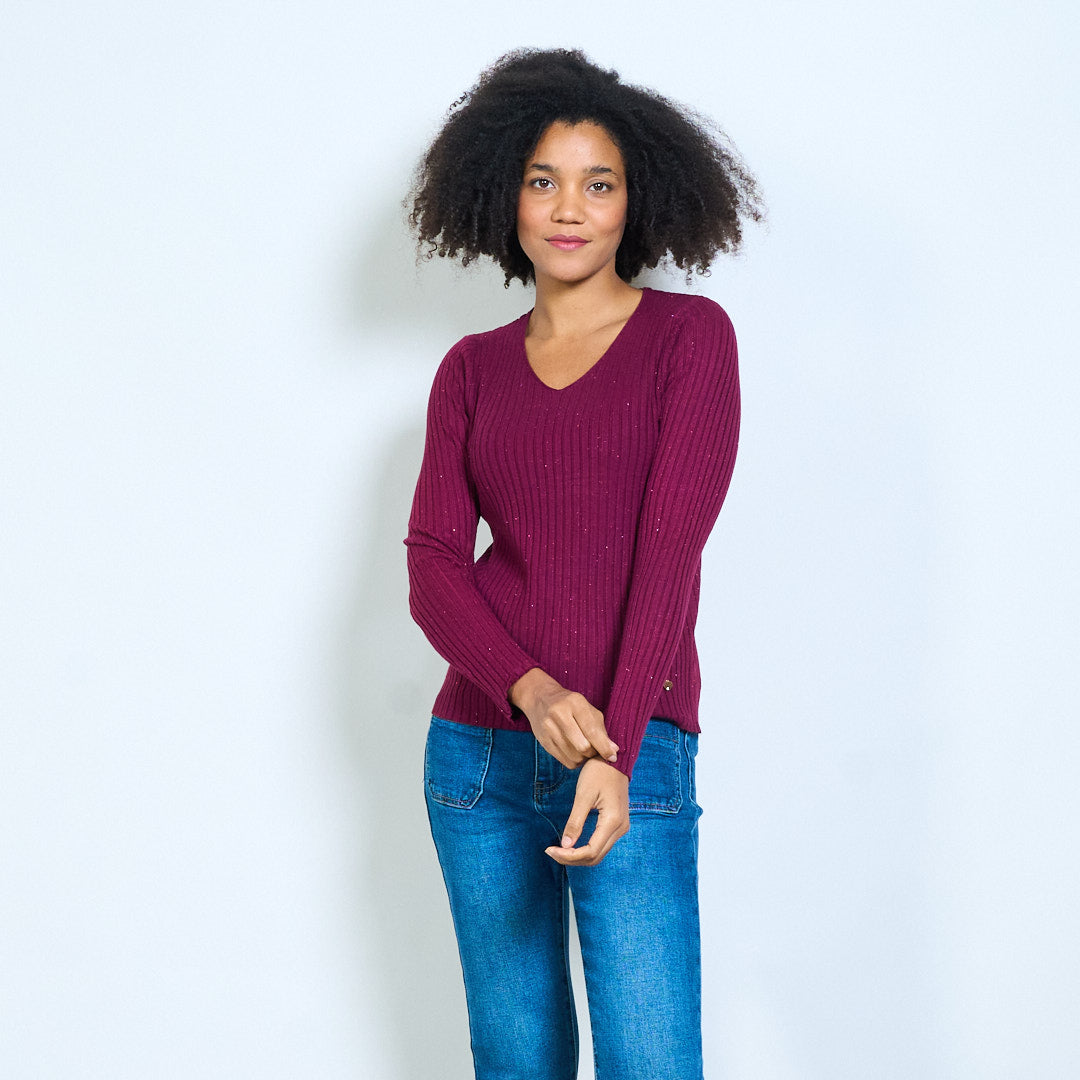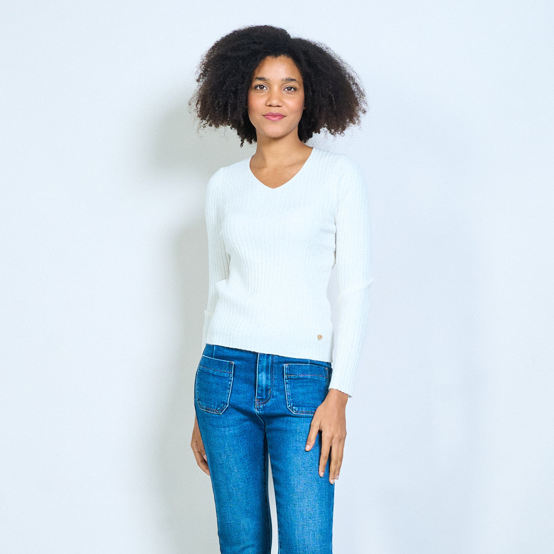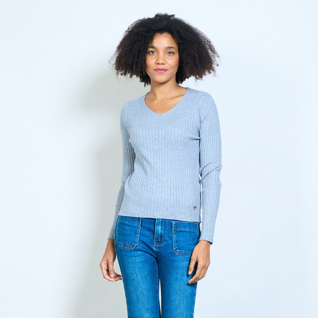 Ribbstickad v-ringad stickad tröja i grossistledet
