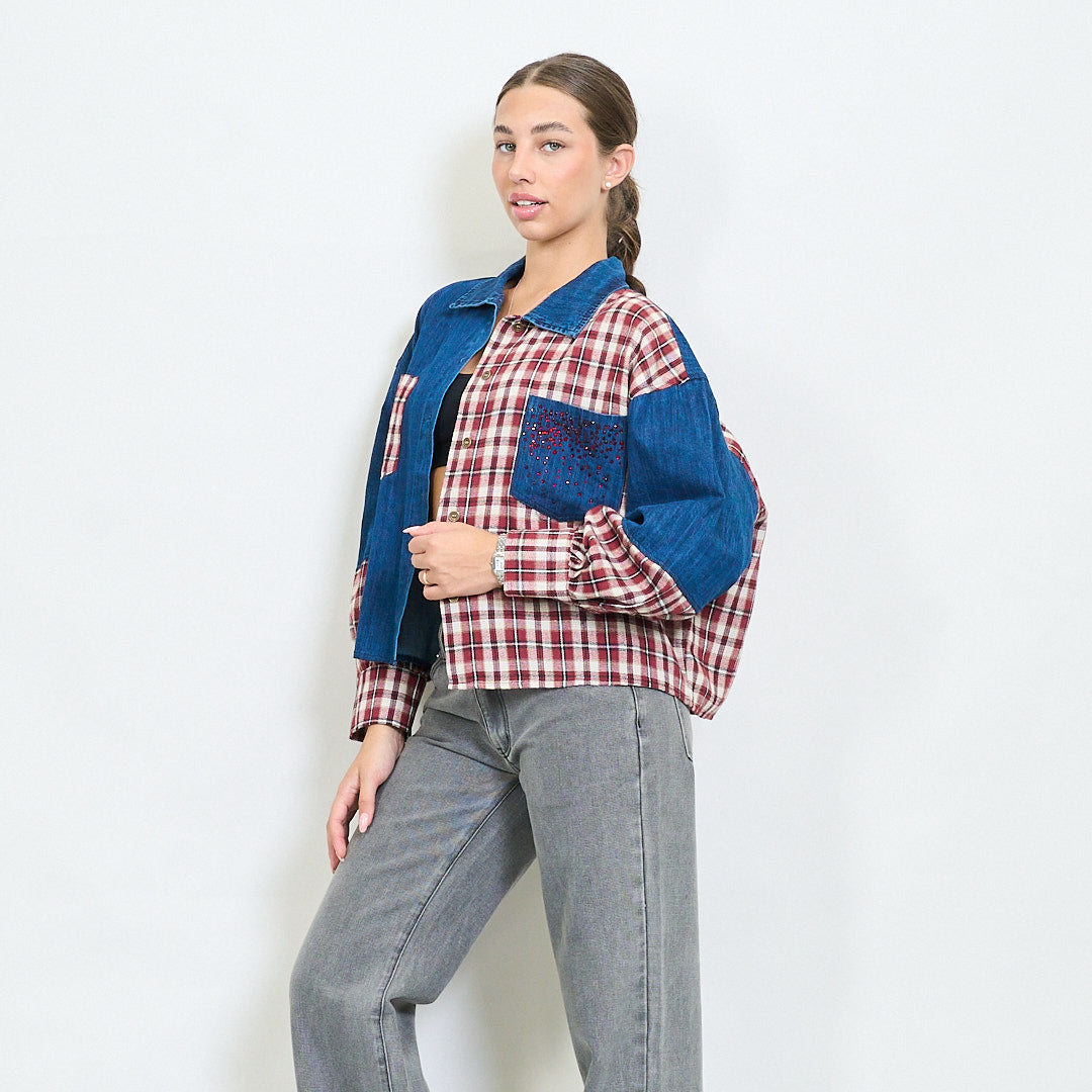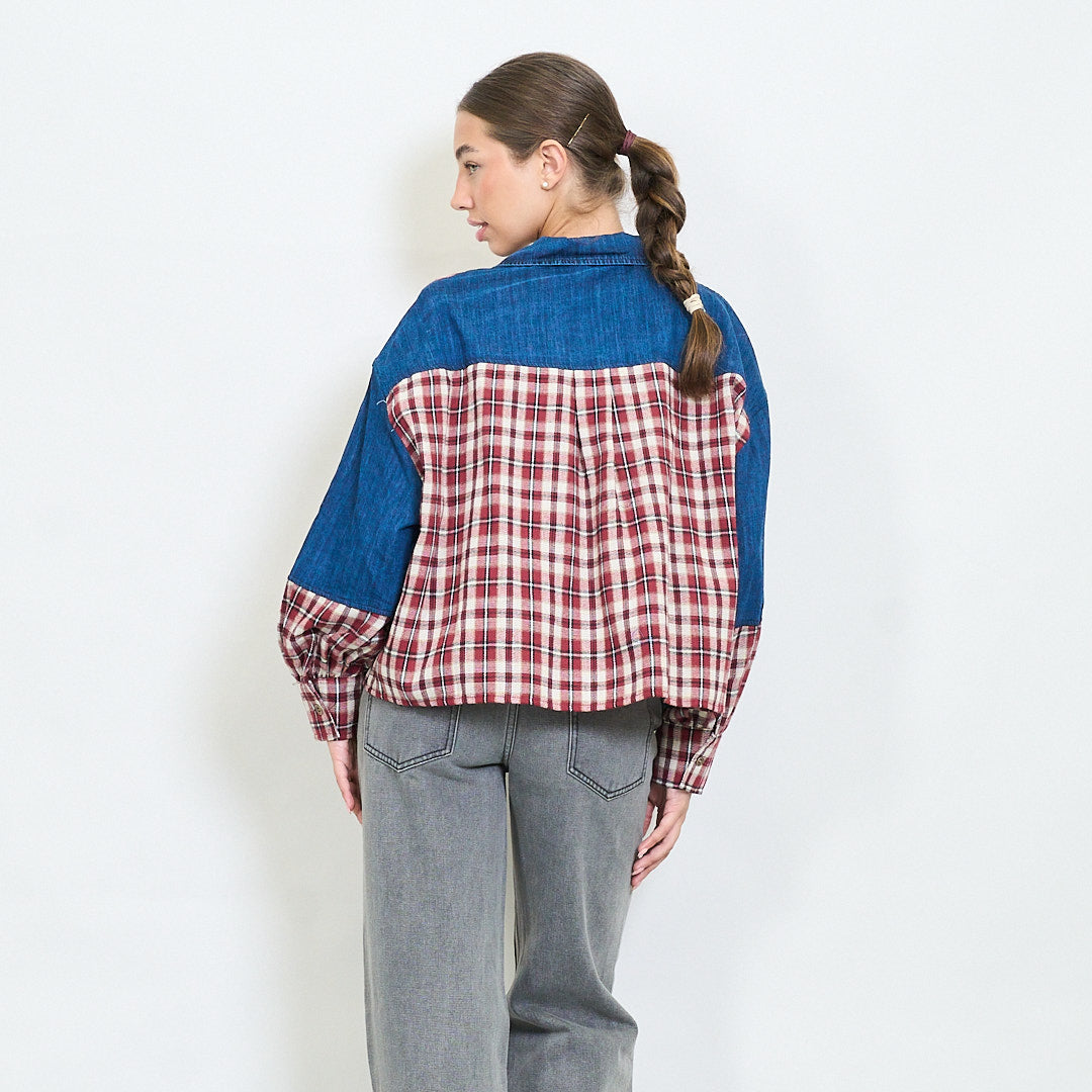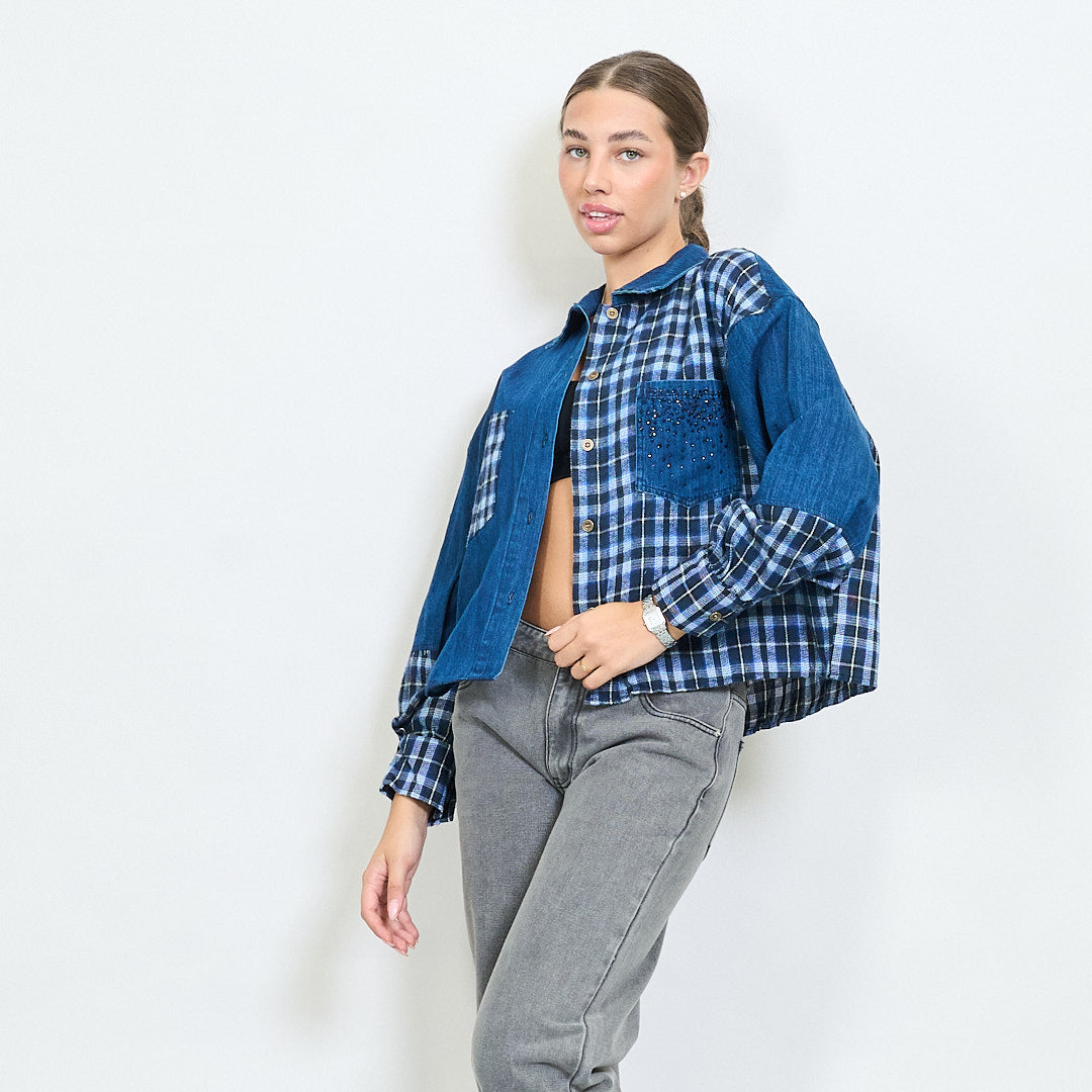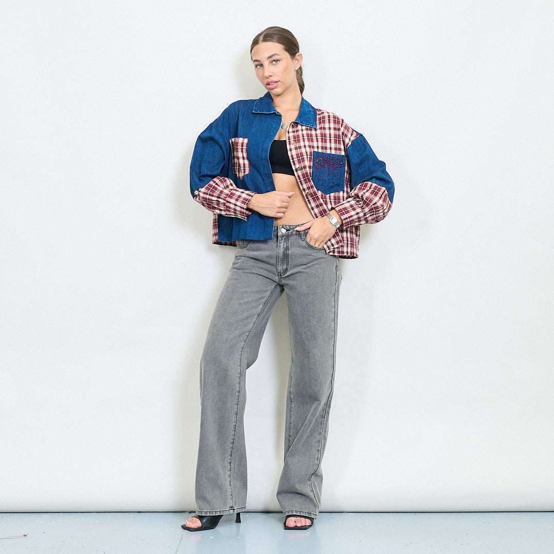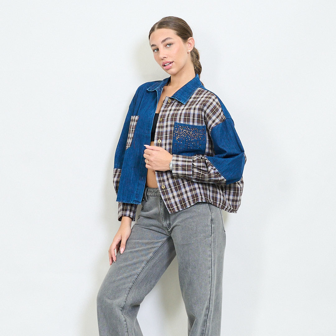 Blandad denim och rutig lapptäckskjorta med frontfickor grossist
