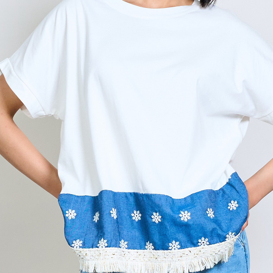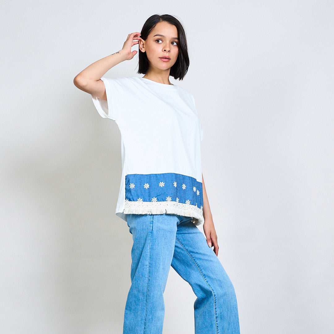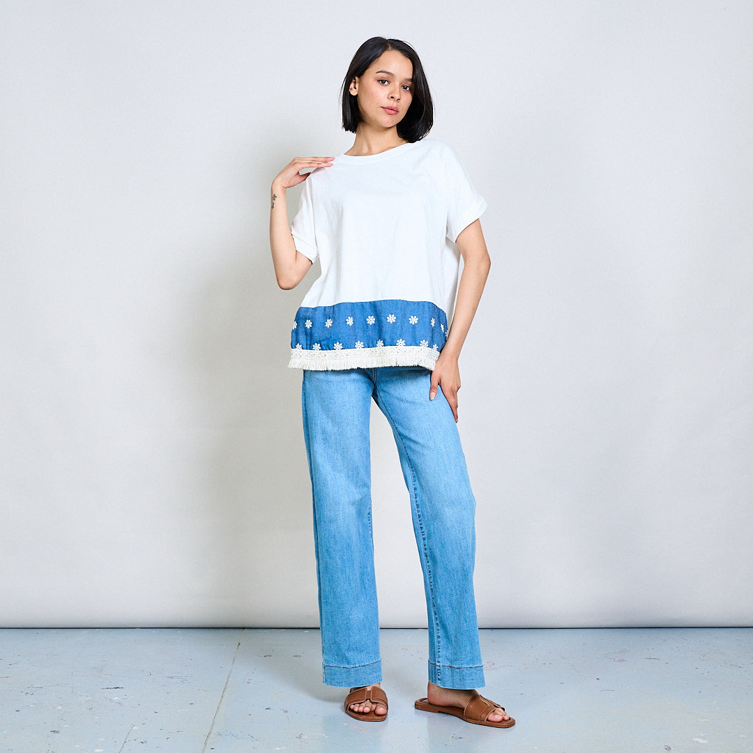 Broderad blommig kant-t-shirt med franshem grossist