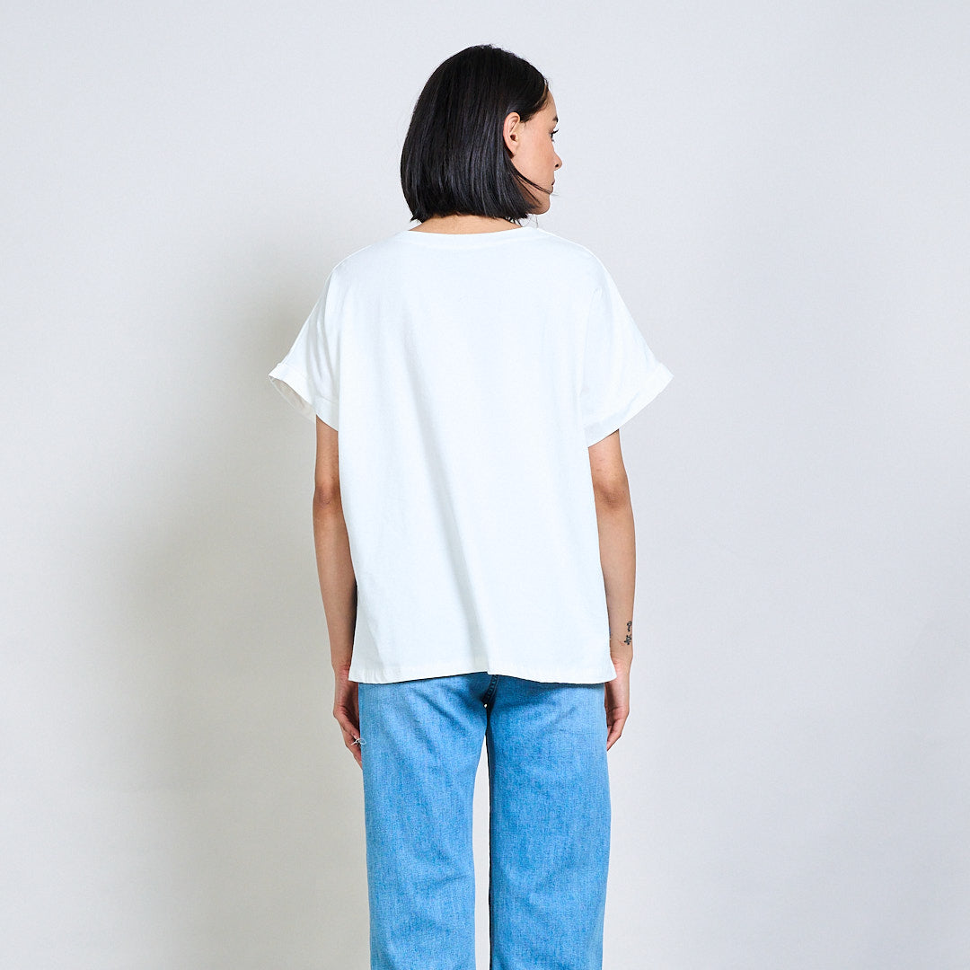 - Avslappnad passform med rullade korta ärmar för en avslappnad vibe