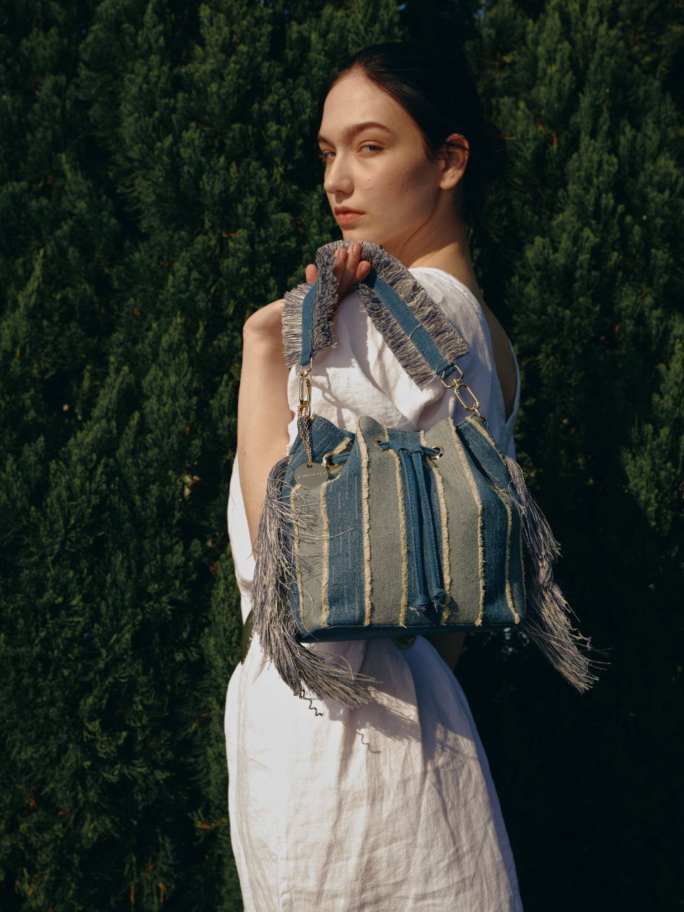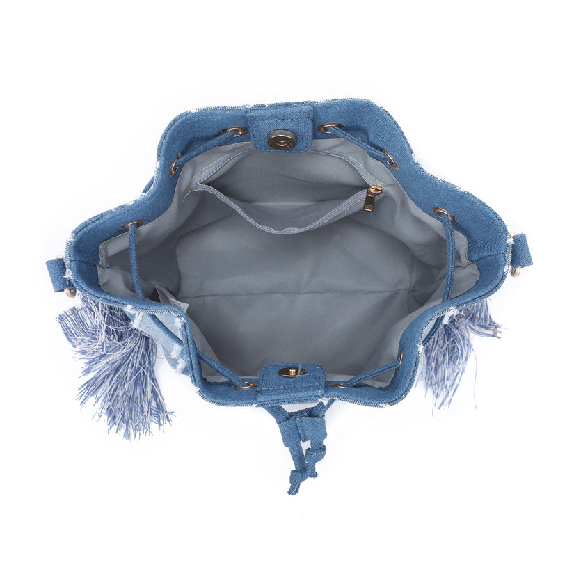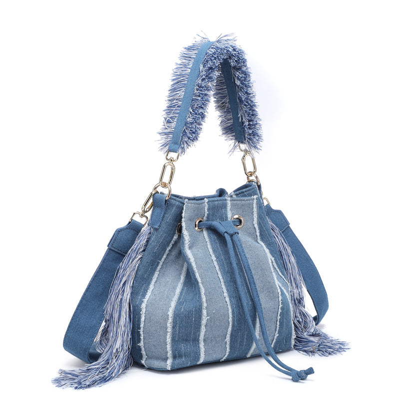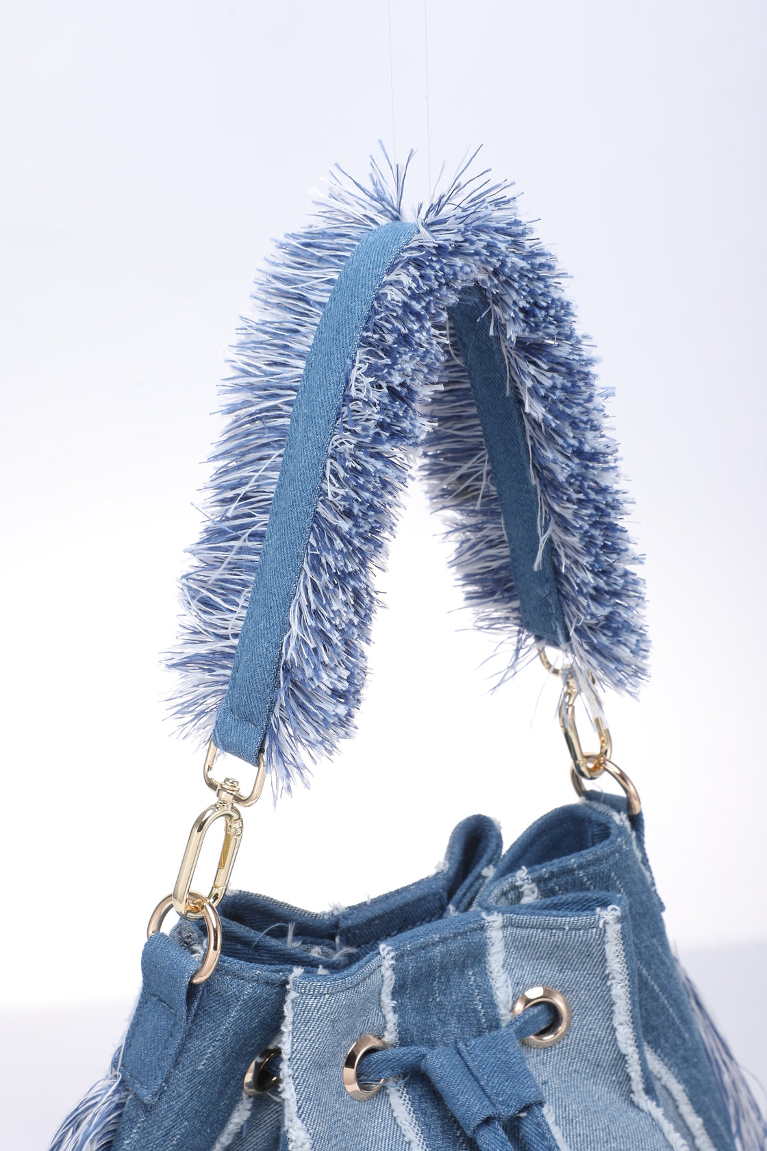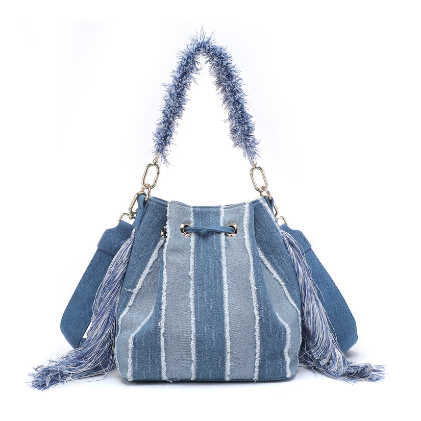 Randig denim lapptäcke hinkväska med franshandtag och tofsens grossist