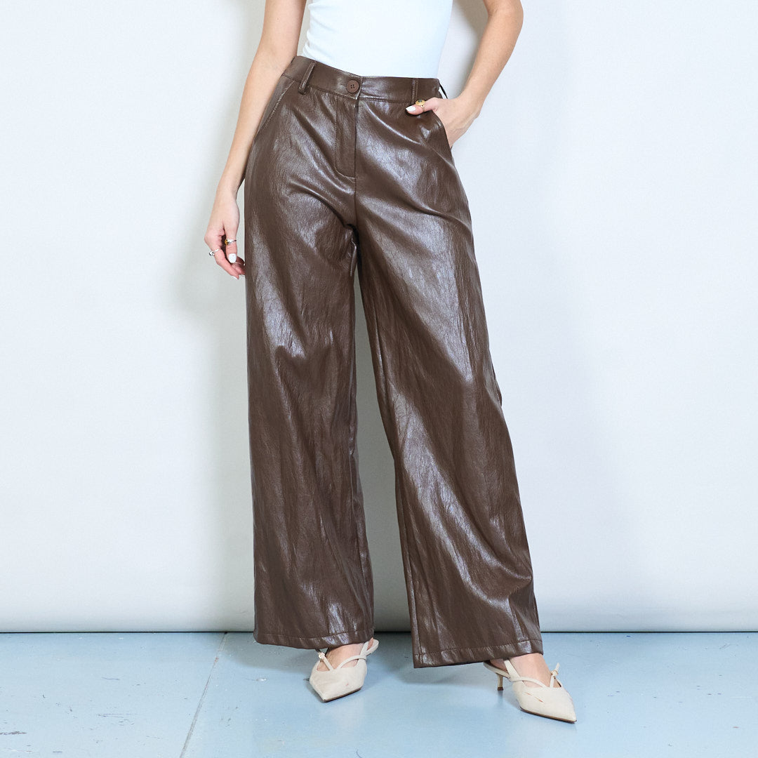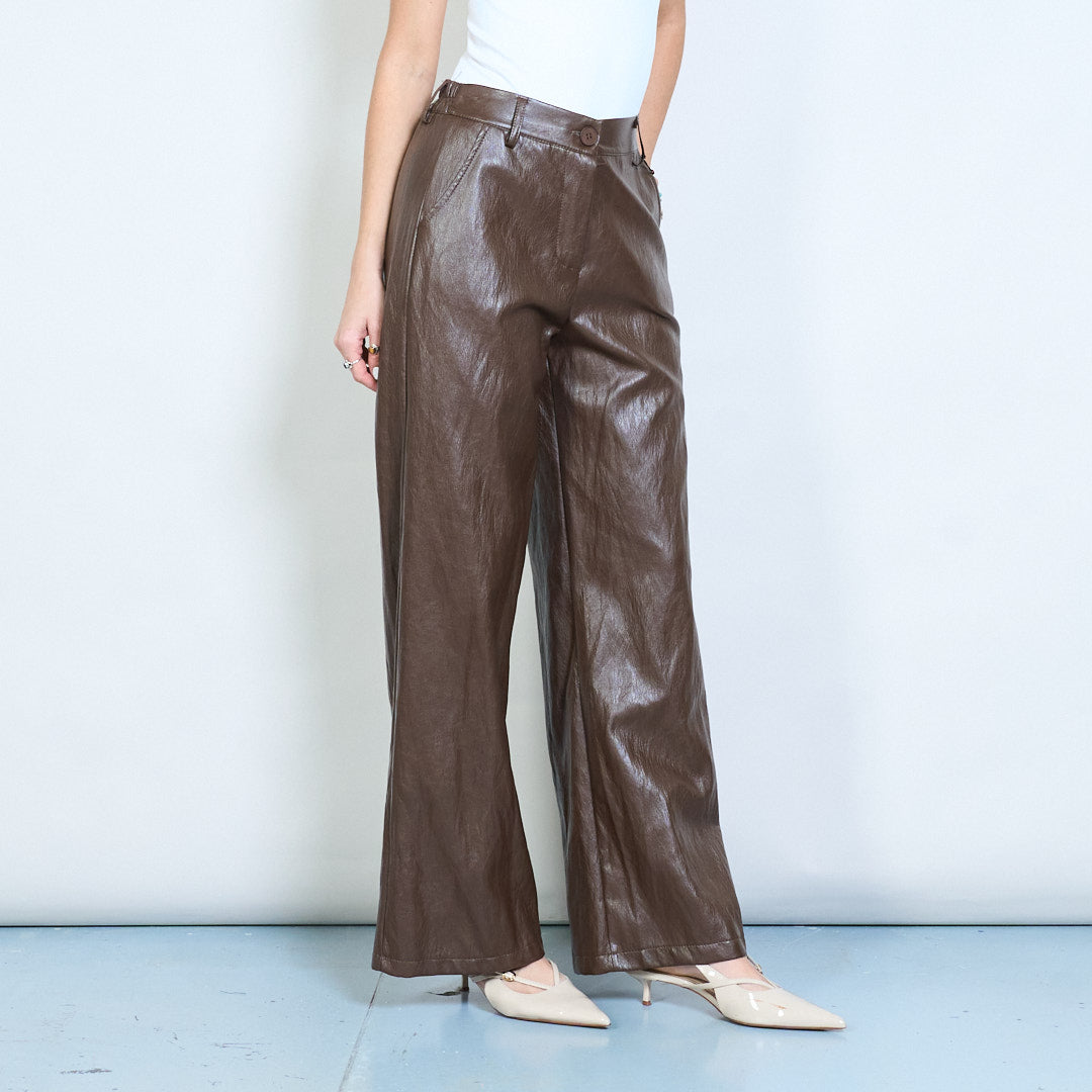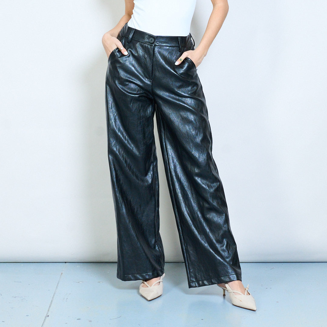 Grossistförsäljning av falska läderbyxor med vida ben med hög midja