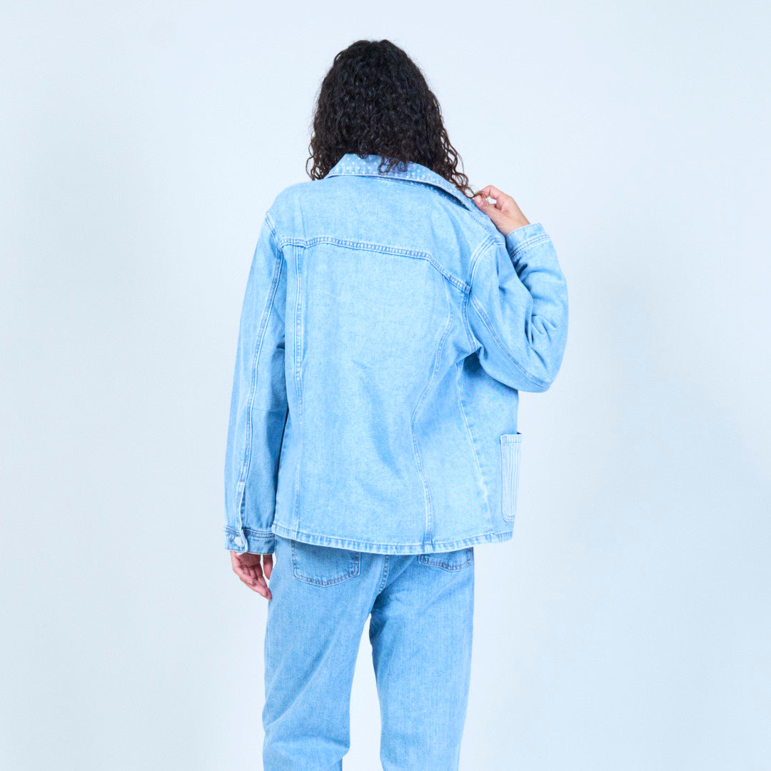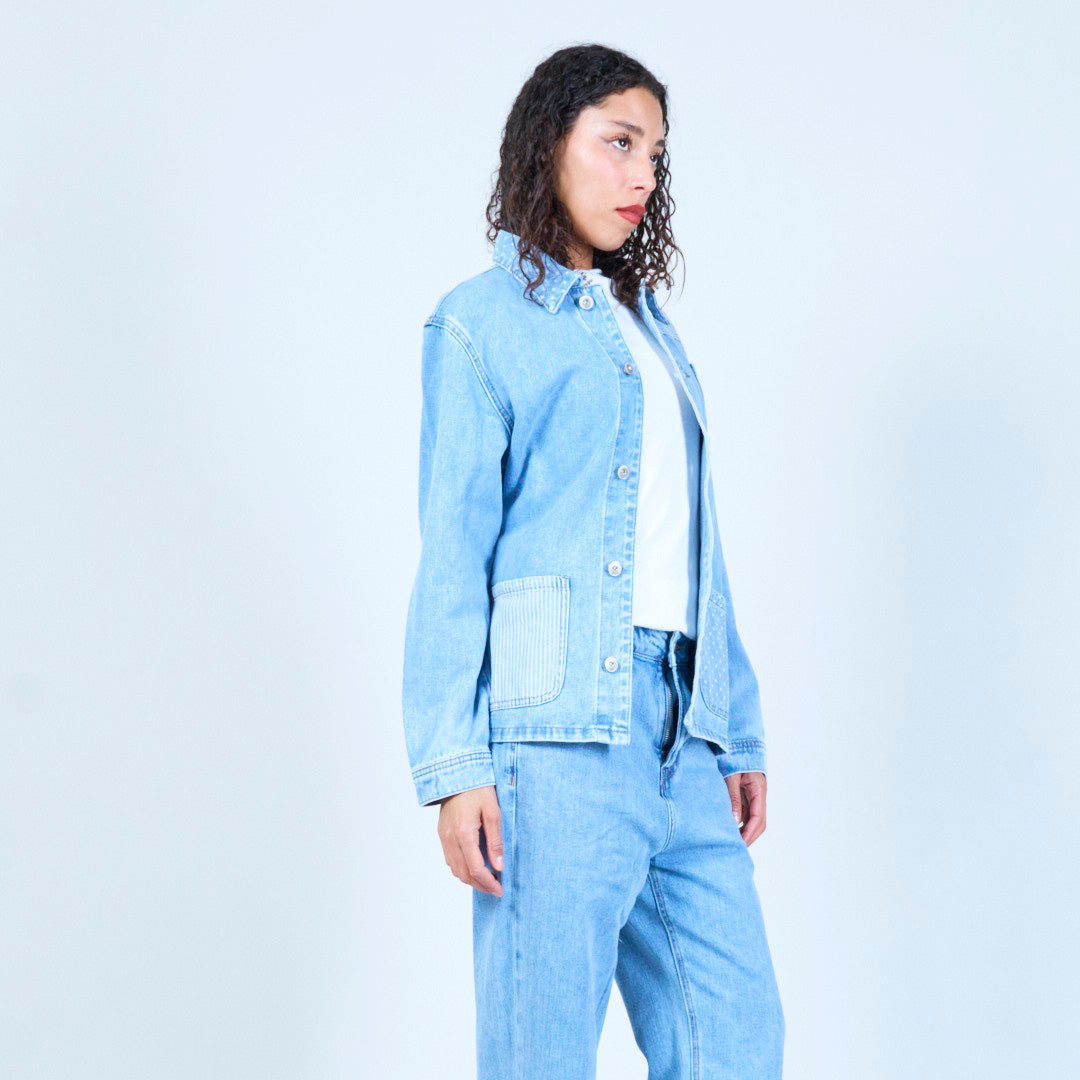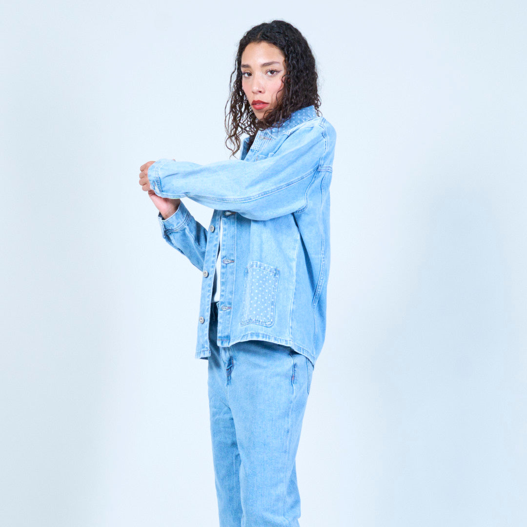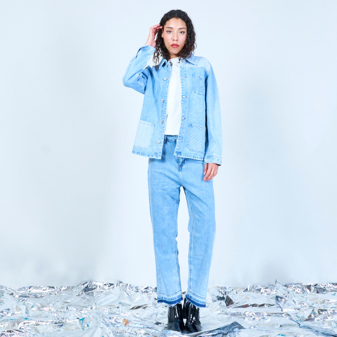 - Unik lapptäckningsdetaljer på krage, fickor och manschetter