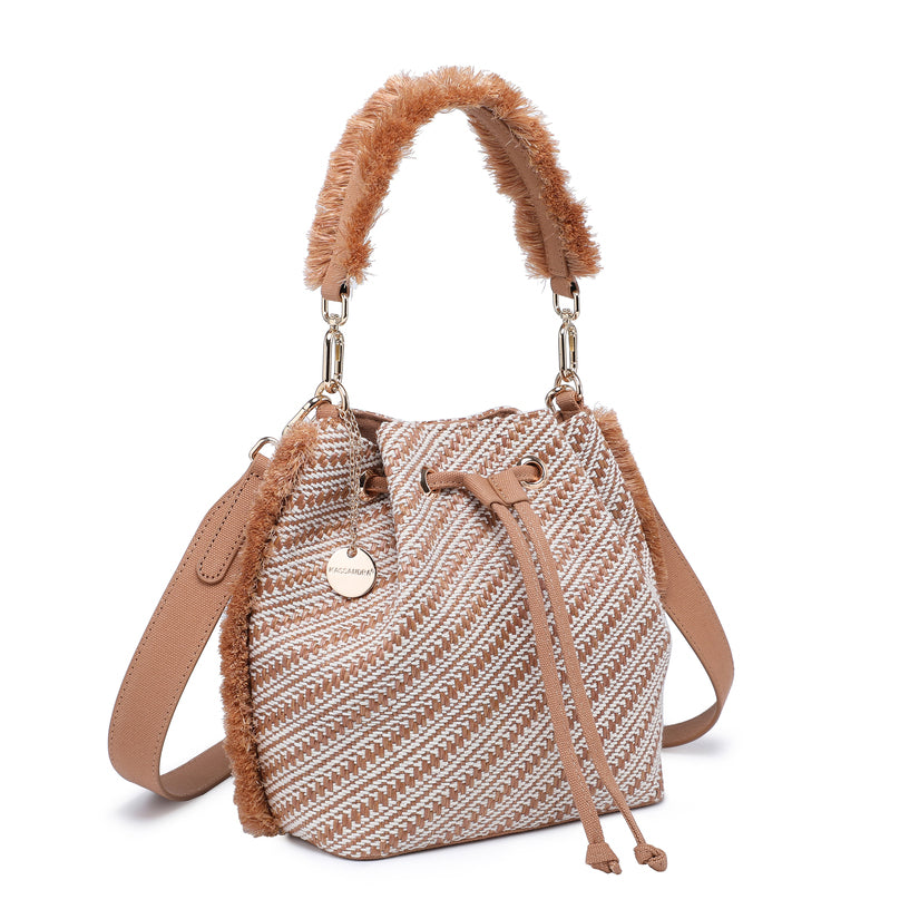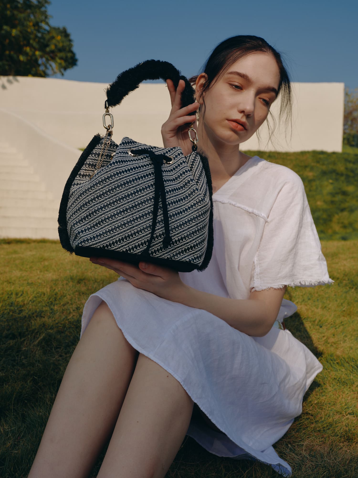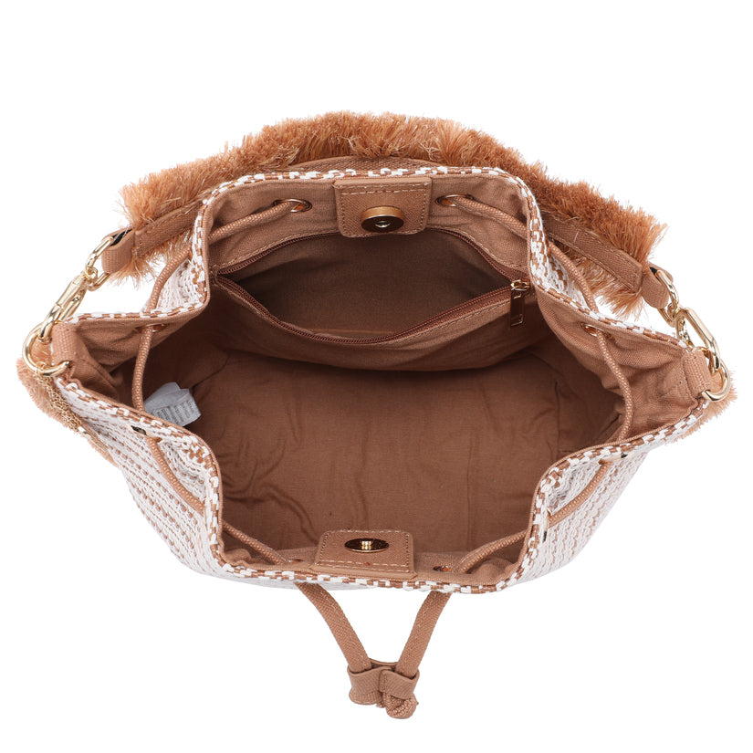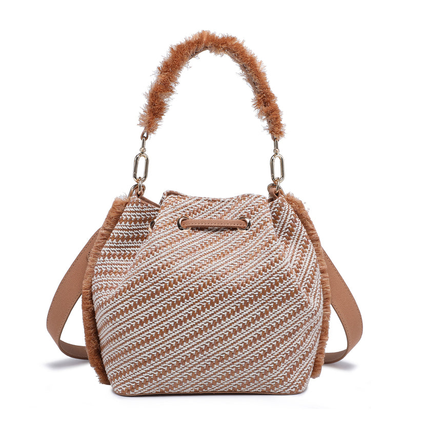 Fransad vävd hinkväska med chevronstruktur och dragsko detaljer grossist