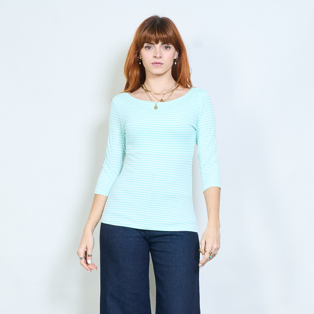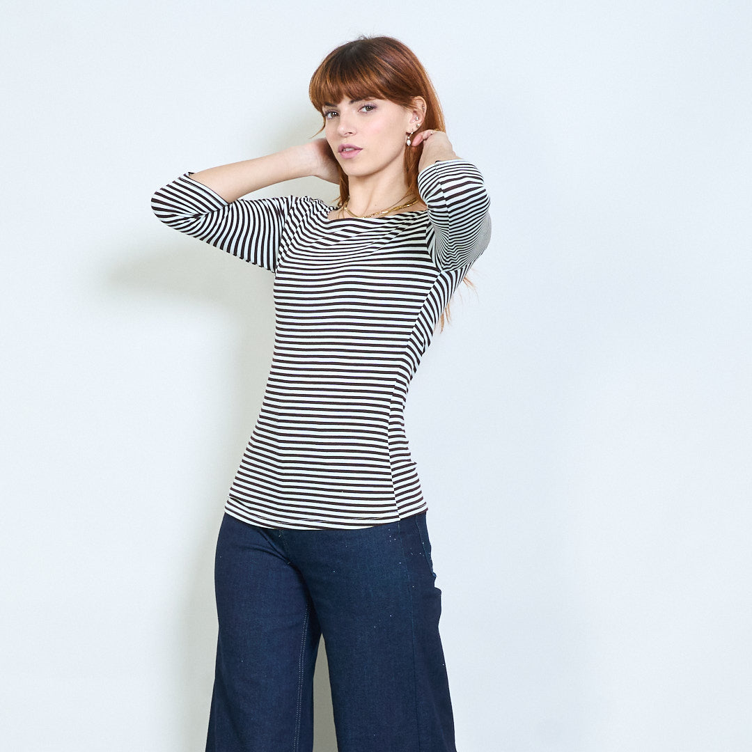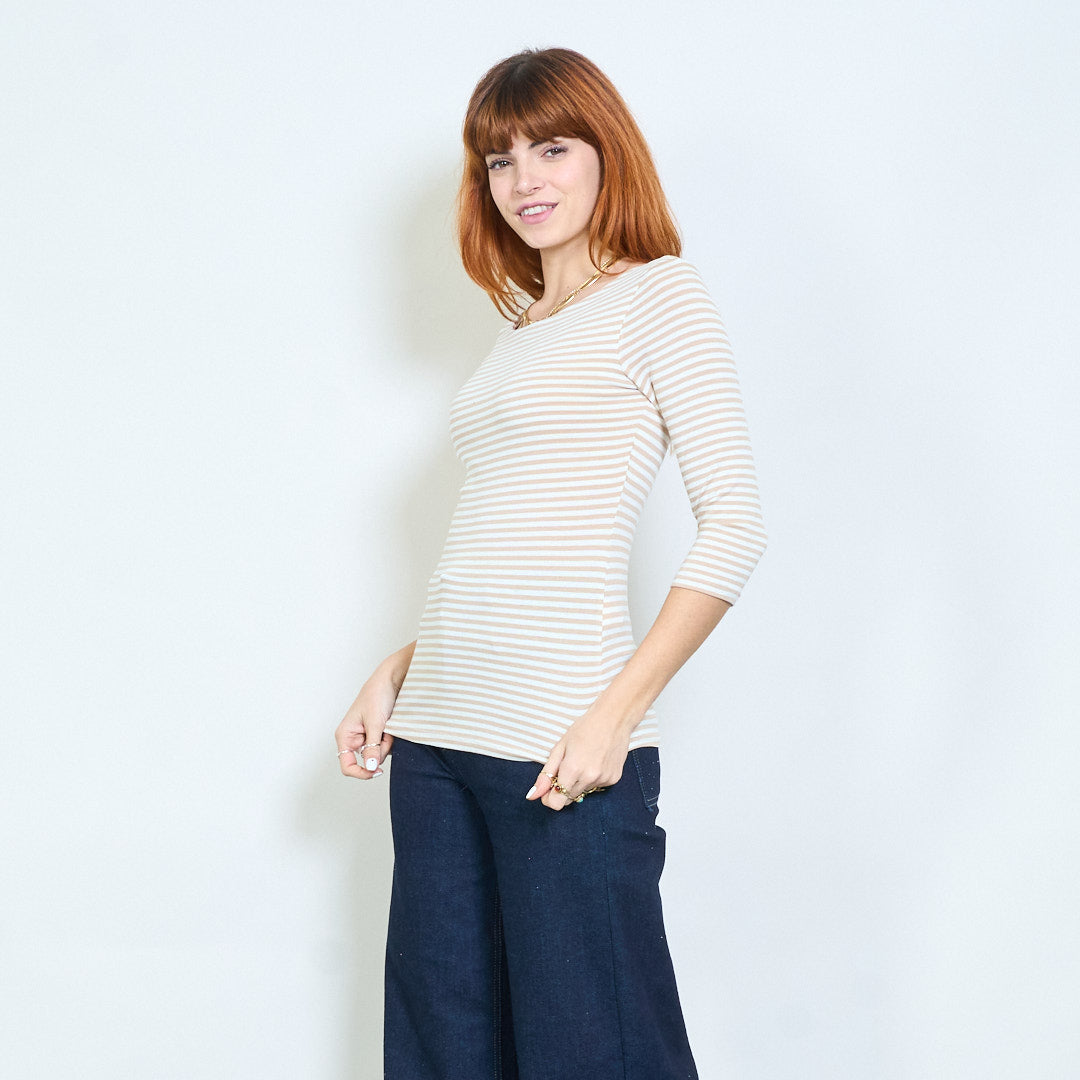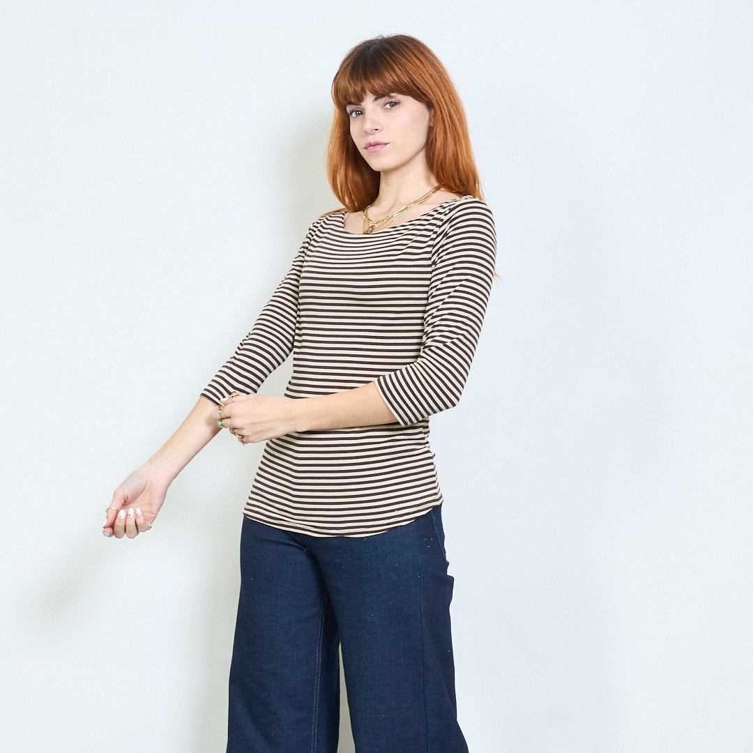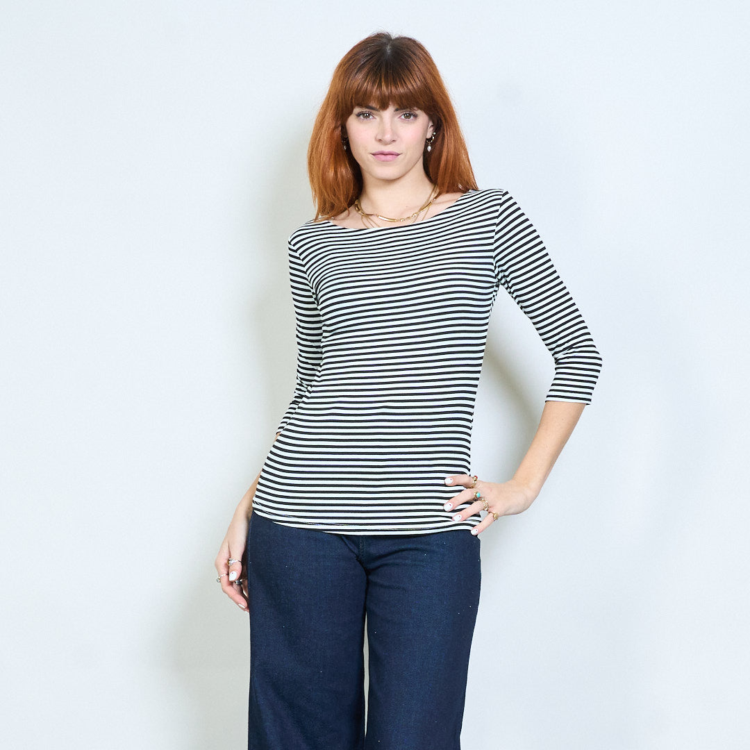 Randig båthals monterad tre fjärdedels ärm topp grossist