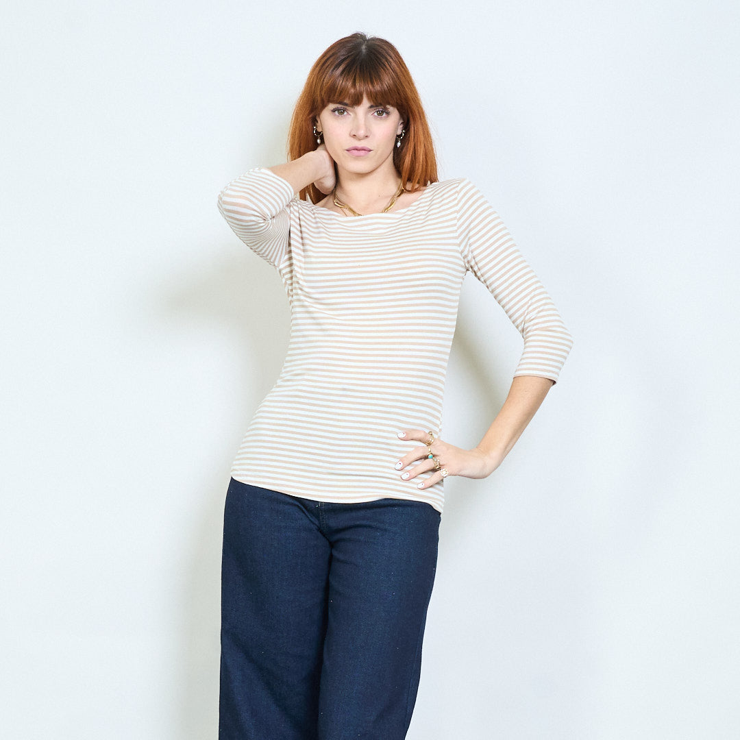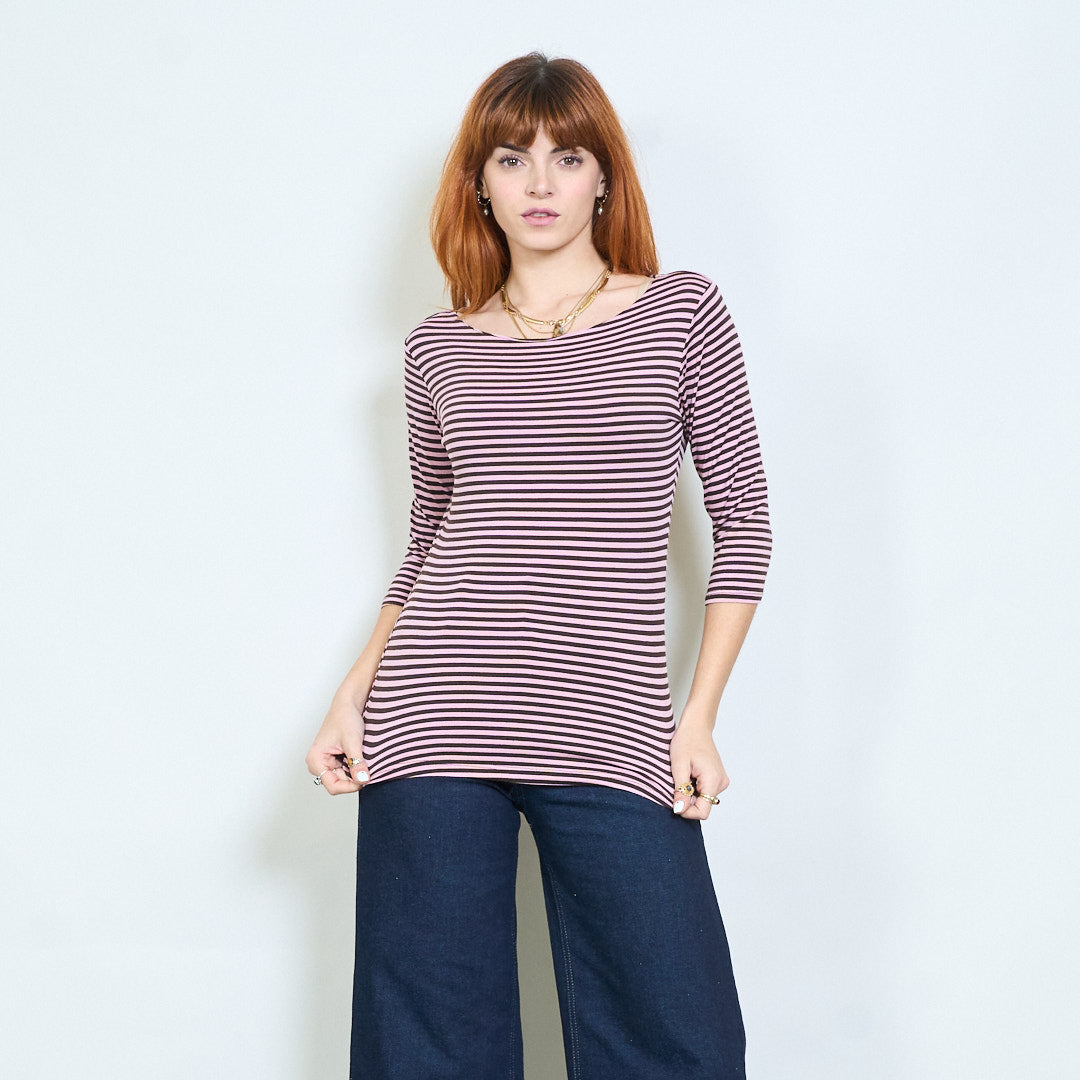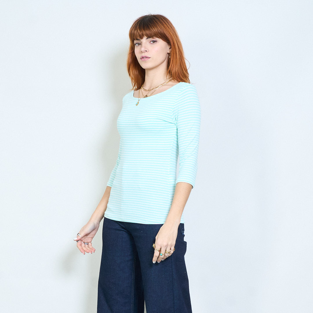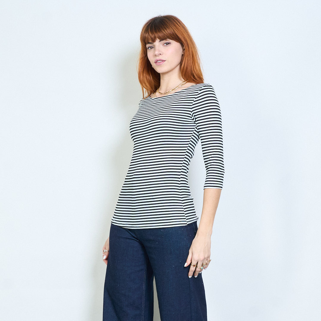 Randig båthals monterad tre fjärdedels ärm topp grossist