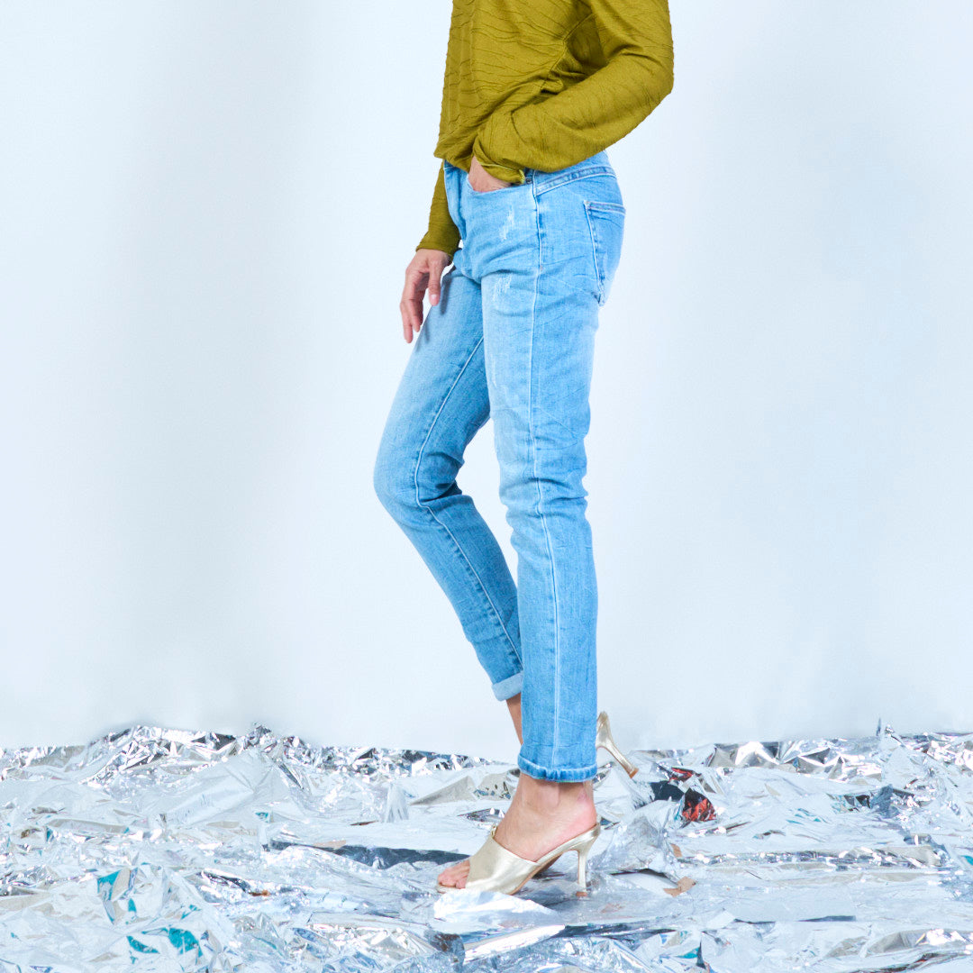 Slim Fit nödställda jeans med robusta detaljer grossist