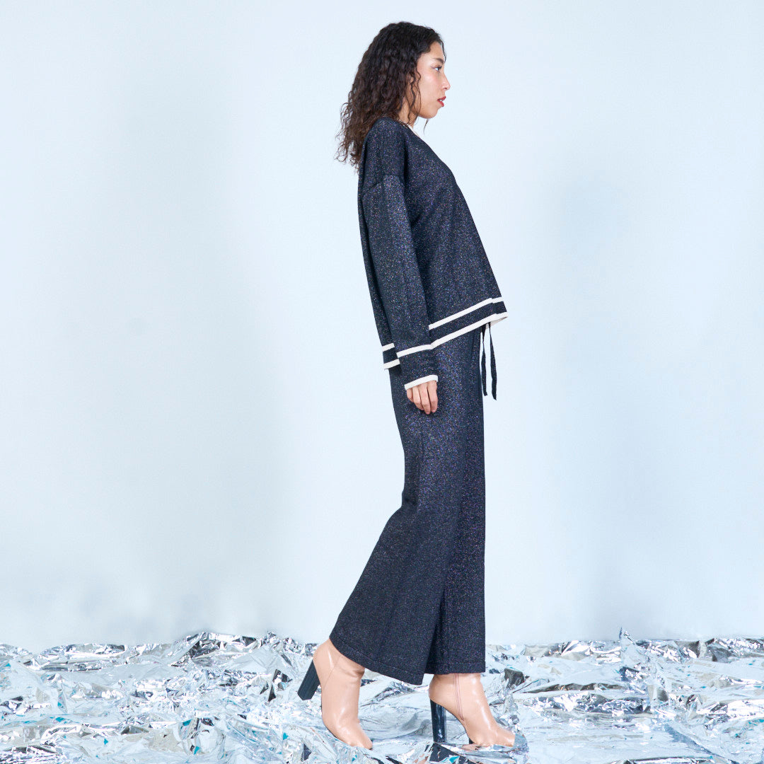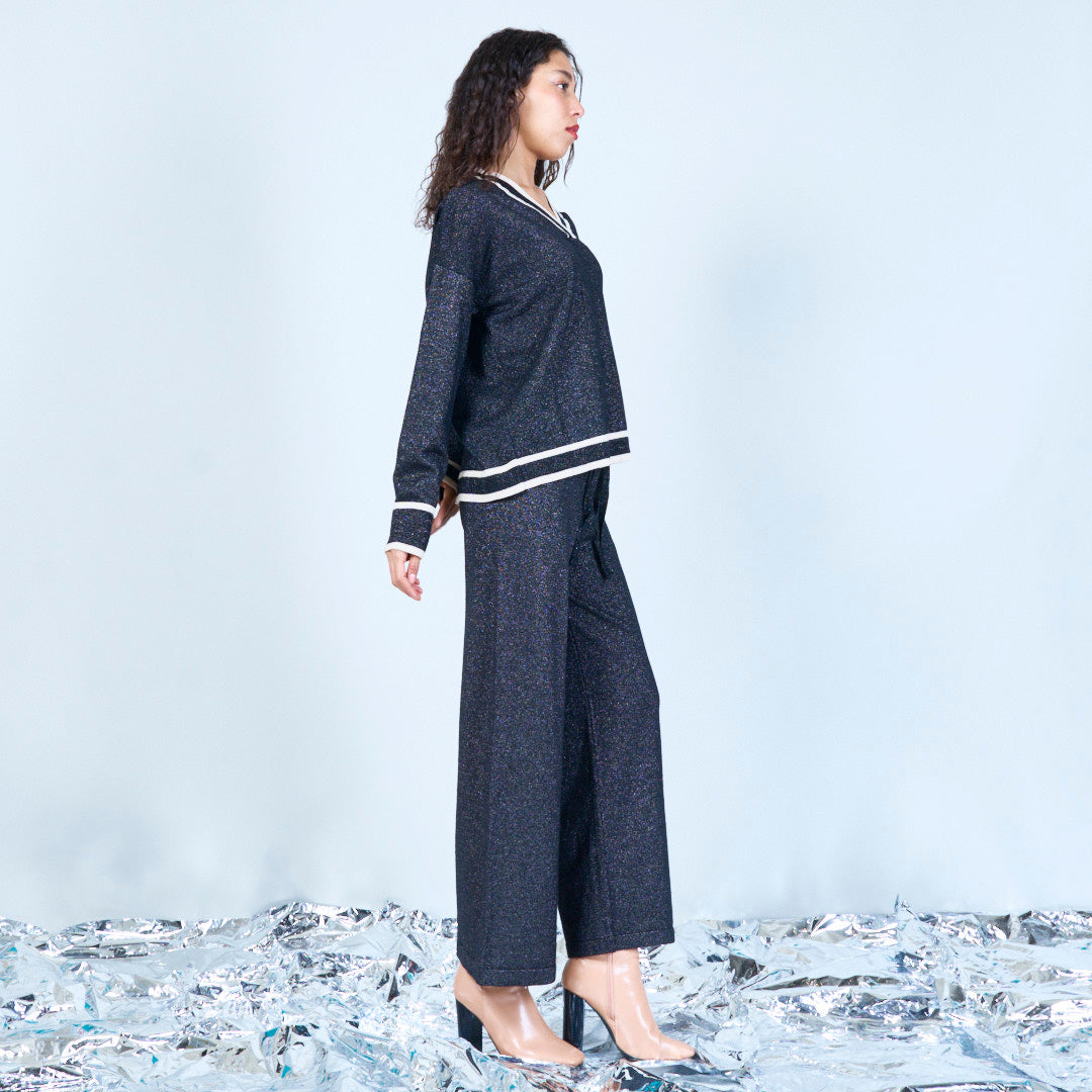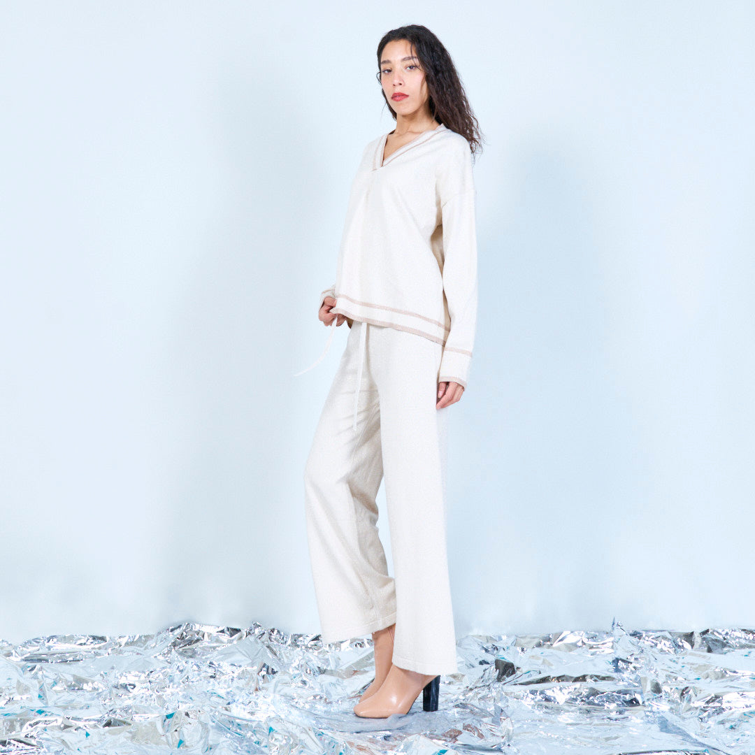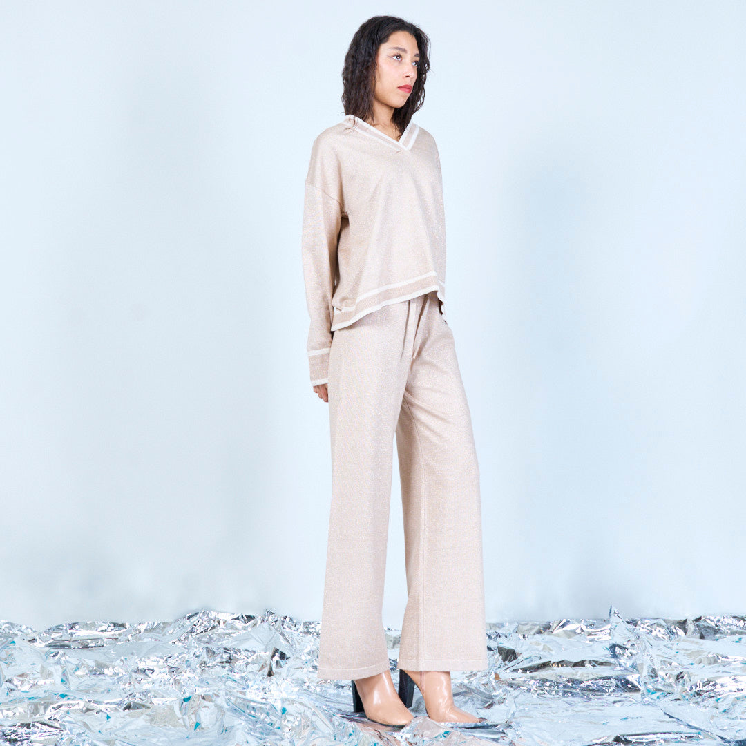 - Tvådelar med en V-Neck-topp- och bredbenbyxor