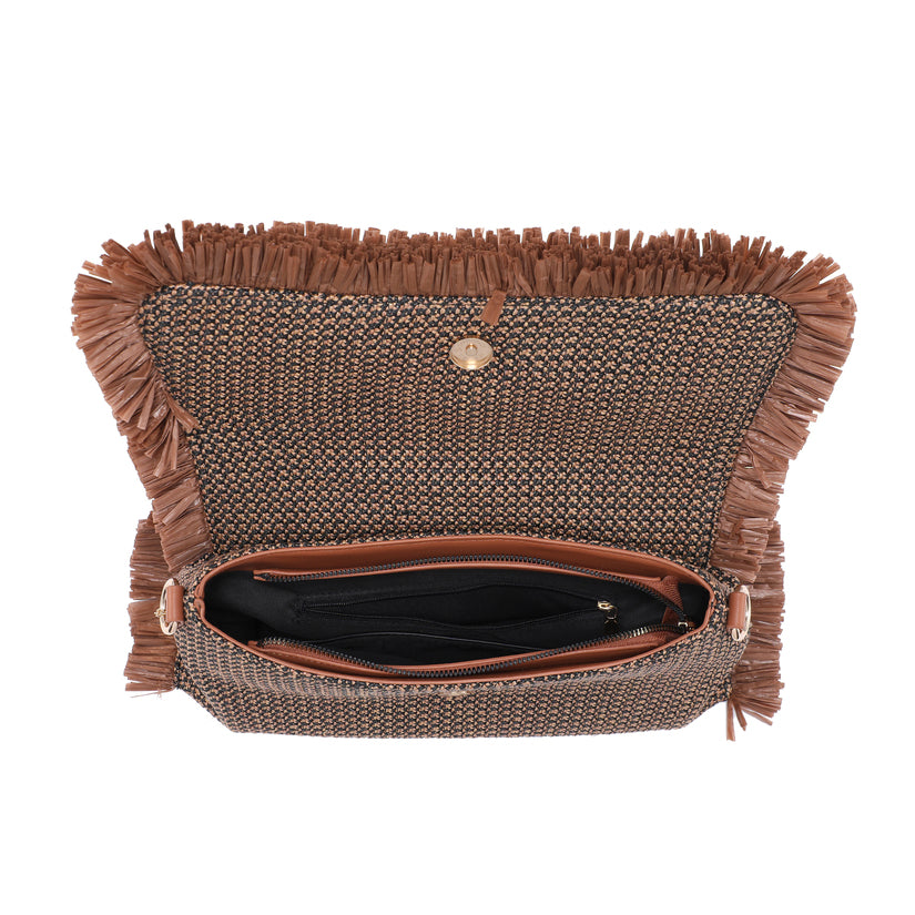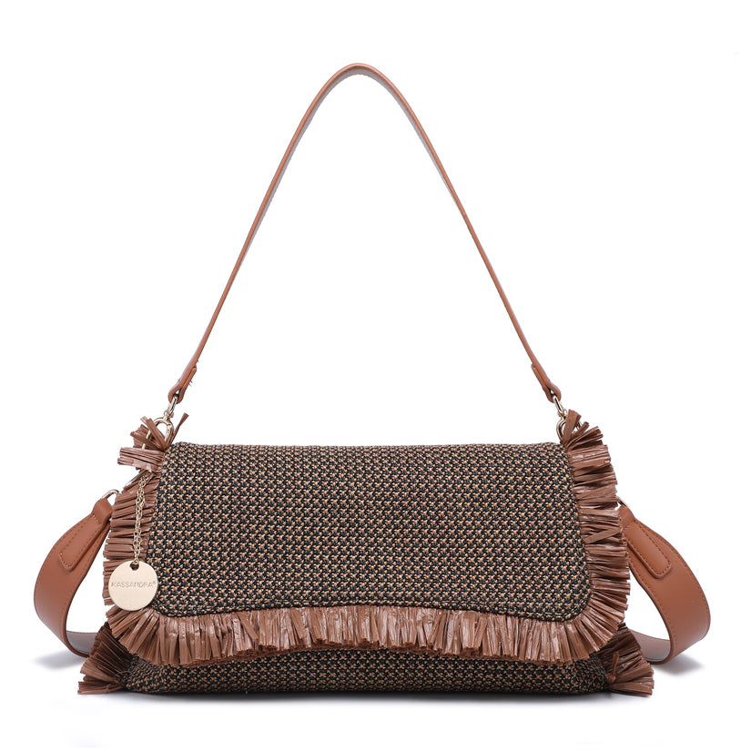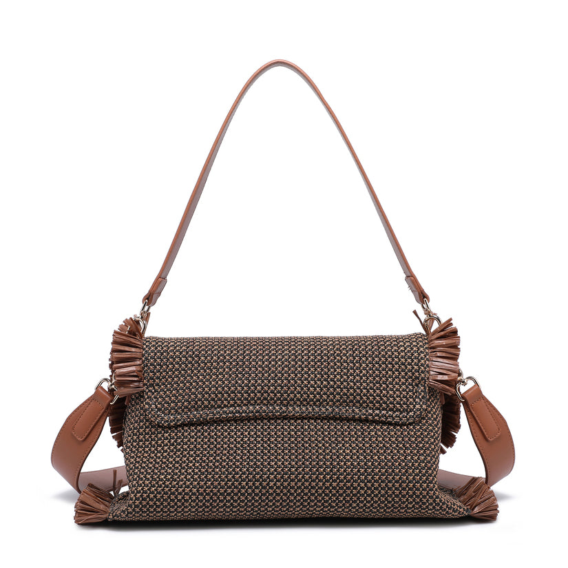 Texturerad vävd klaff axelväska med frans trim och faux läderband grossist