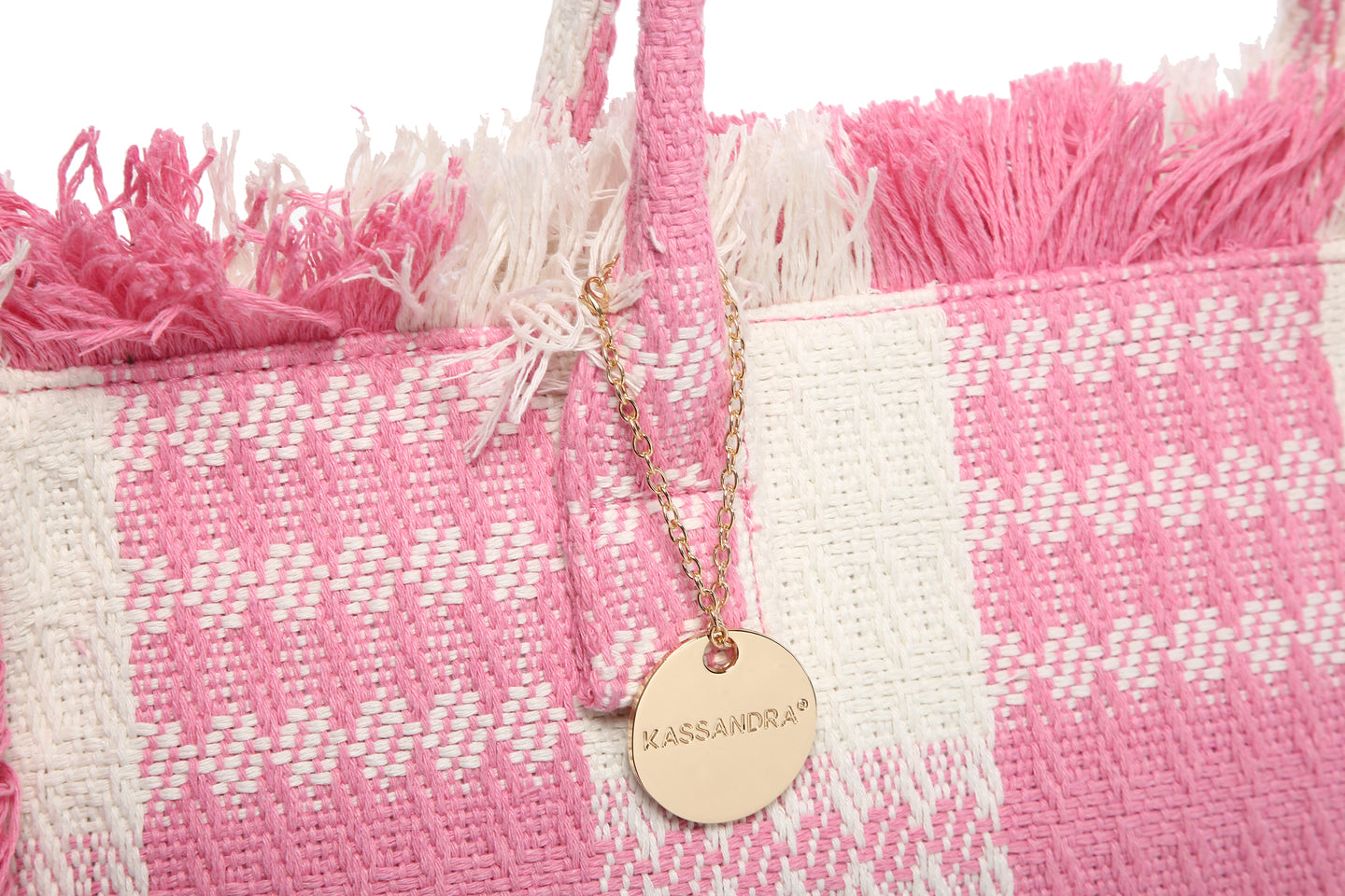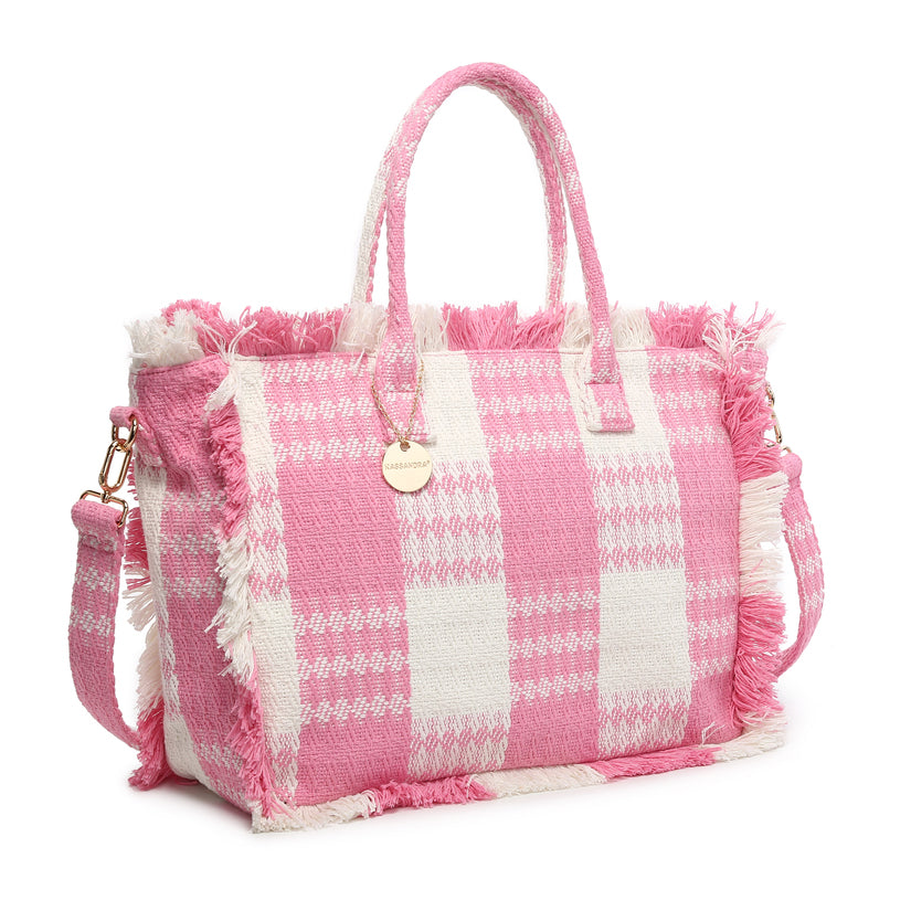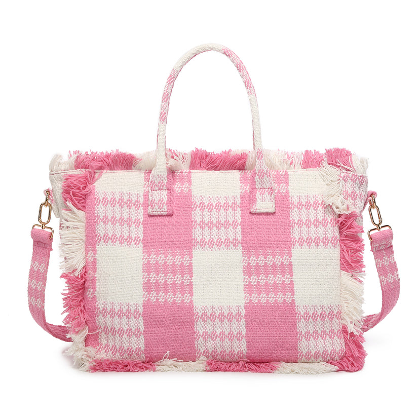 Vävd rutig franspås med dubbla handtag och axelband grossist