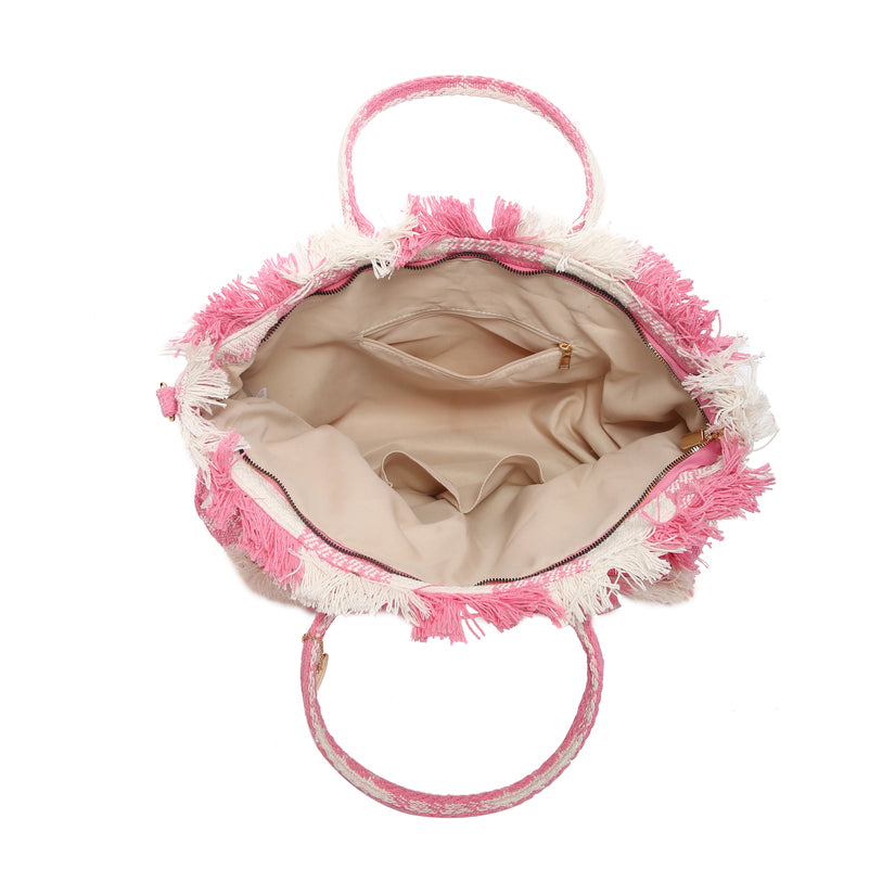 - Frayed fransetaljer runt kanterna för en avslappnad, boho-inspirerad look