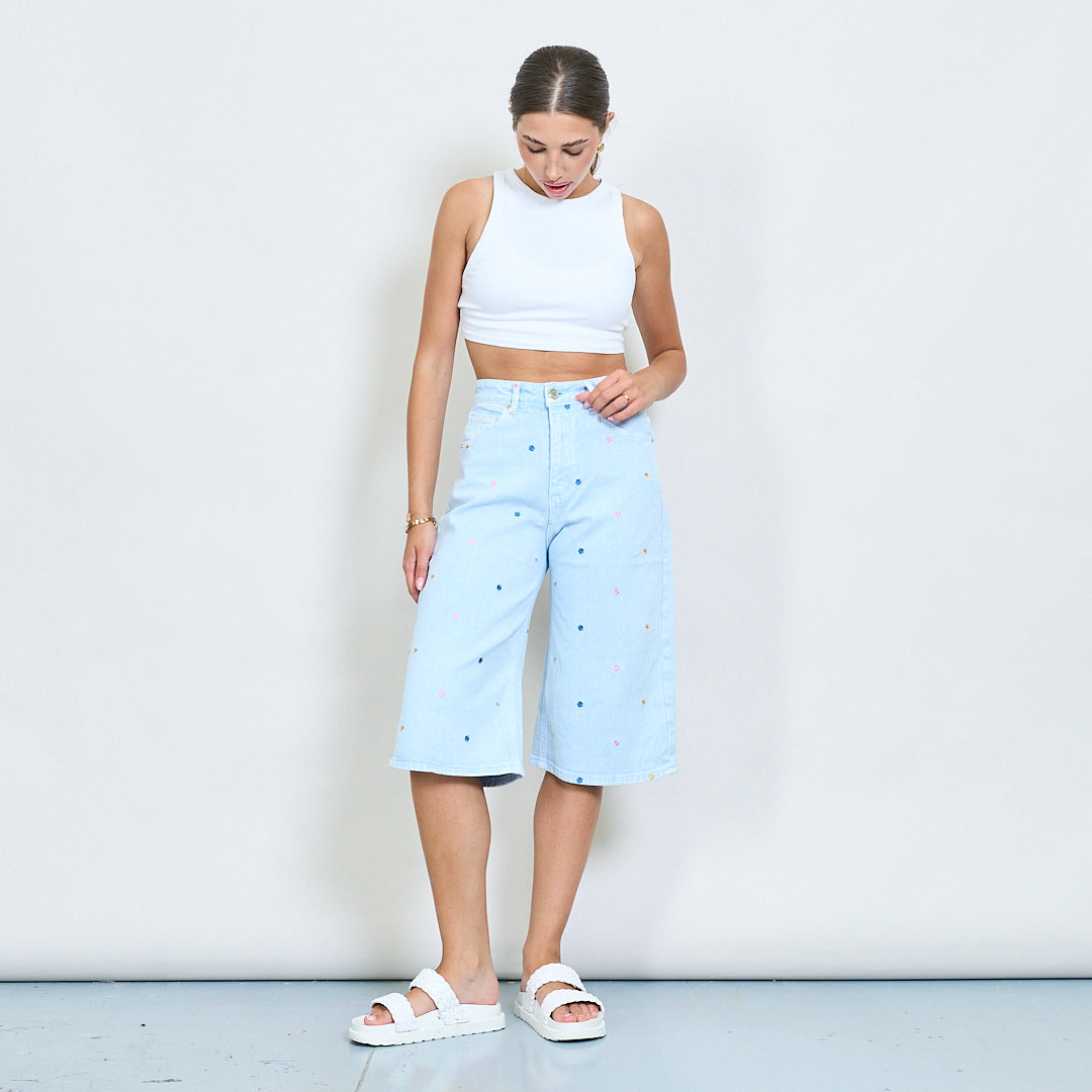 Flerfärgad prickad broderi denim Bermuda shorts grossist