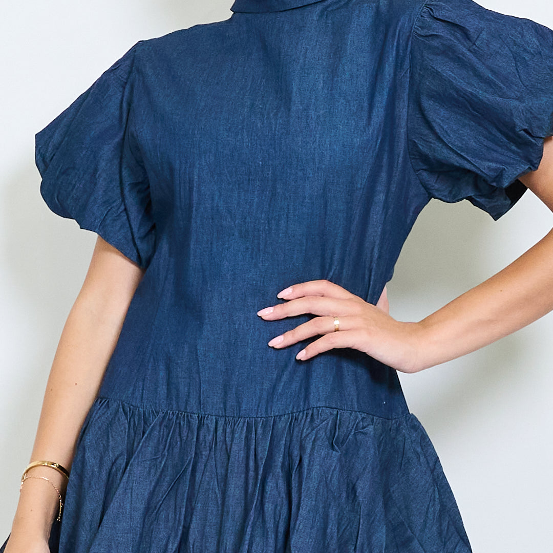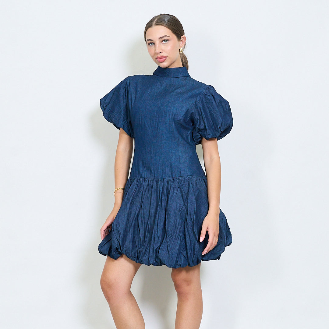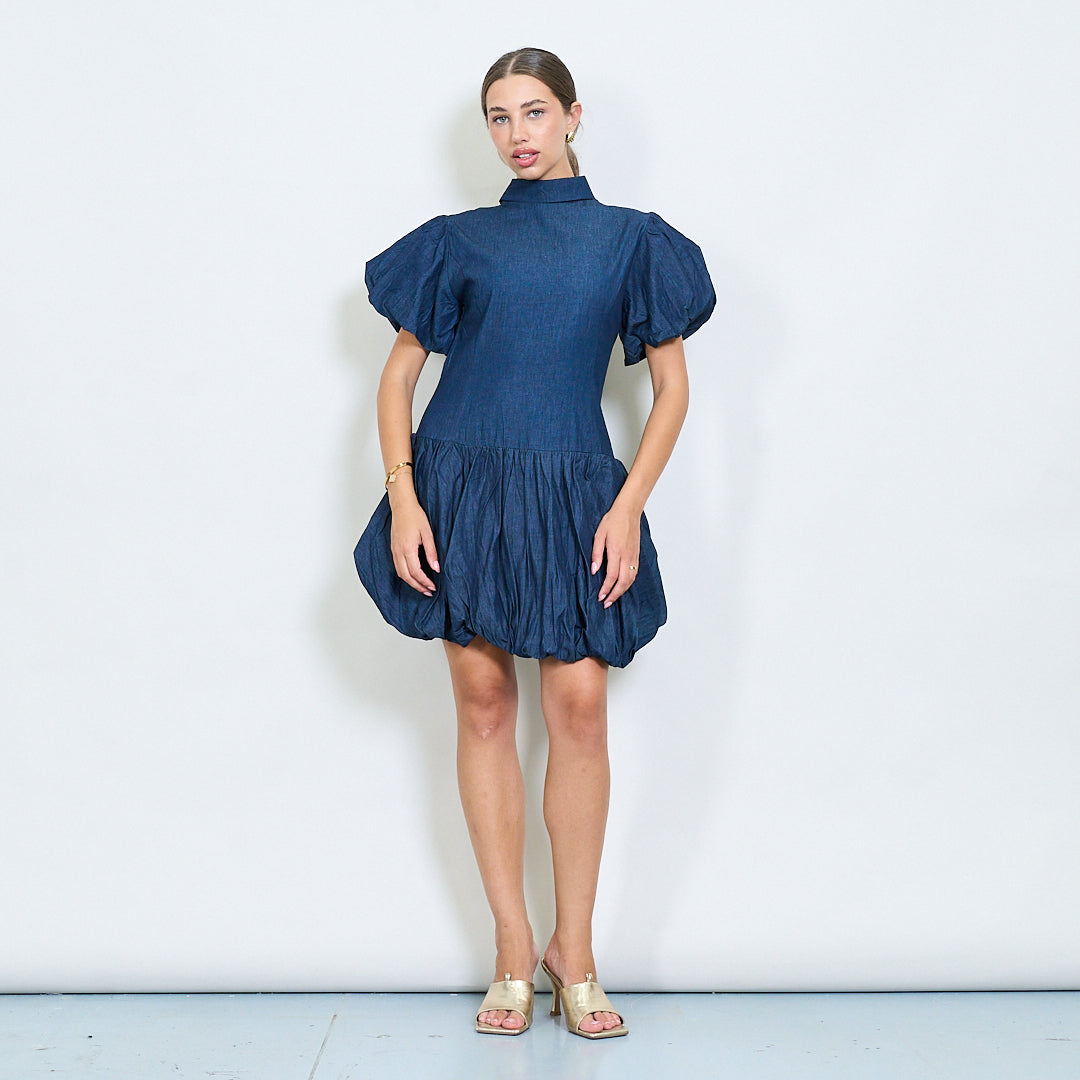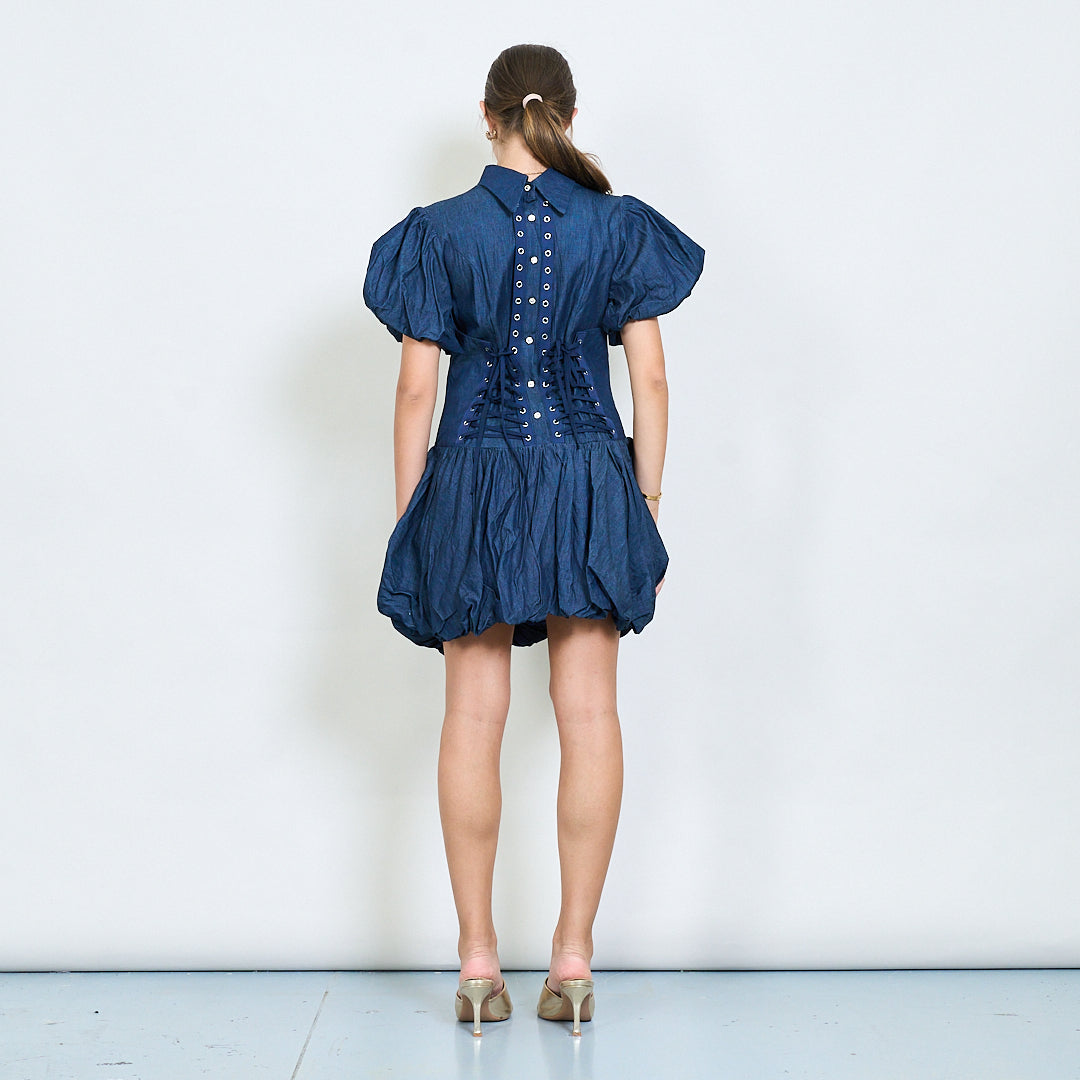 Strukturerad denim Puff-Sleeve Mini-klänning med snörning Corset Detail Partihandel