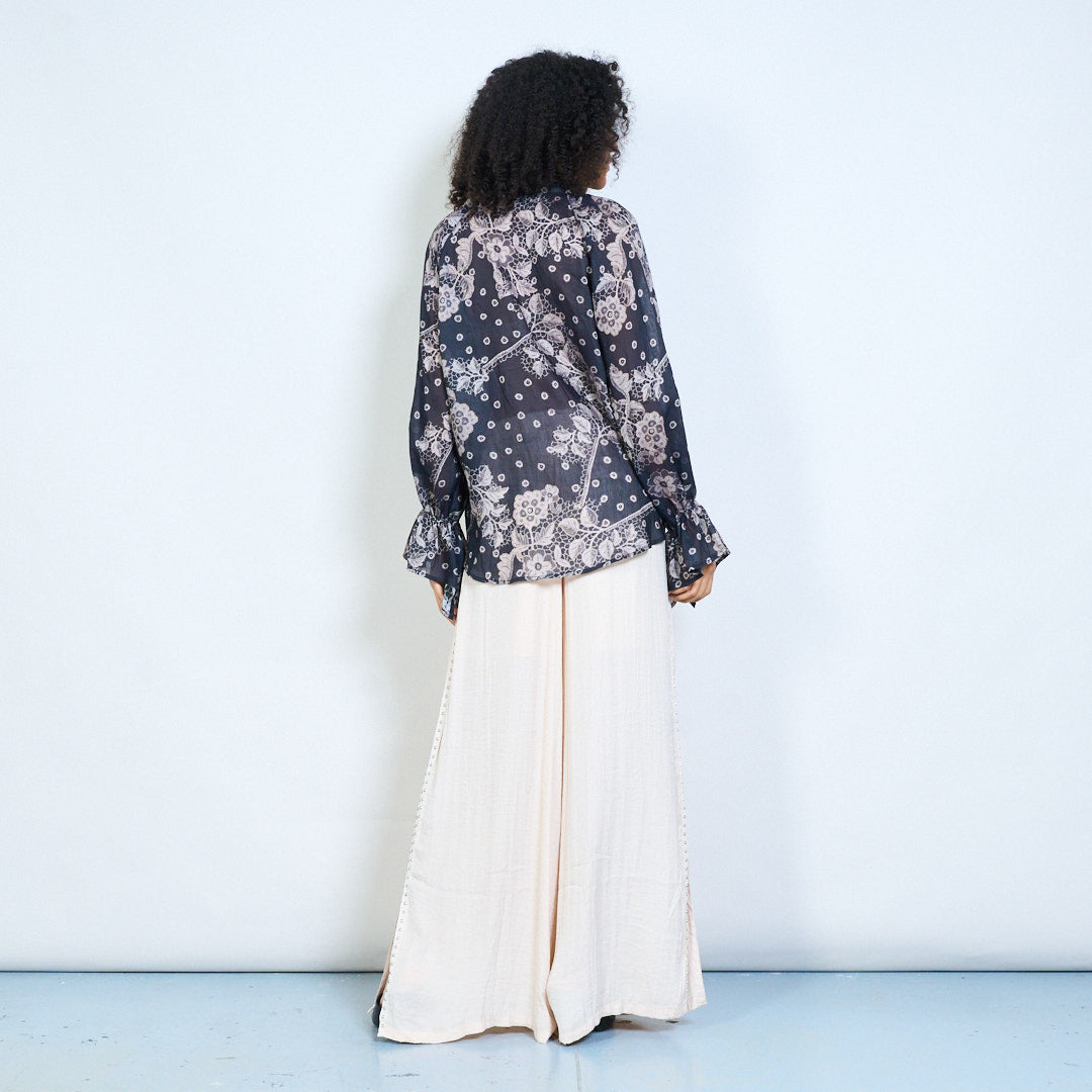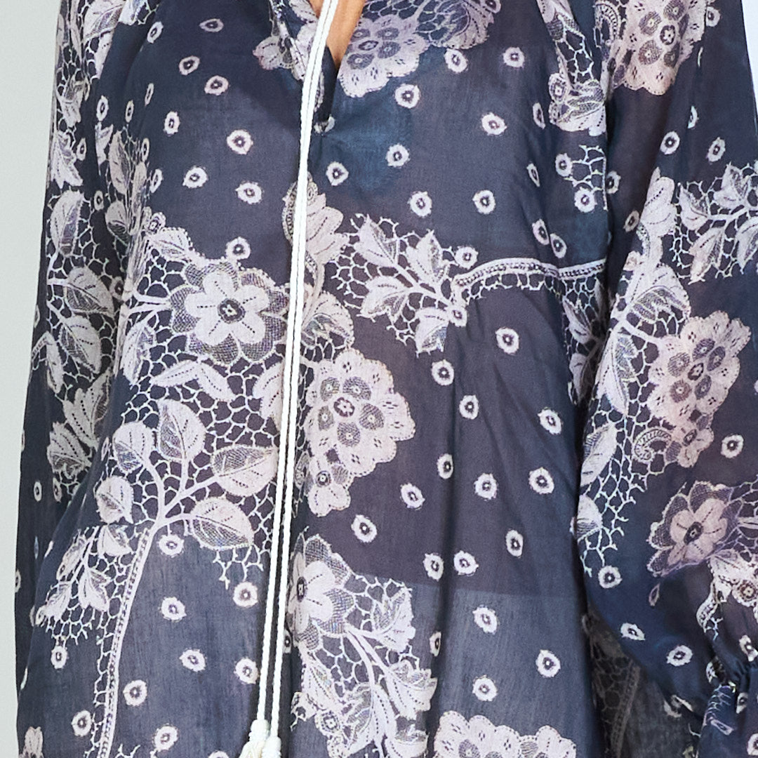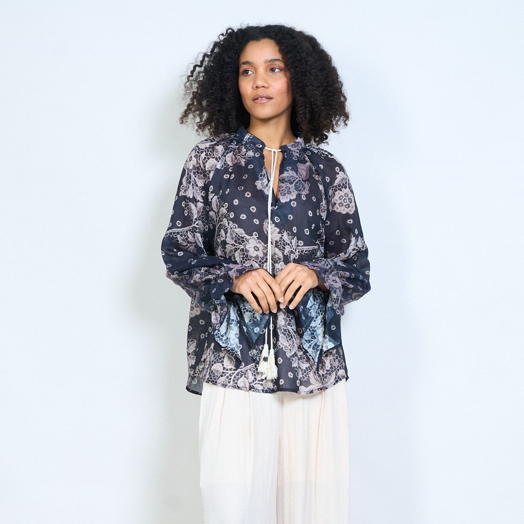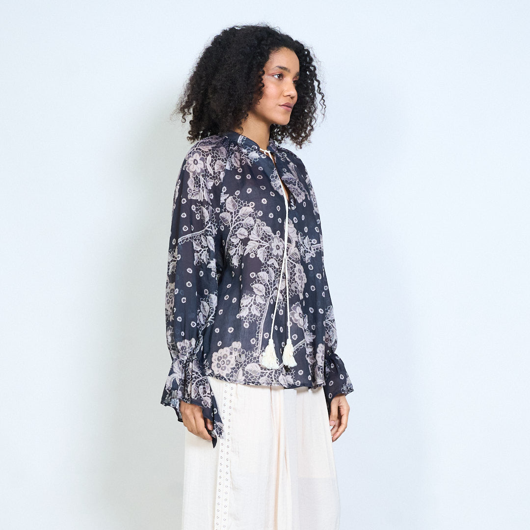 Blommig grafisk tofs tie hals långärmad blus grossist