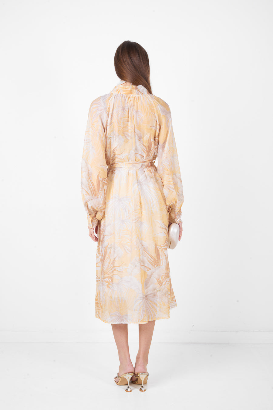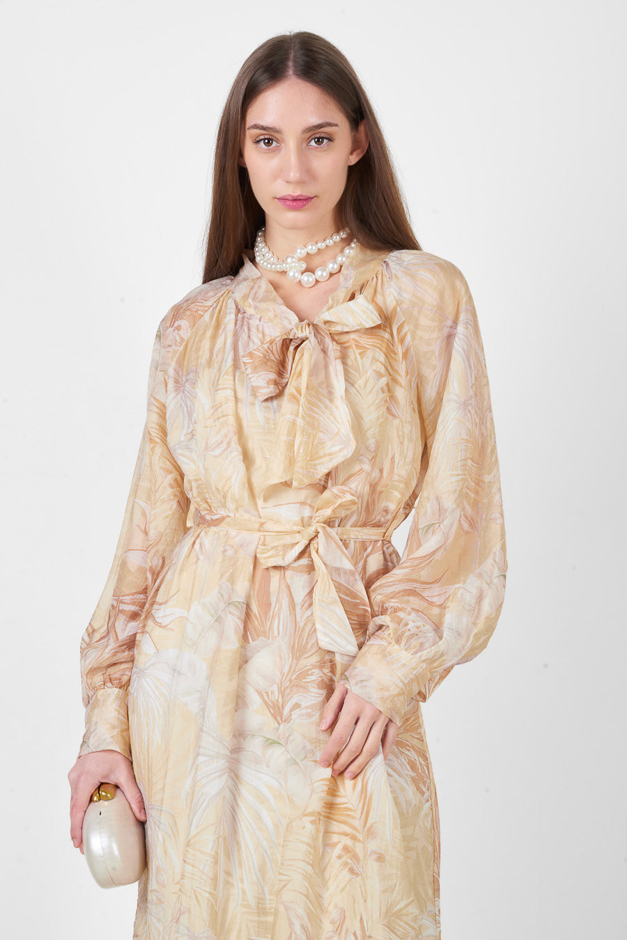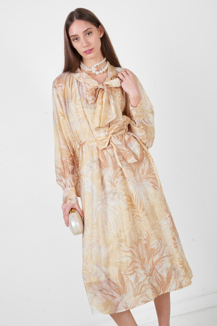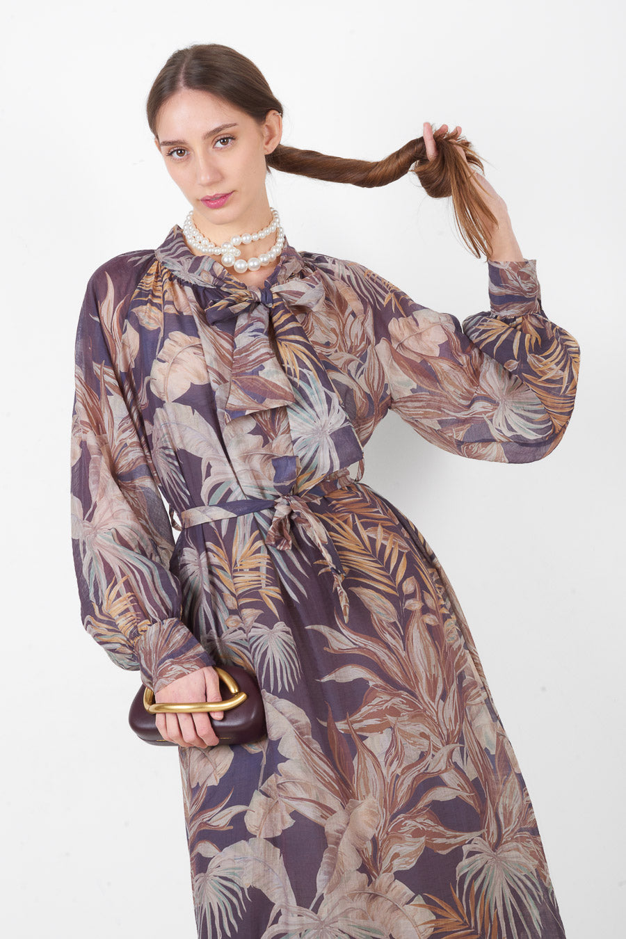 Blommönster tryckt tie hals bälte långärmad midiklänning partihandel