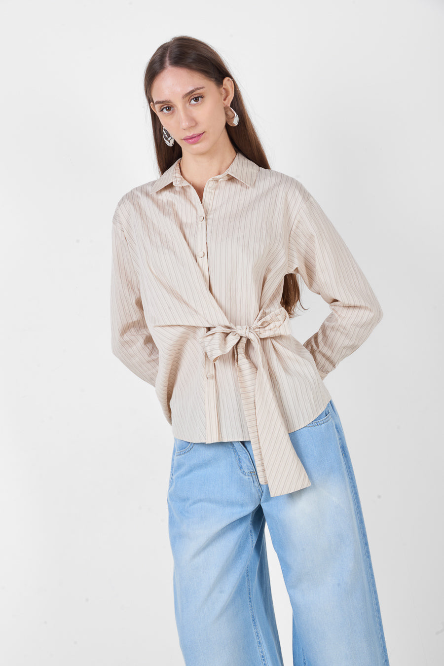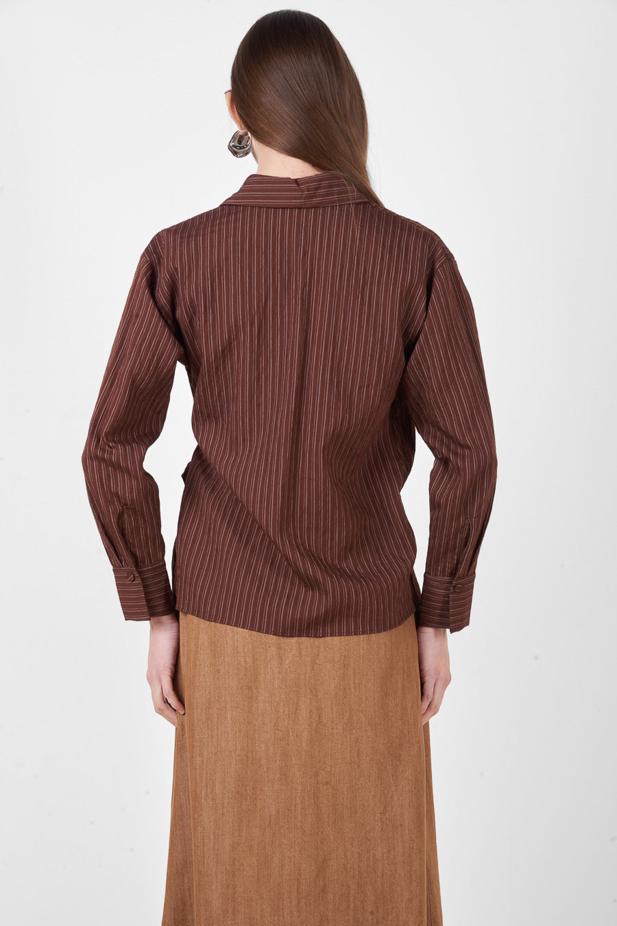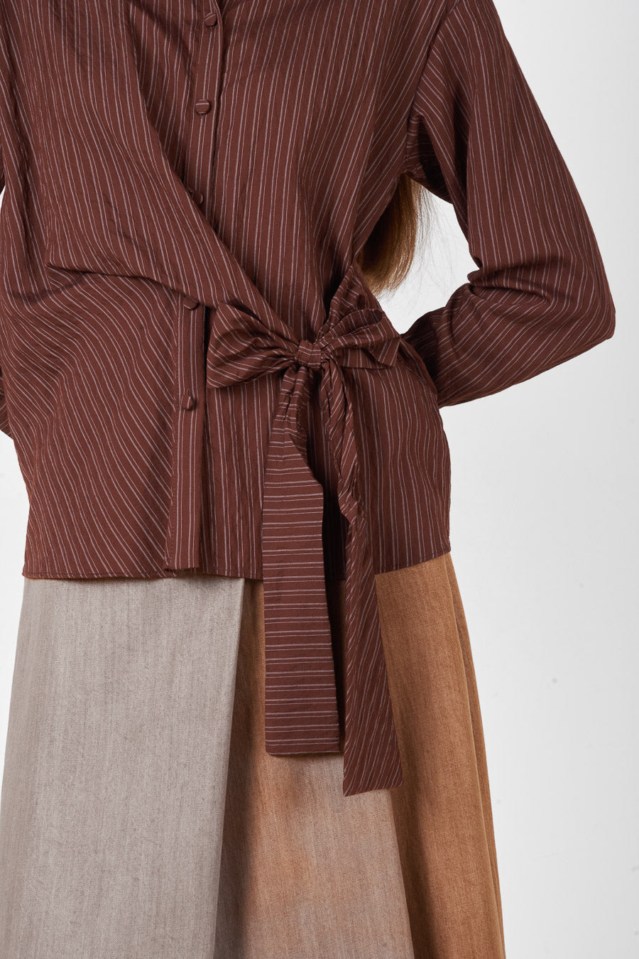 Randig tryckt tie front krage långärmad skjorta partihandel