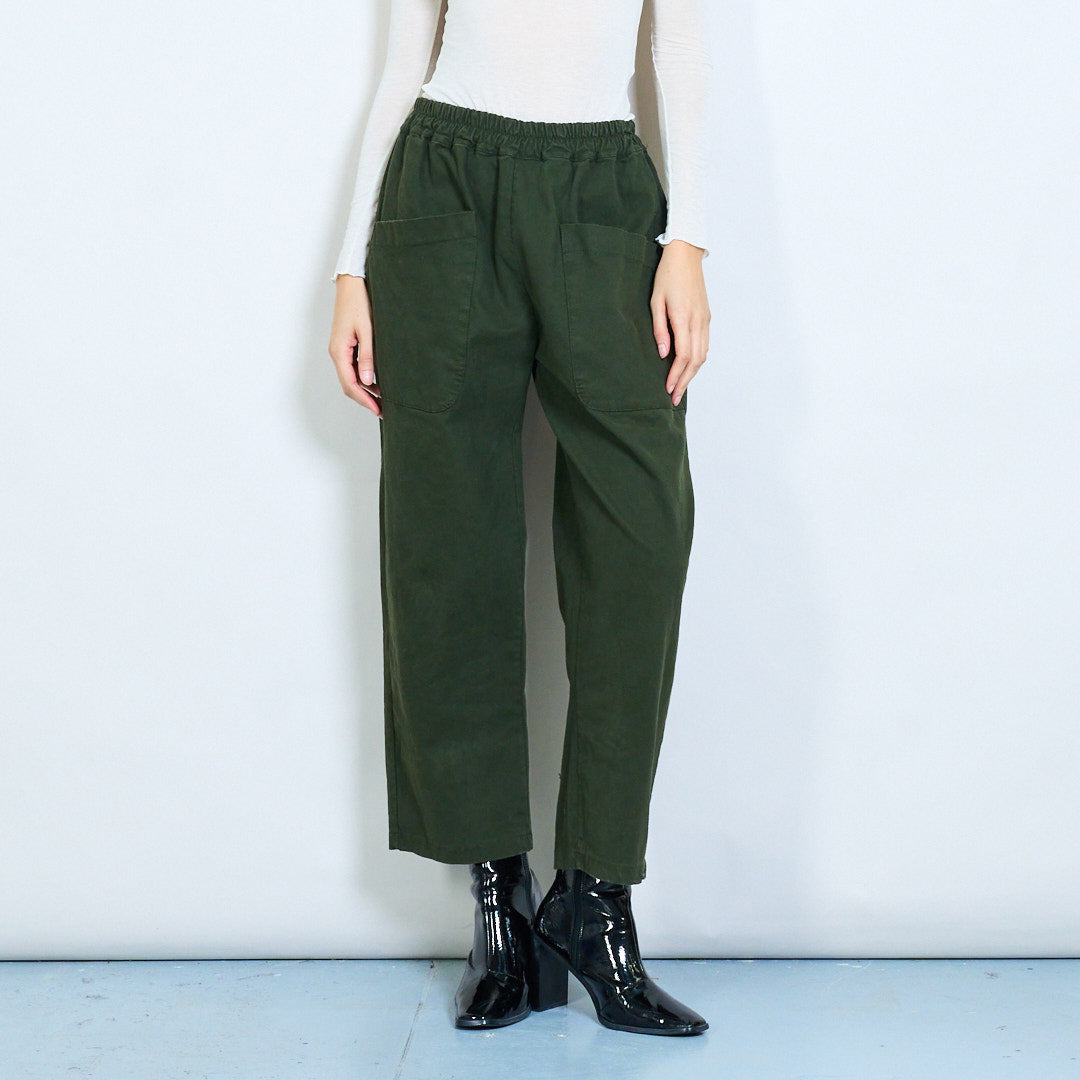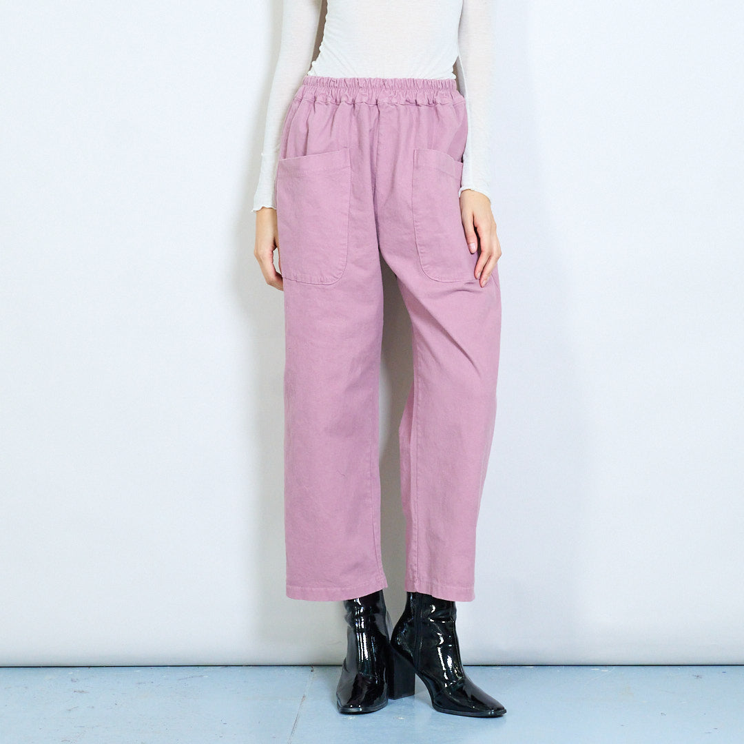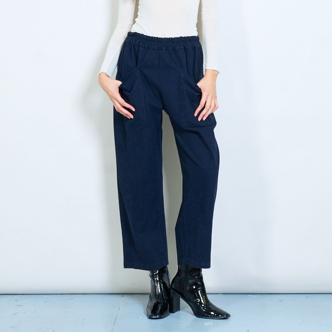 Bred benhög midja elastiska byxor med frontfickor grossist
