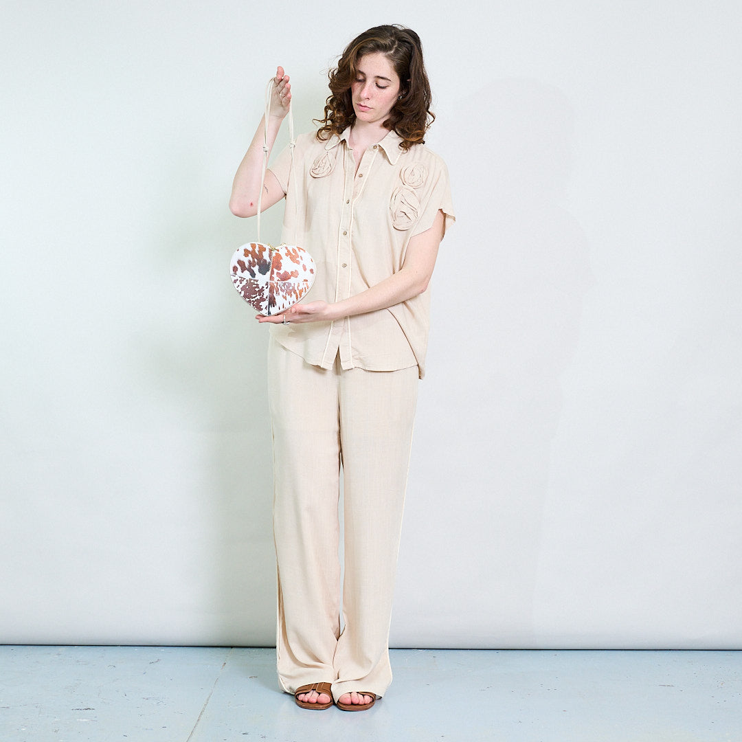 - Unik hjärtformad crossbody-väska med lapptäcke faux kohudpaneler