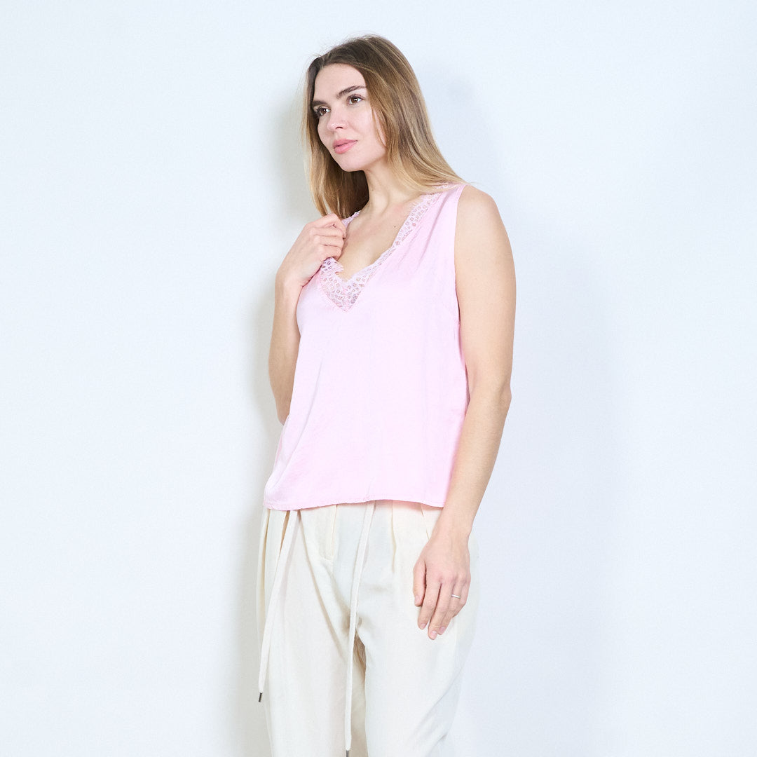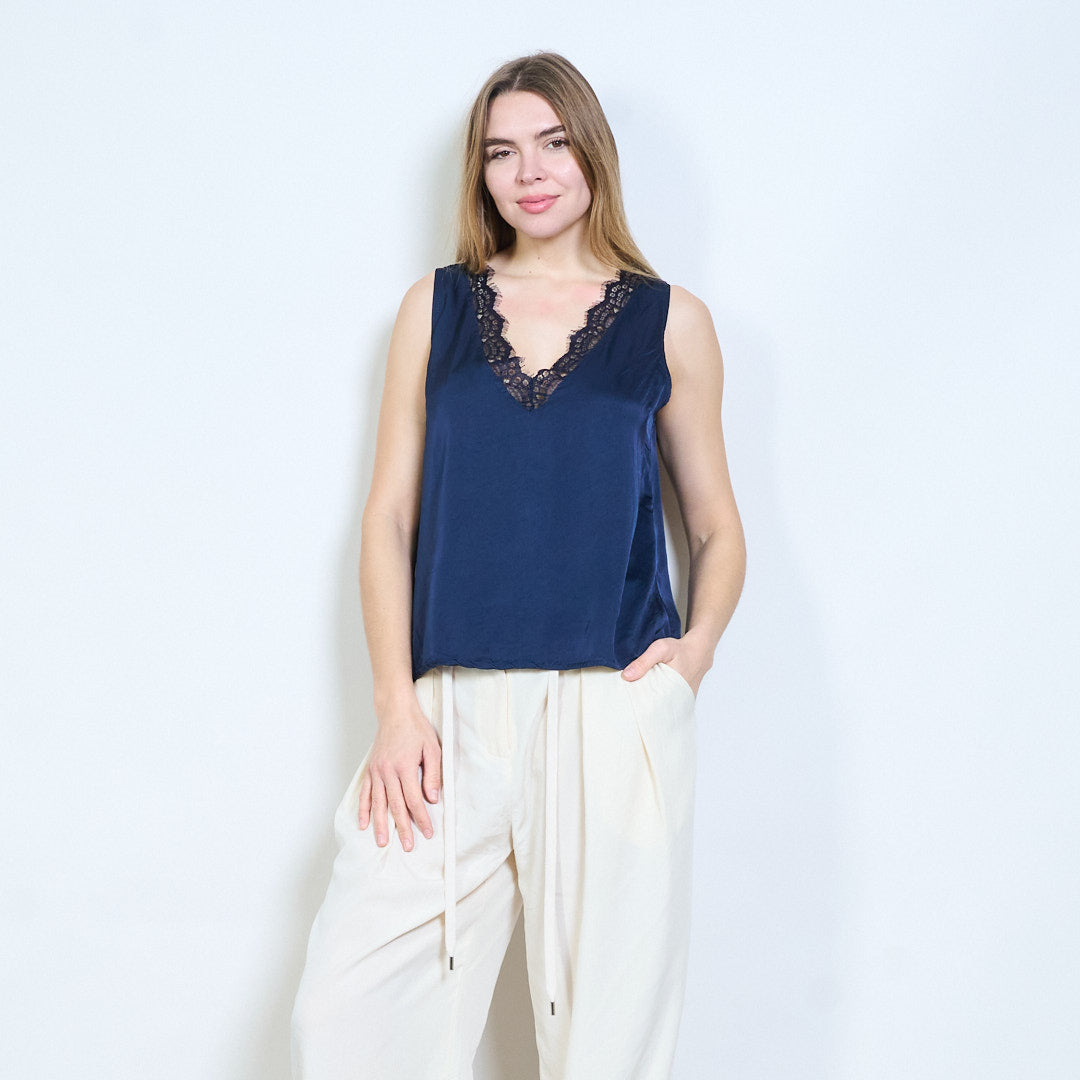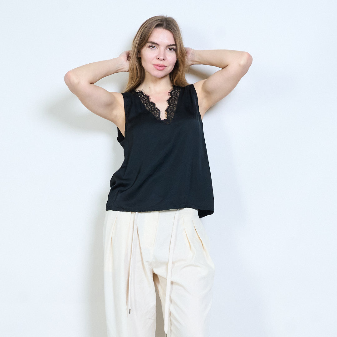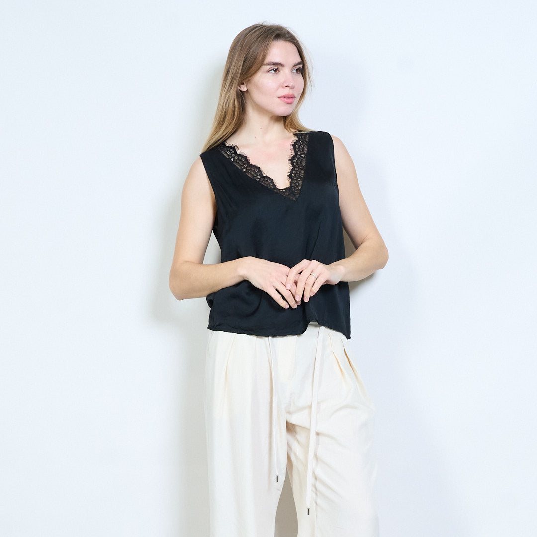 Avslappnad ärmlös topp med spetsad halsringning detaljhandel