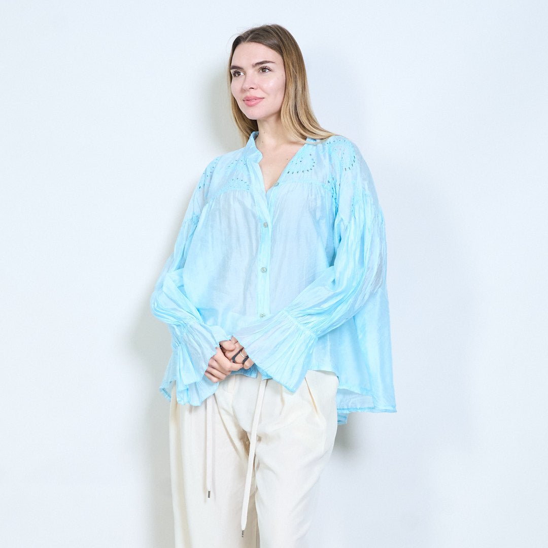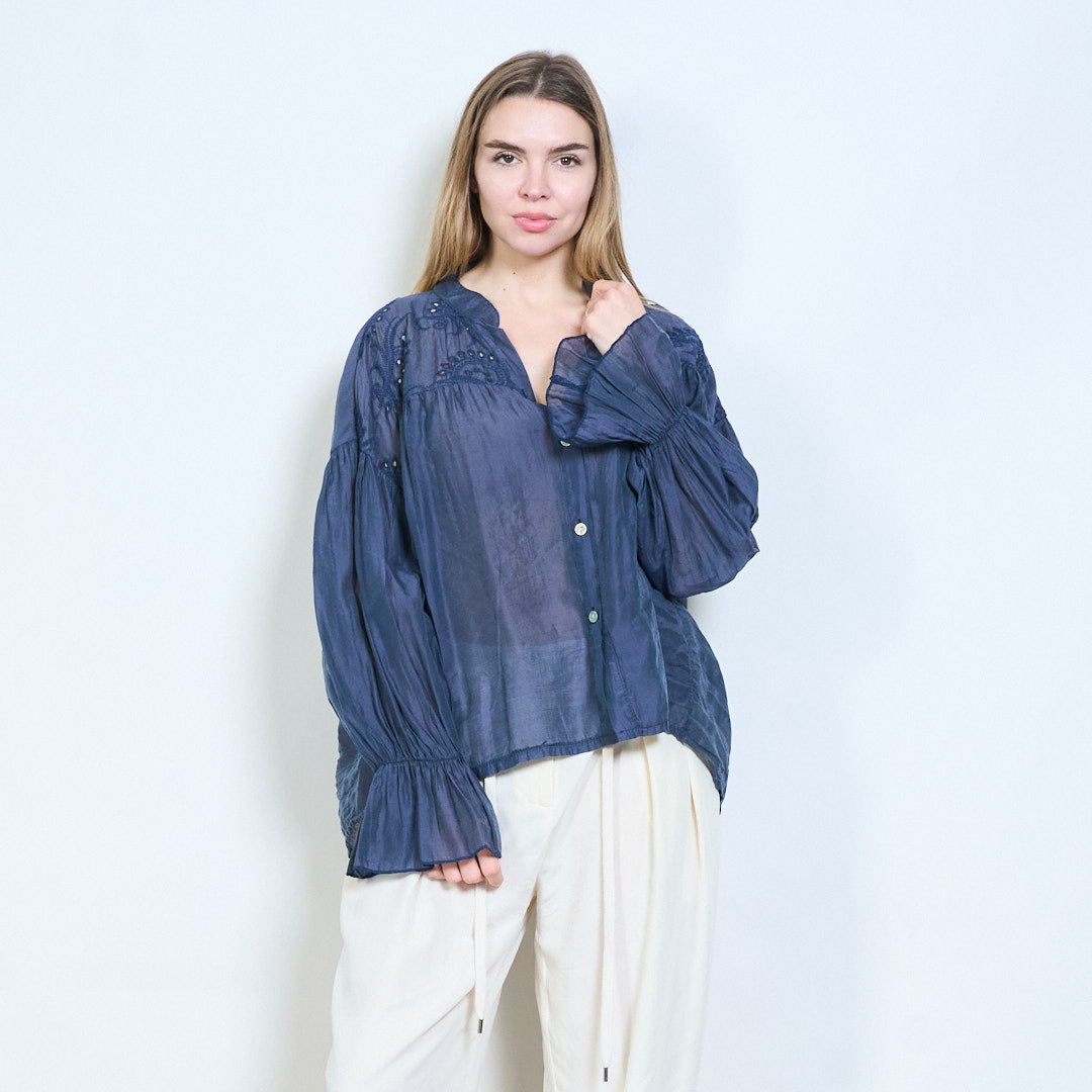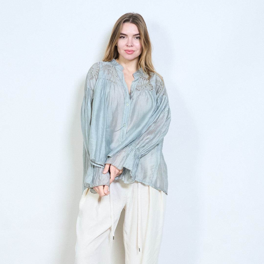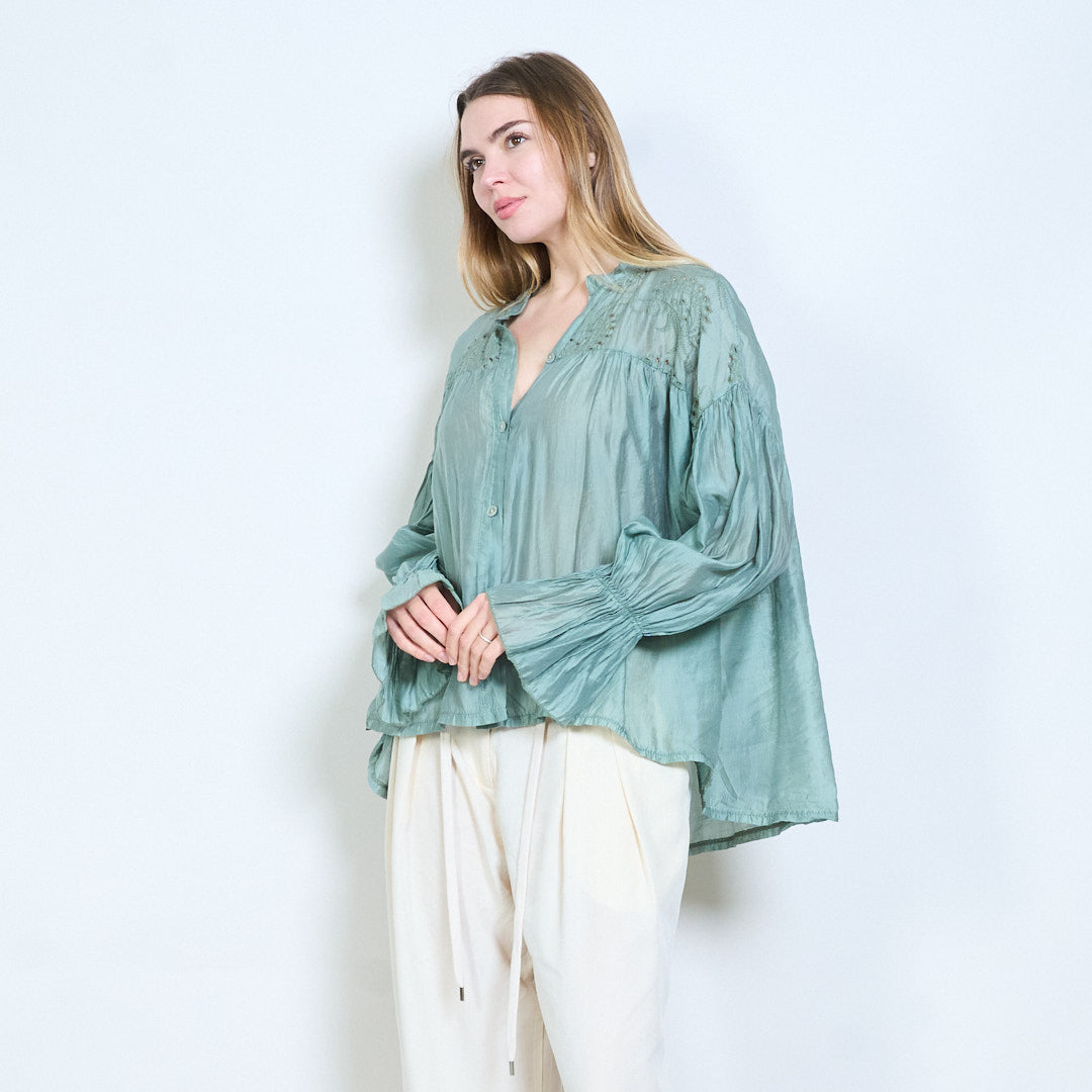 Blommig broderad knapp-framtill skirt utseende långärmad blus i grossistledet