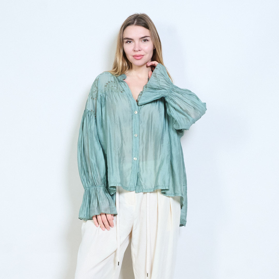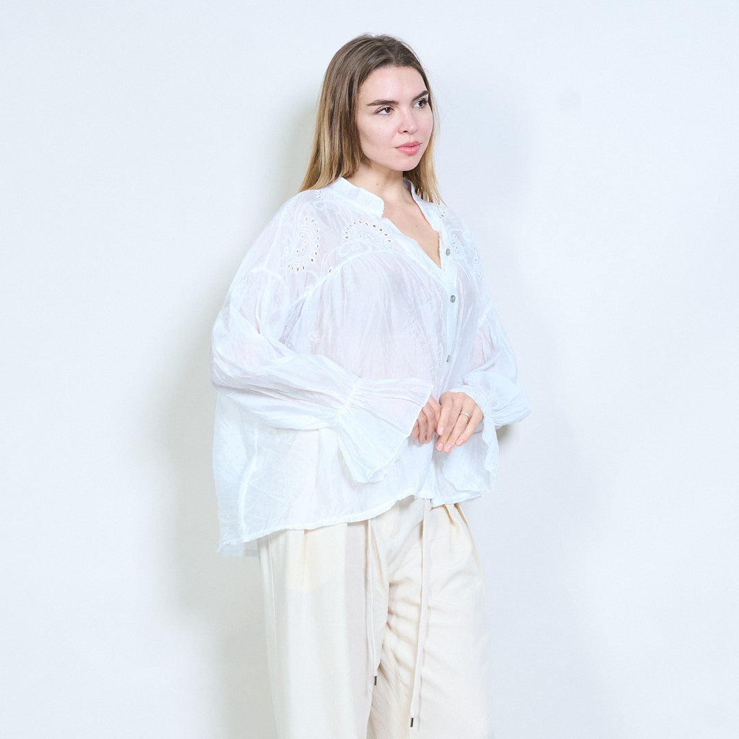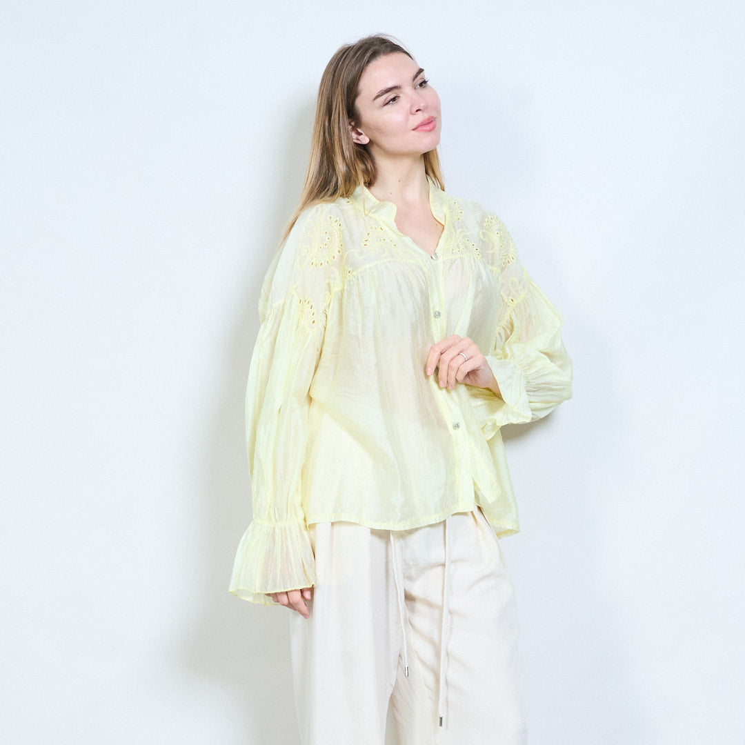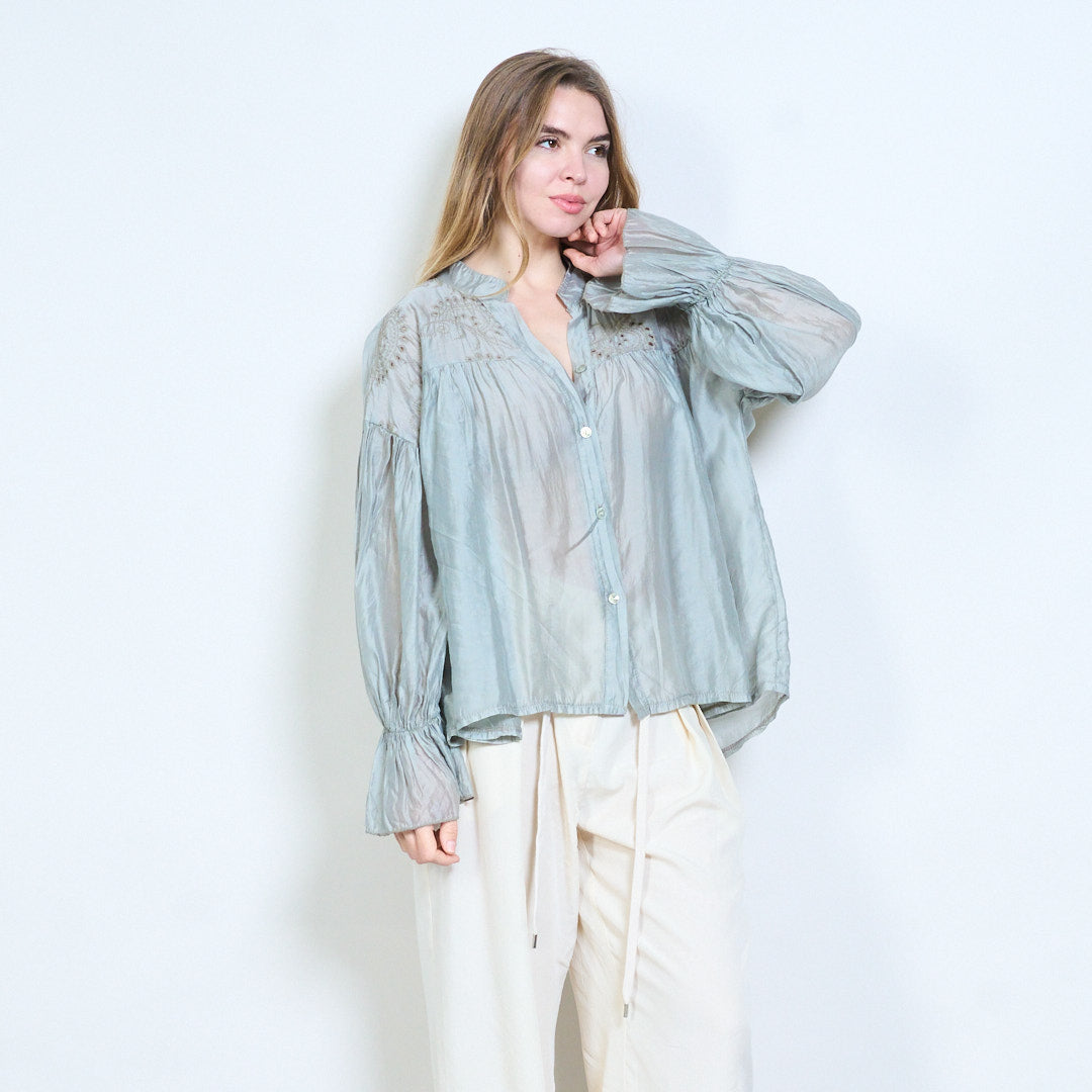 Blommig broderad knapp-framtill skirt utseende långärmad blus i grossistledet