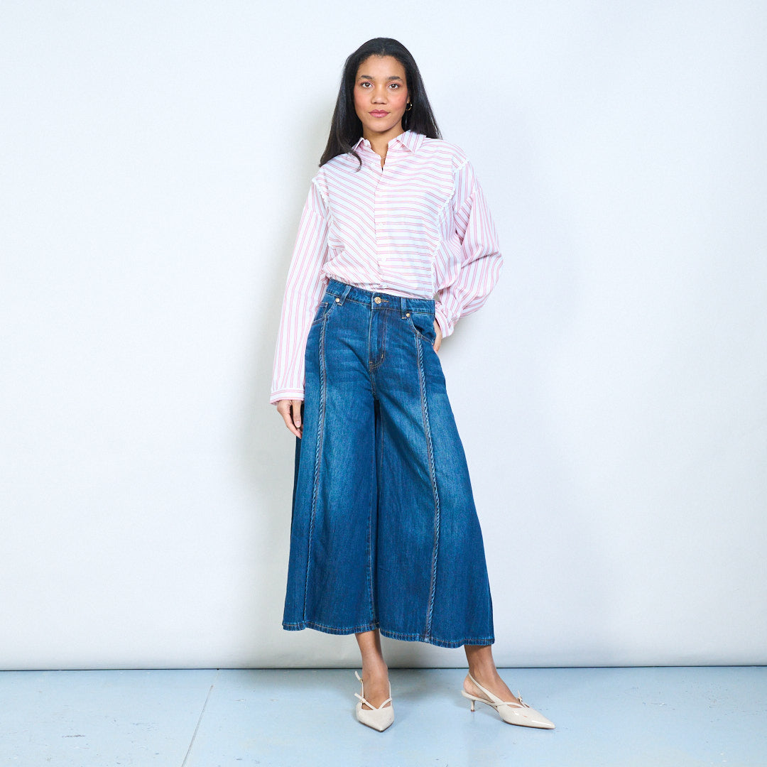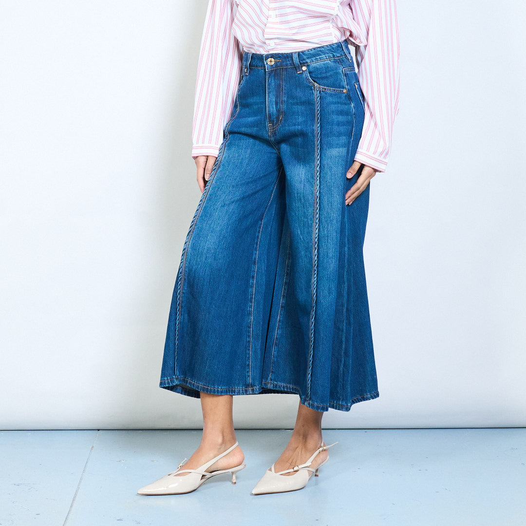- Dekorativa kontrastsömsdetaljer som löper längs benen för extra struktur