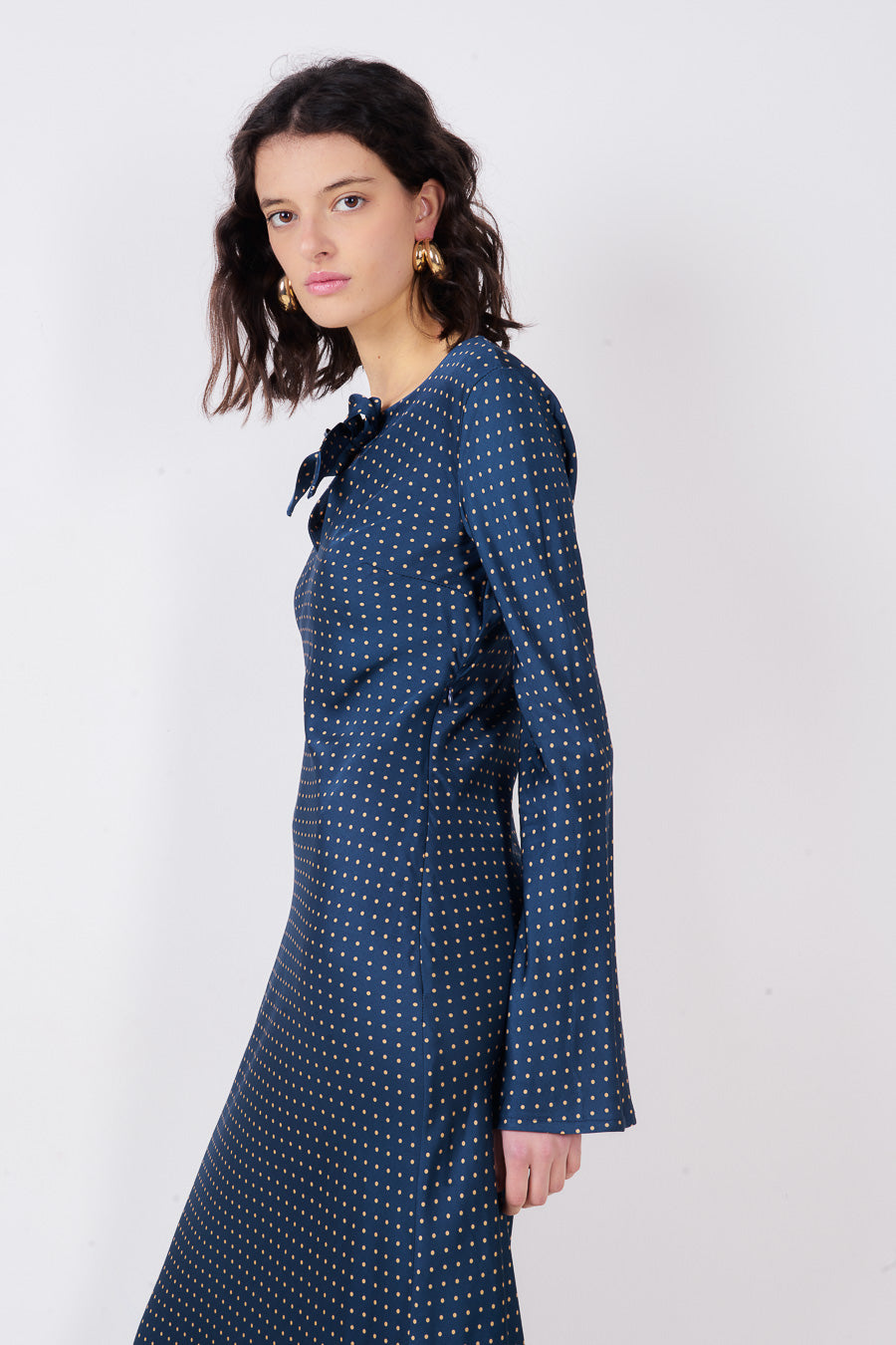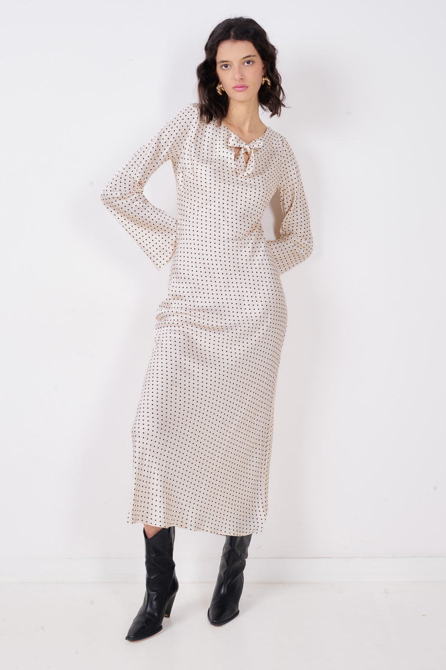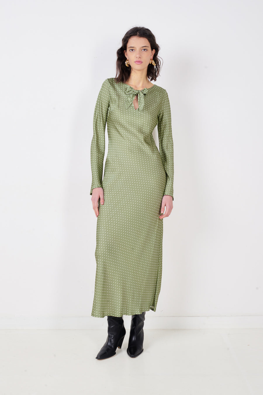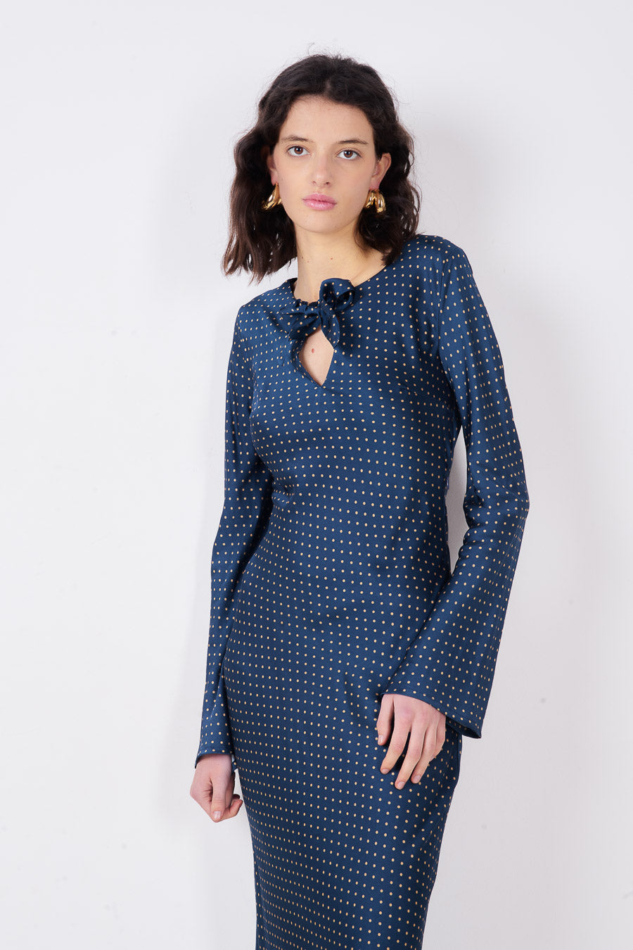 Polka dot rosett hals nyckelhål långärmad midiklänning partihandel