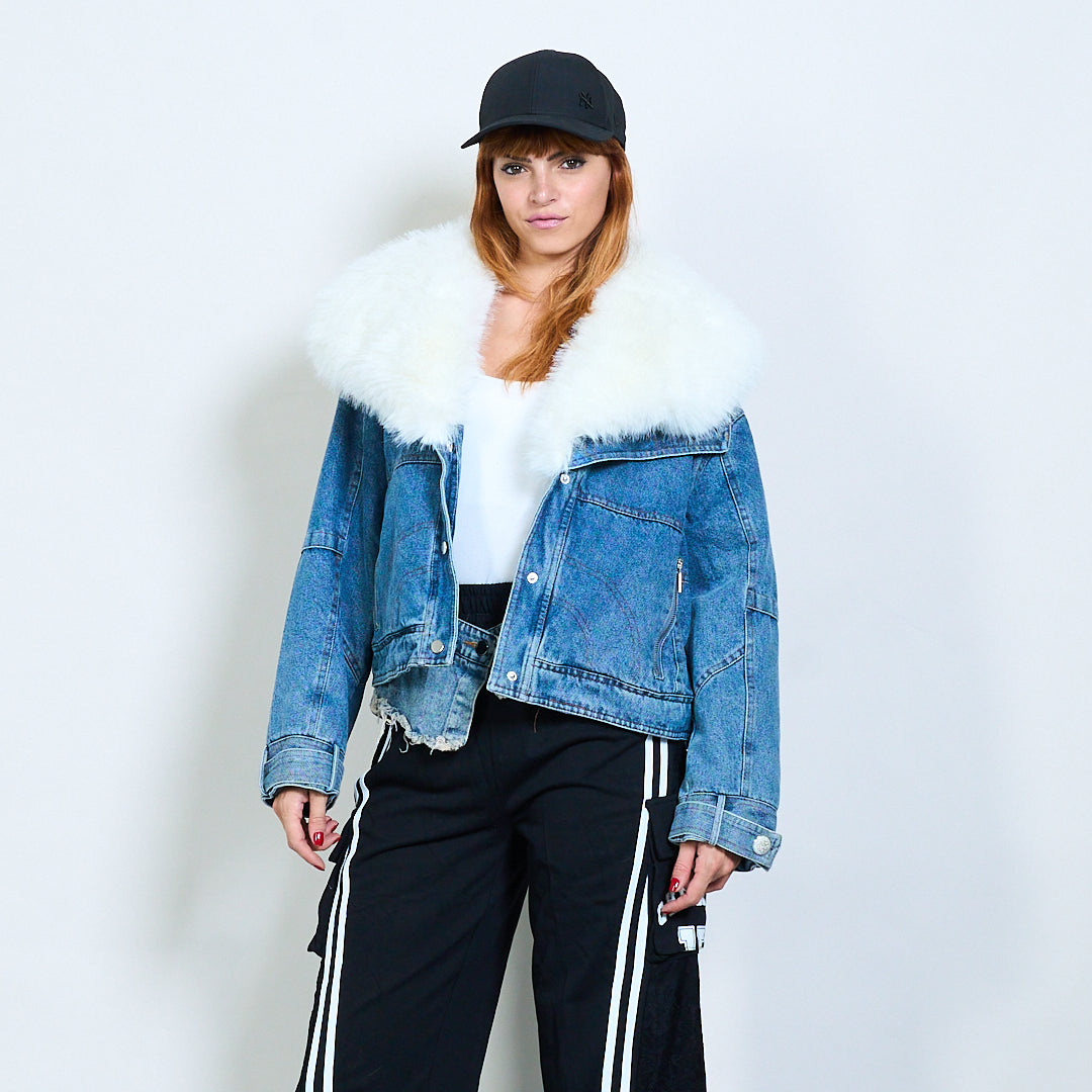 Överdimensionerad faux pälskrage beskuren denimjacka grossist