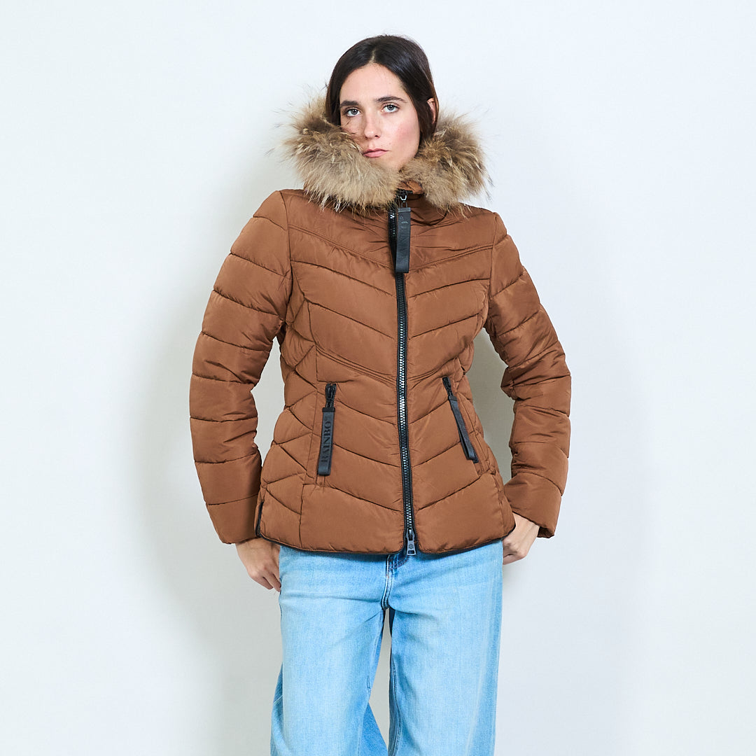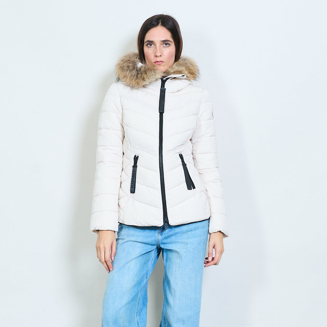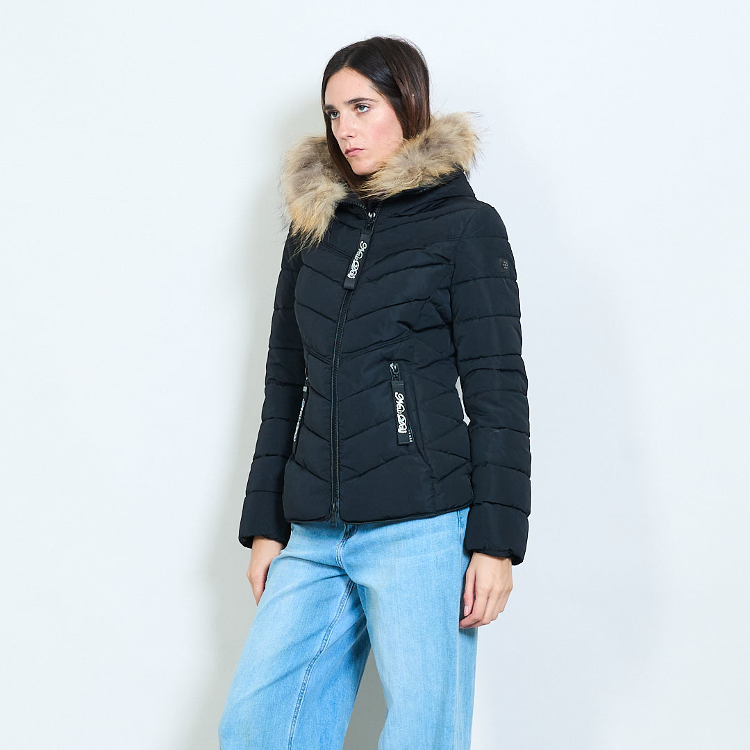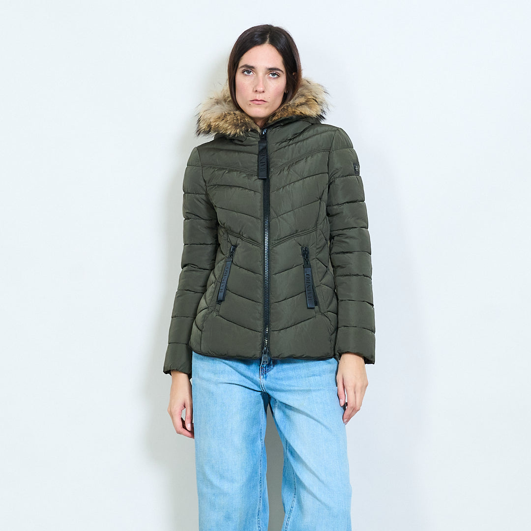 Quiltad zip-up pufferjacka med faux päls detalj grossist