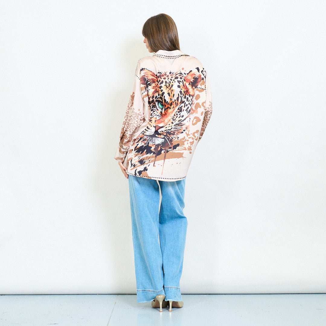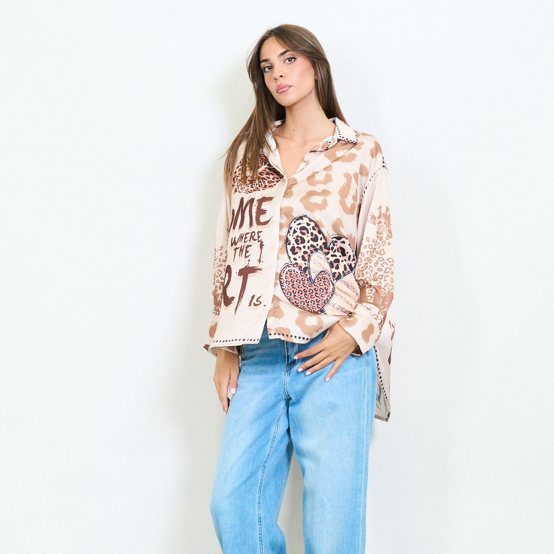 Grafisk leopardtryck "Hem är där konsten är" blus grossist