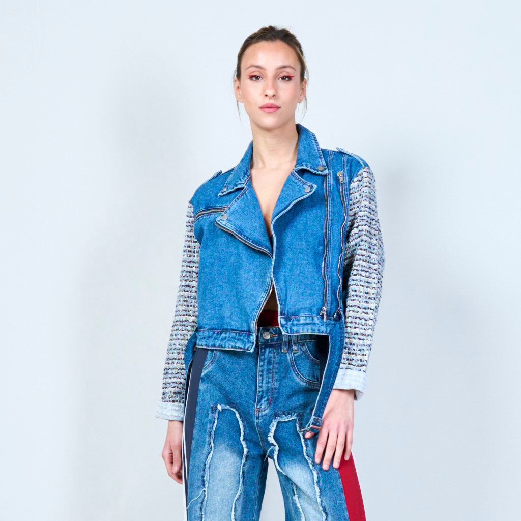 Tweed Sleeve Denim Biker Jacket grossist