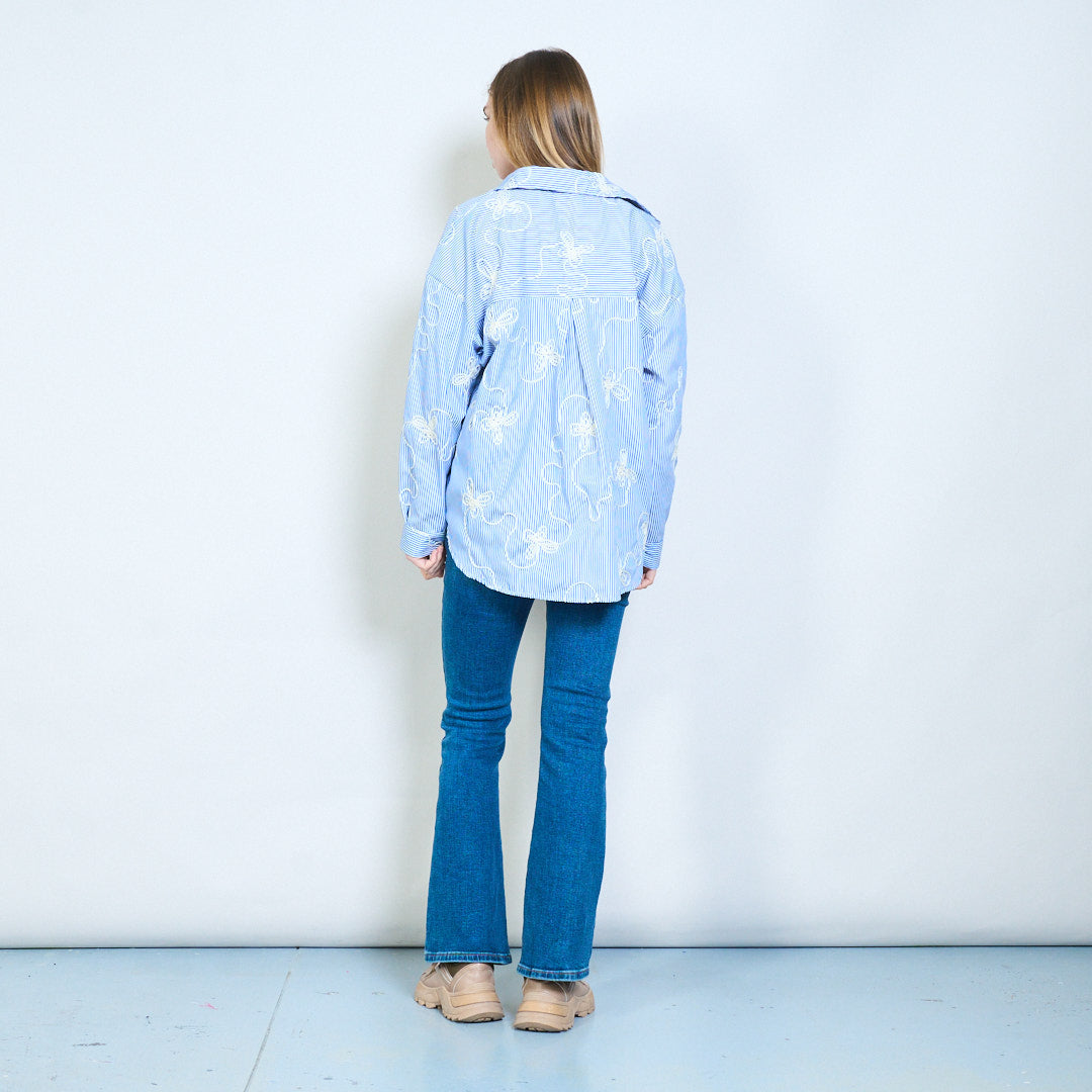 Broderad linje grafisk randig öppen krage långärmad skjorta grossist