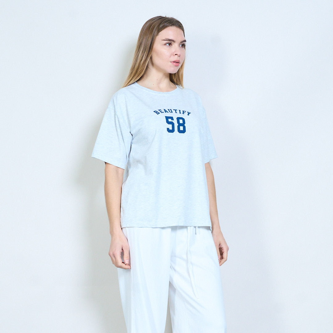 Tryckt kortärmad t-shirt grå med "beautify 58" bokstäver partihandel