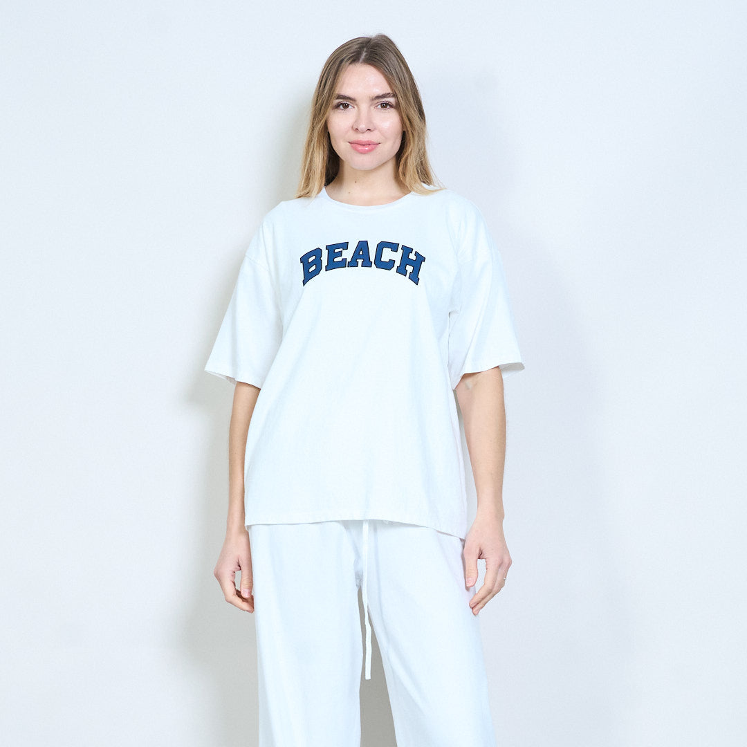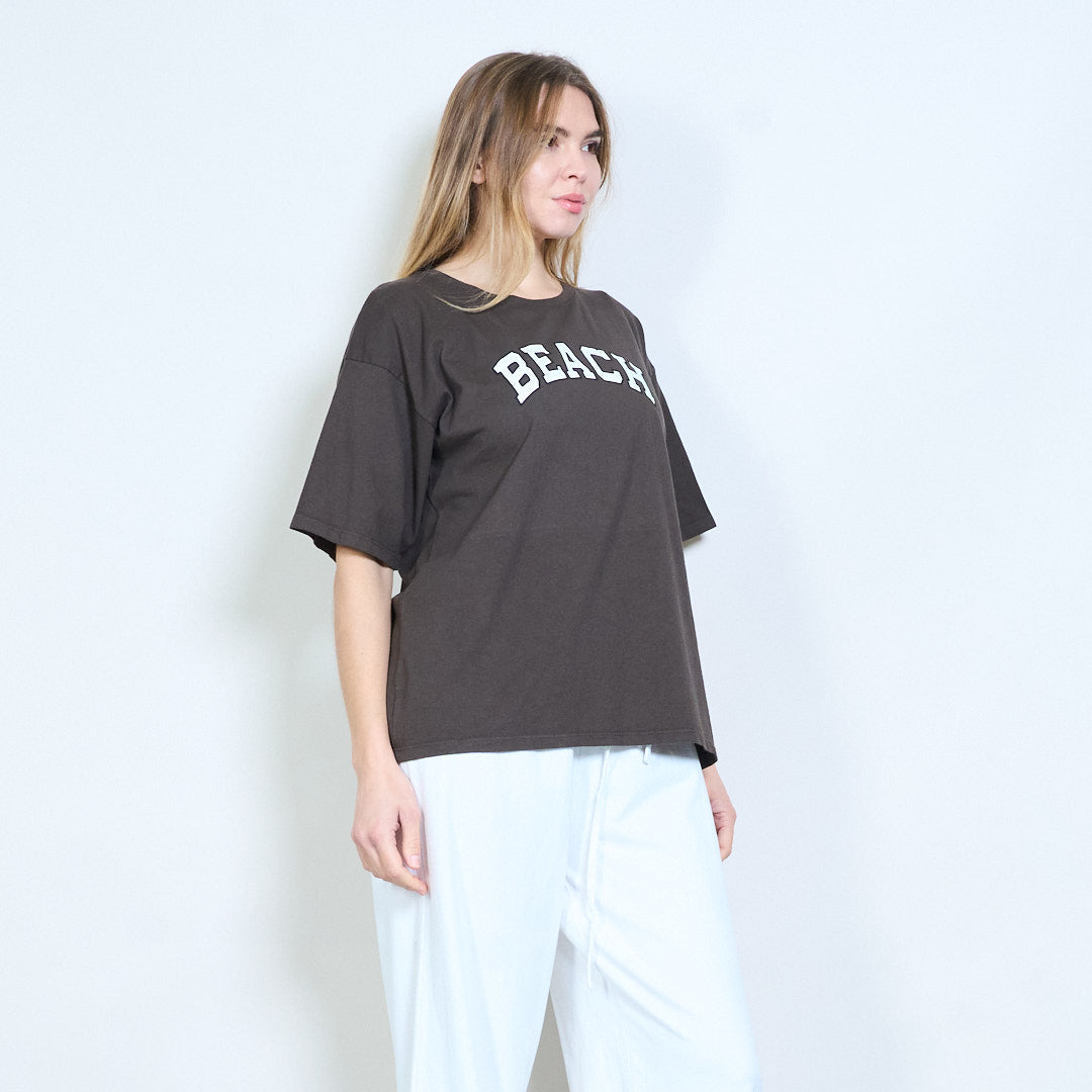 Tryckt kortärmad t-shirt med "strand" bokstäver i grossistledet