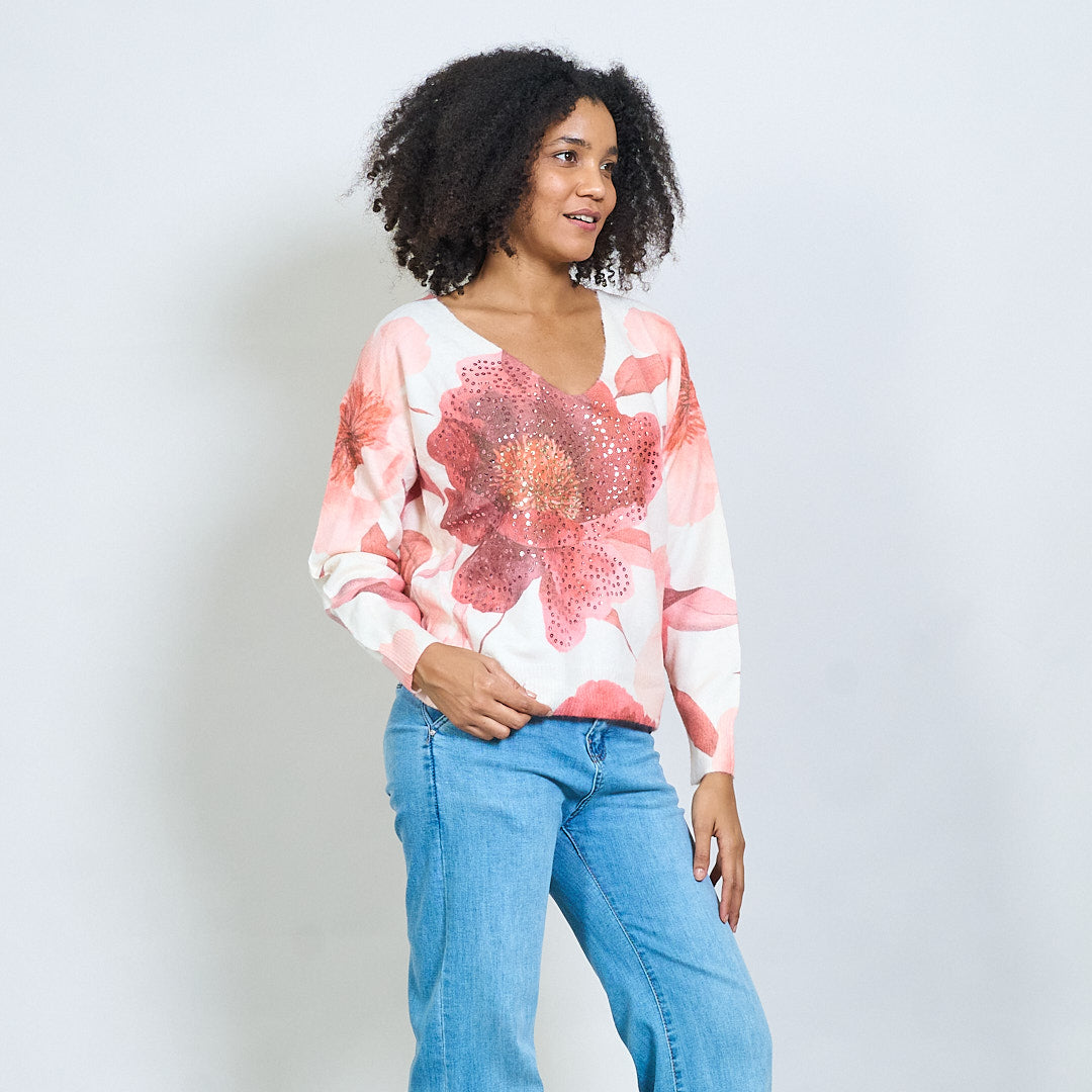 亮片花卉印花V领针织毛衣批发