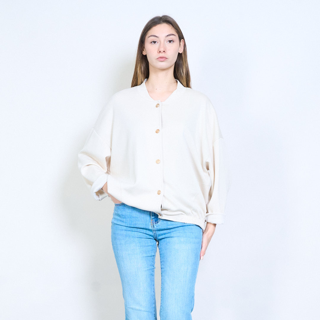 - 正面纽扣设计,带有金色装饰纽扣,触感精致