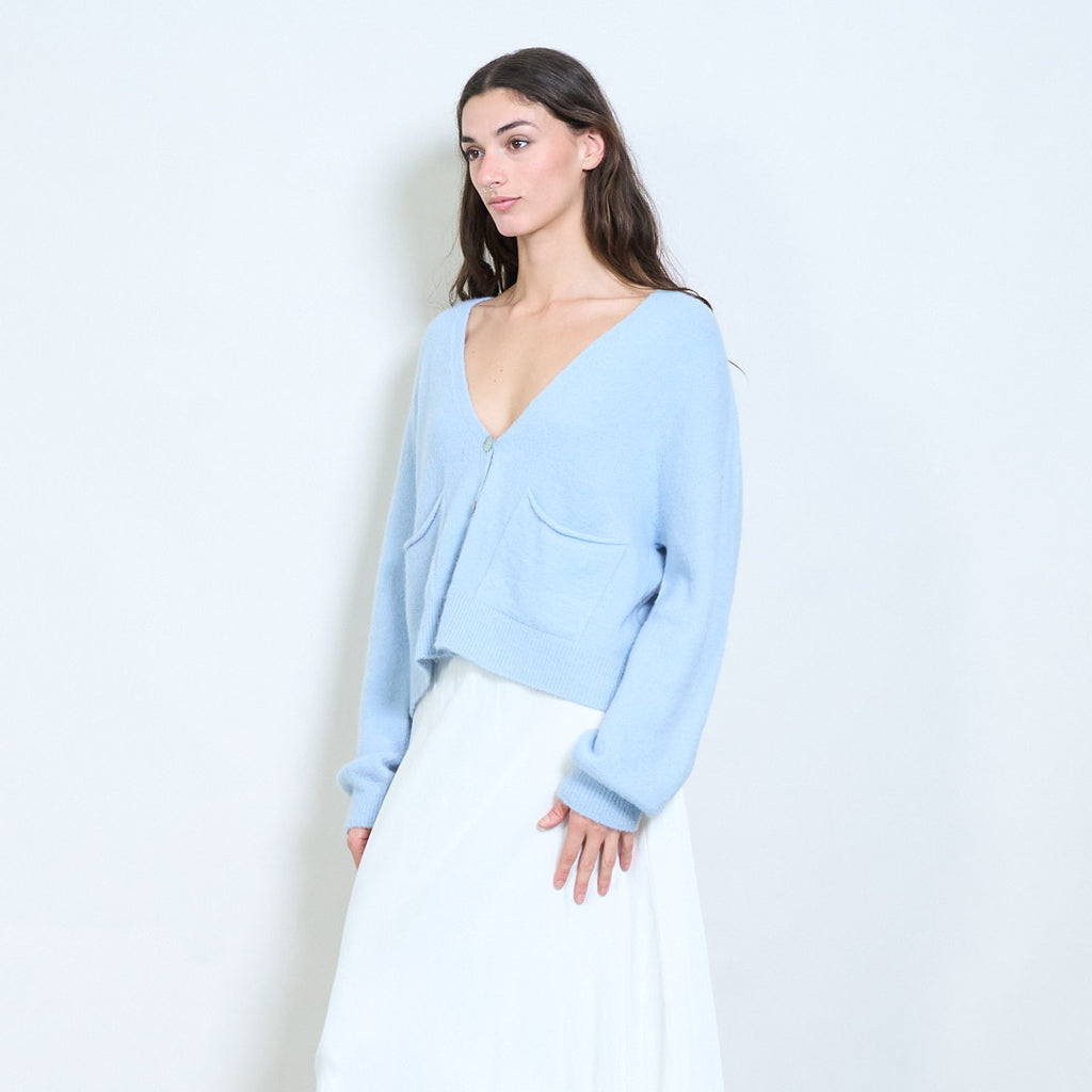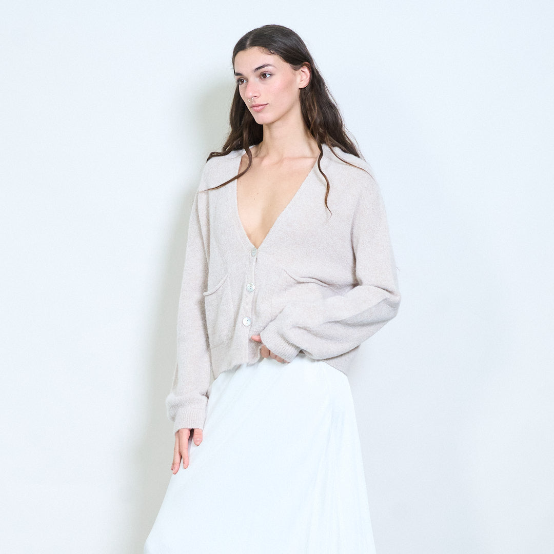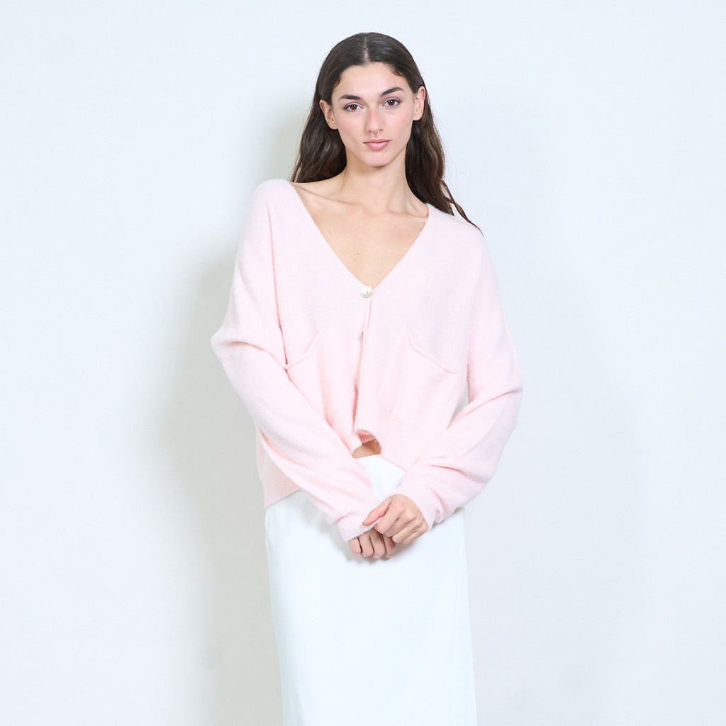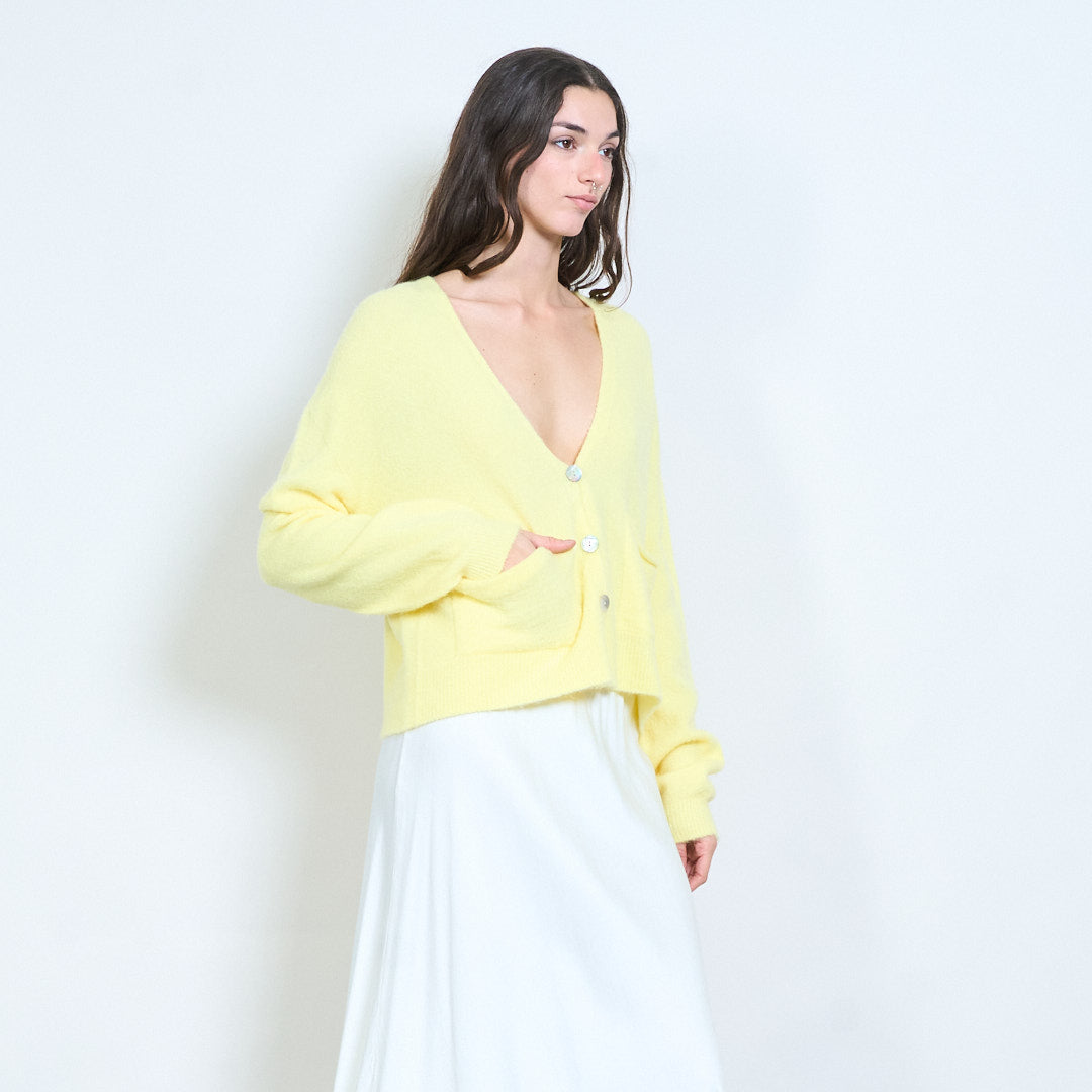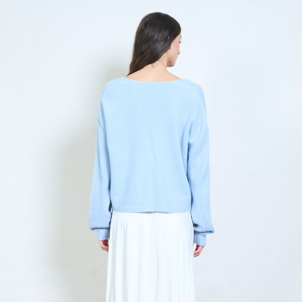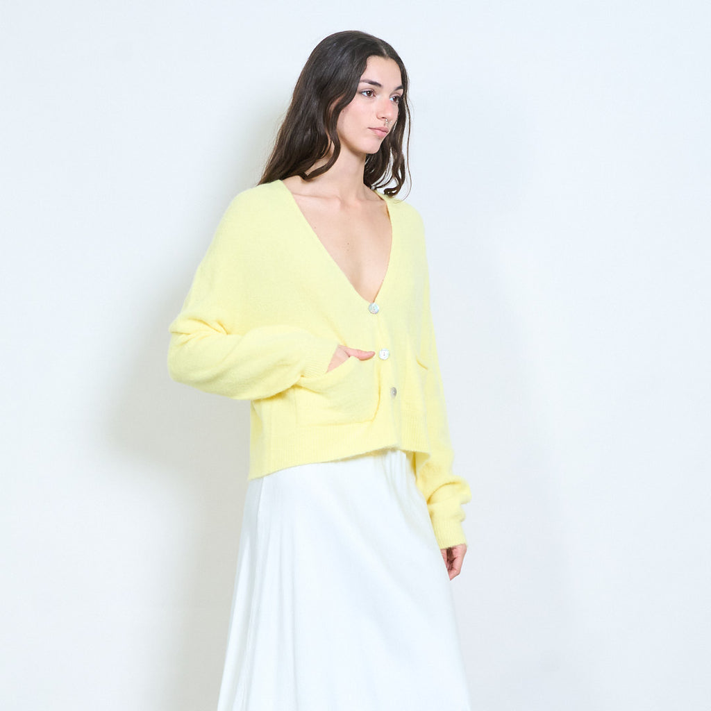 - 采用柔软 V 领设计,增添女性化且易于造型的廓形