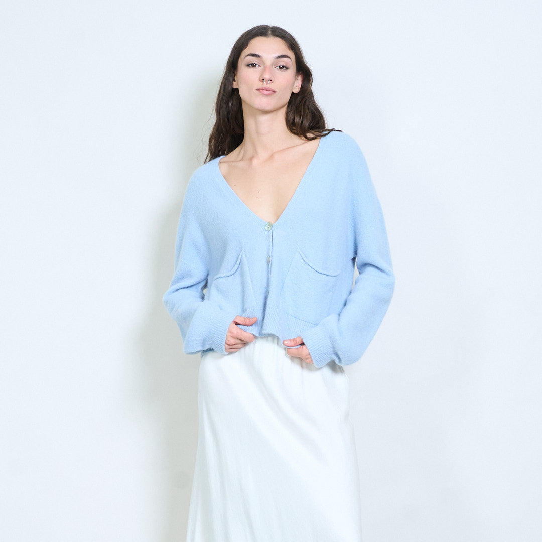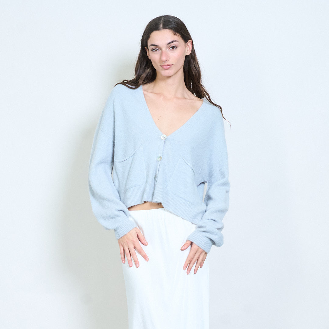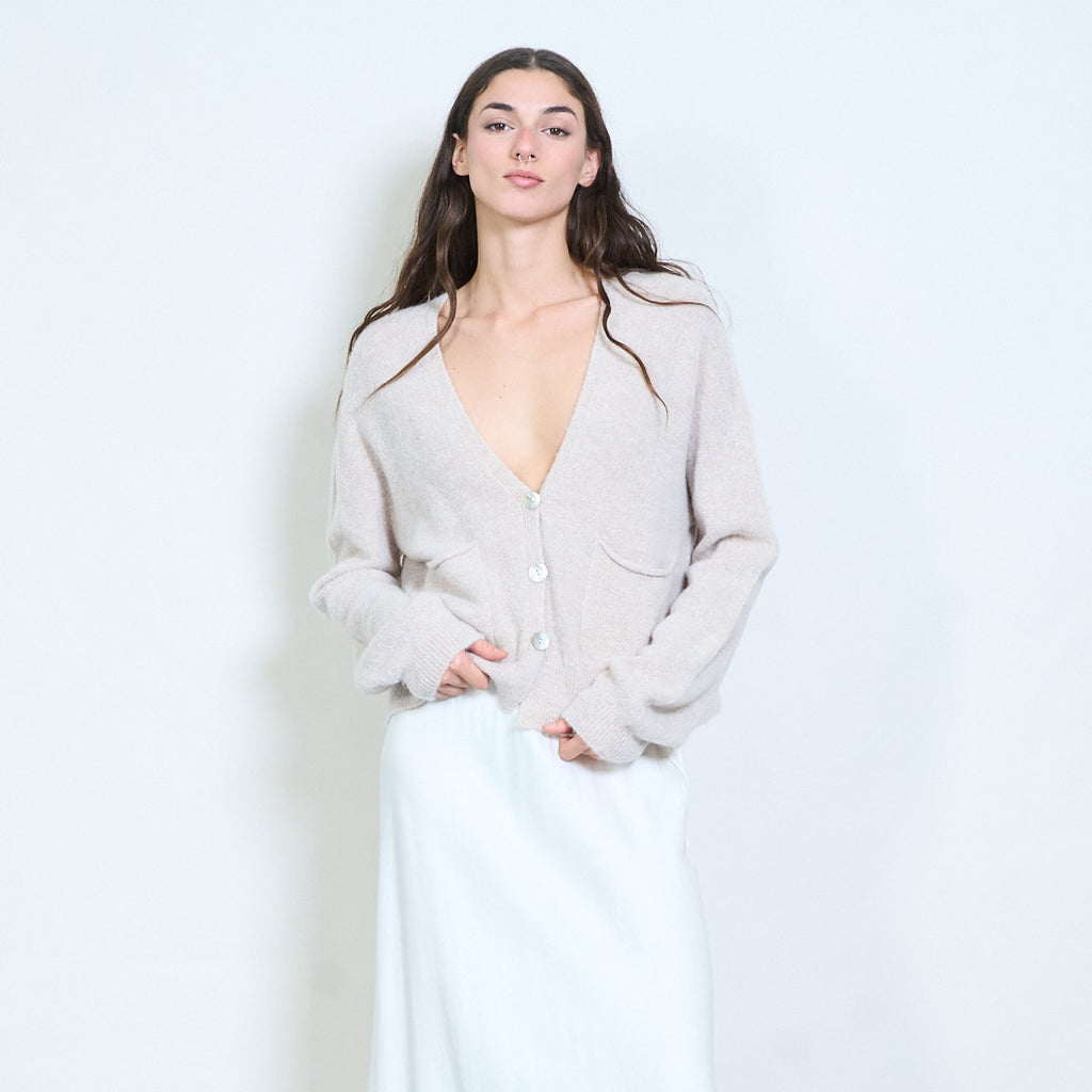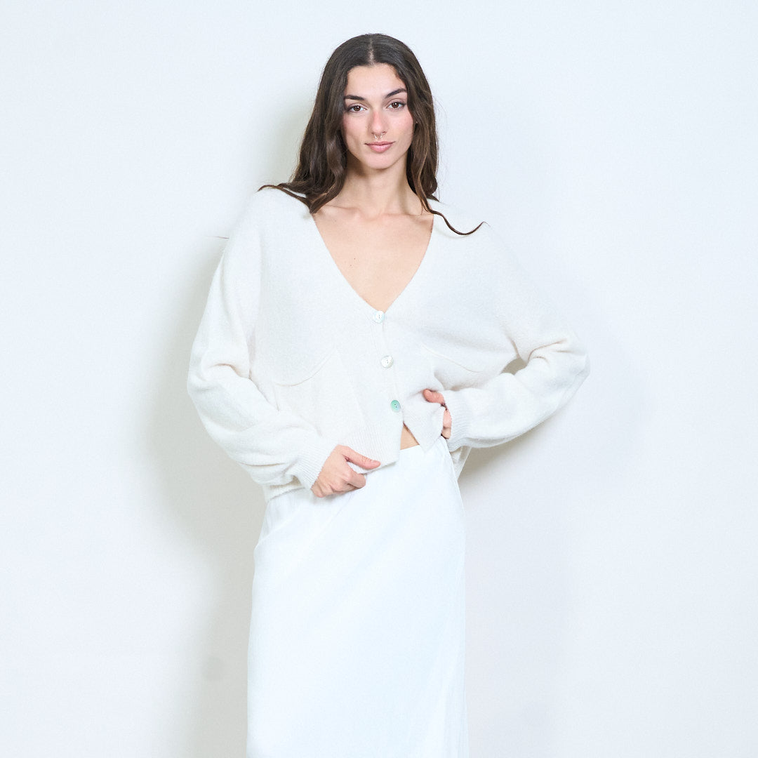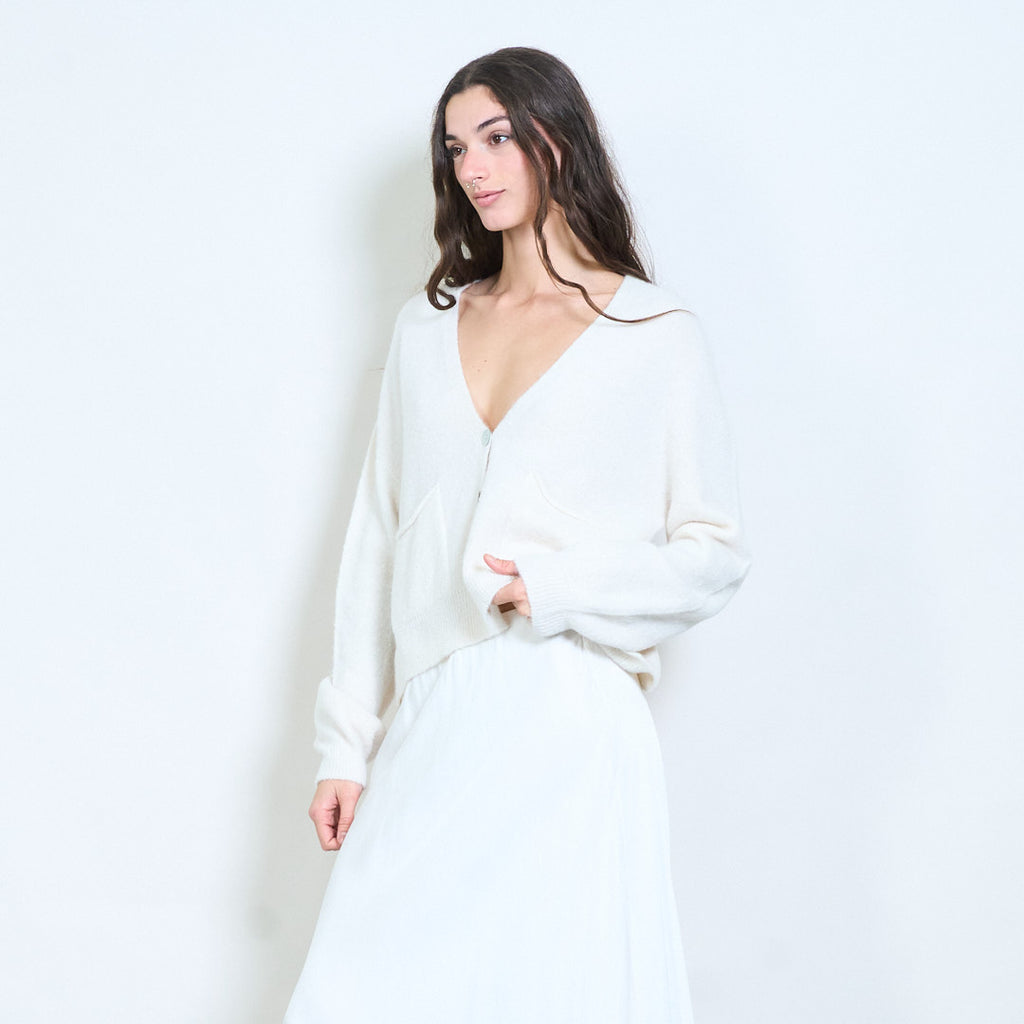 - 采用柔软 V 领设计,增添女性化且易于造型的廓形