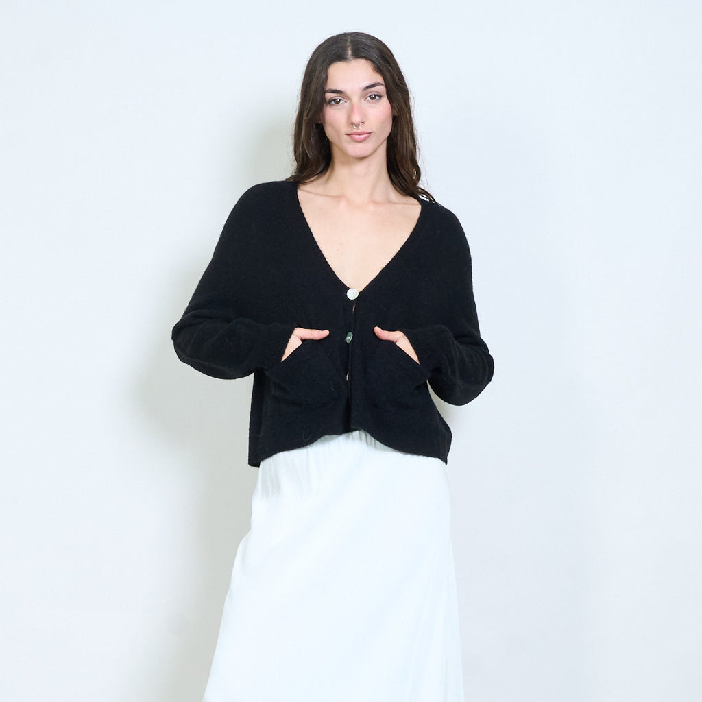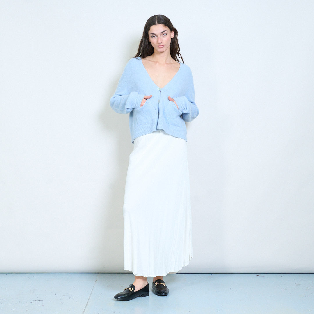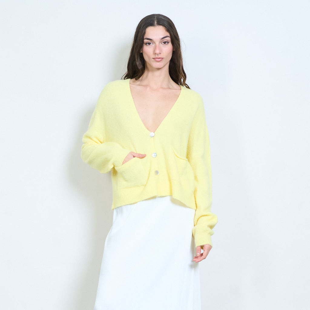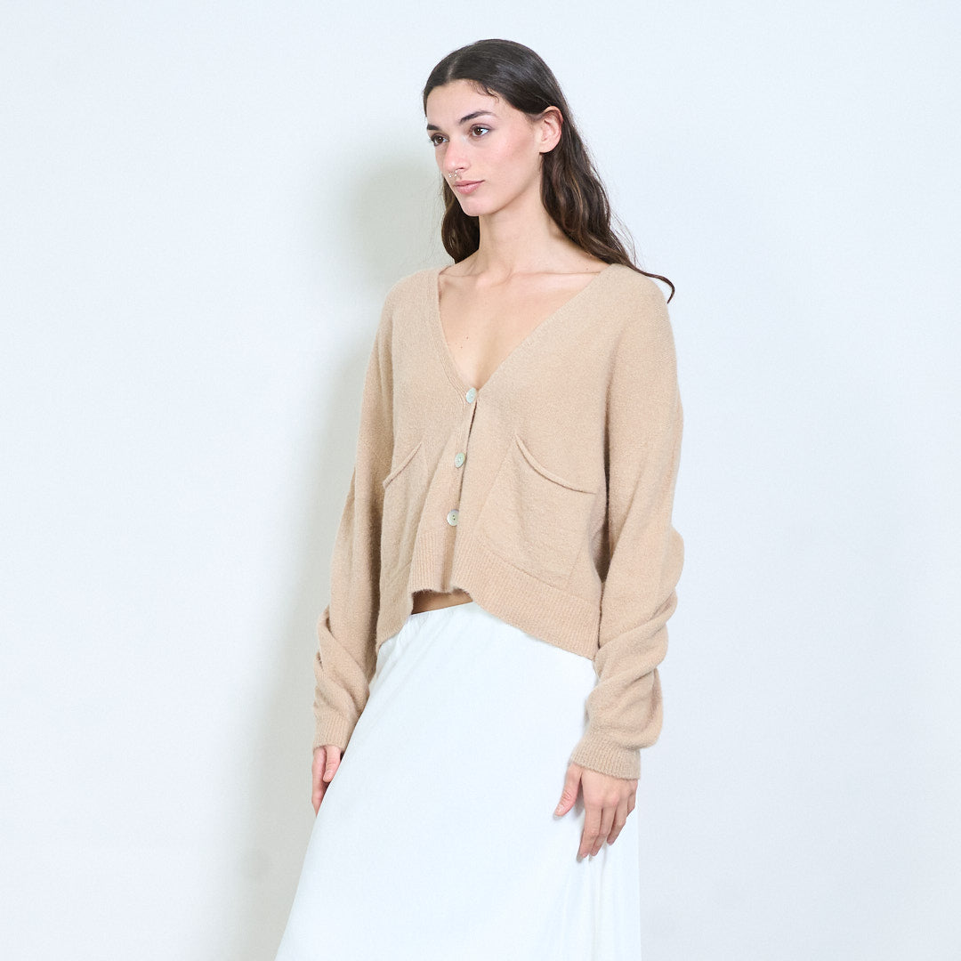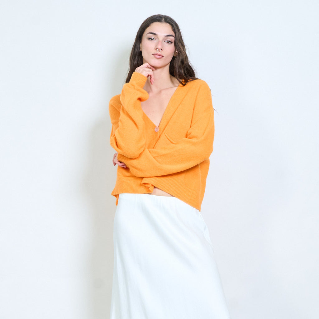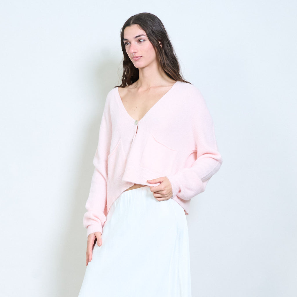 - 采用柔软 V 领设计,增添女性化且易于造型的廓形