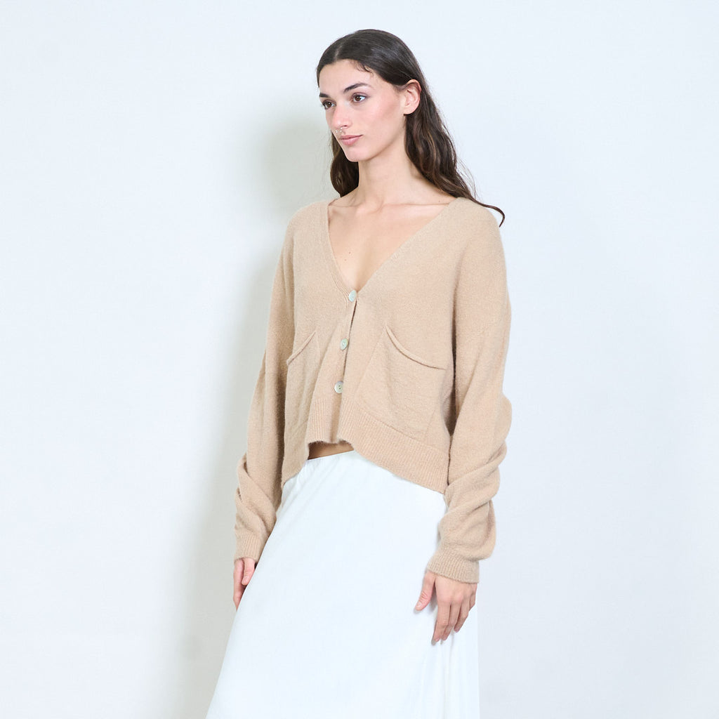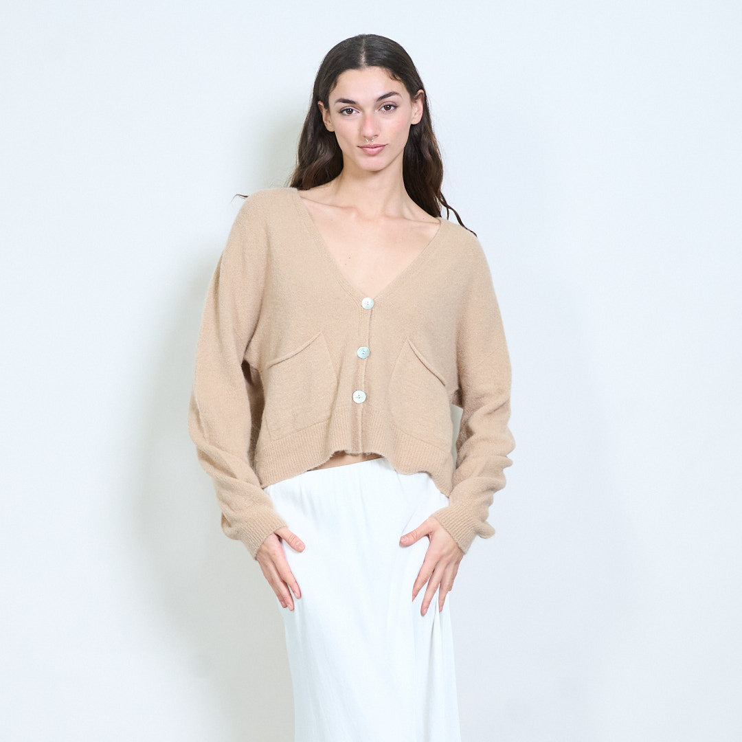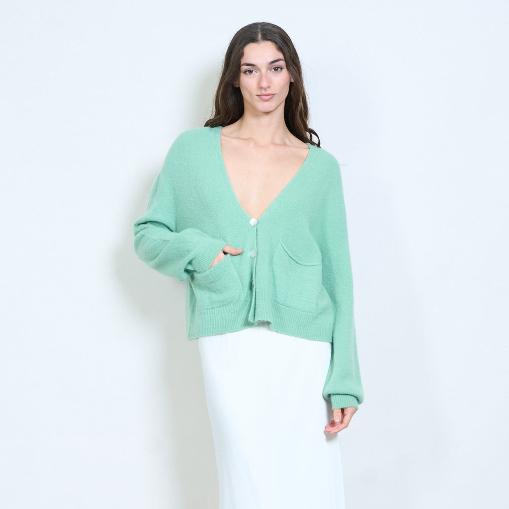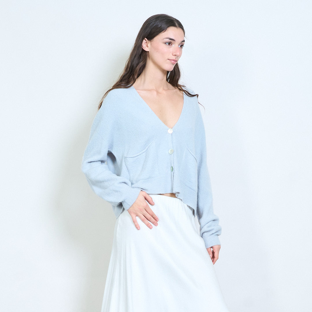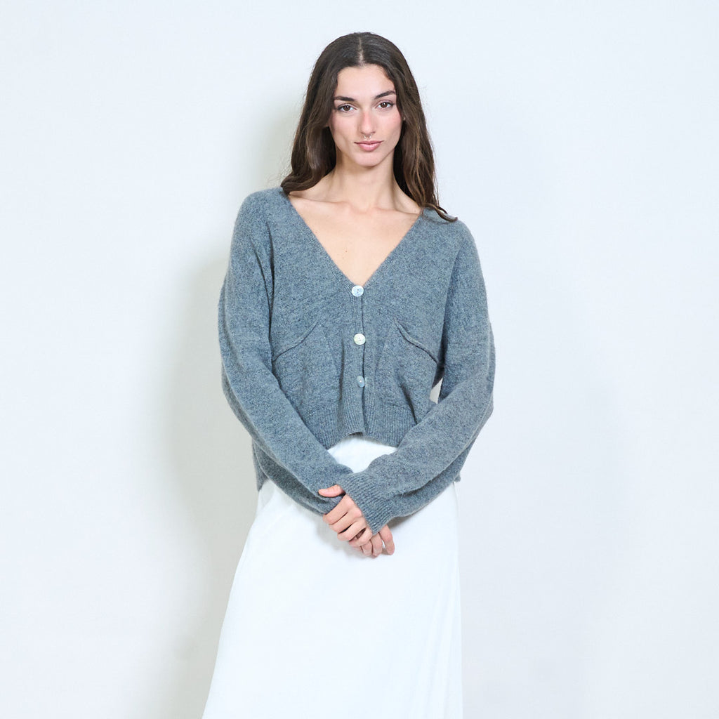 - 采用柔软 V 领设计,增添女性化且易于造型的廓形